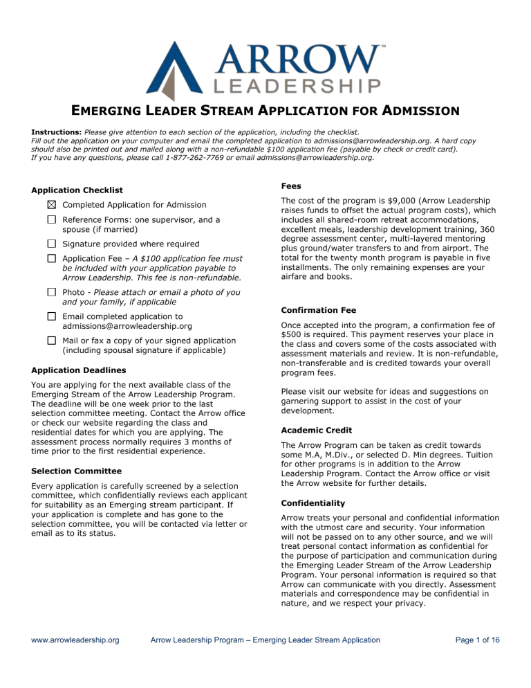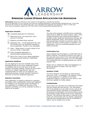 EMERGING LEADER STREAM APPLICATION FOR ADMISSION Instructions: Please give attention to each section of the application, including the checklist. Fill out the application on your computer and email the completed application to [email protected]. A hard copy should also be printed out and mailed along with a non-refundable $100 application fee (payable by check or credit card). If you have any questions, please call 1-877-262-7769 or email [email protected]. Fees Application Checklist Completed Application for Admission Reference Forms: one supervisor, and a spouse (if married) Signature provided where required Application Fee – A $100 application fee must be included with your application payable to Arrow Leadership. This fee is non-refundable. Photo - Please attach or email a photo of you and your family, if applicable Email completed application to [email protected] Mail or fax a copy of your signed application (including spousal signature if applicable) Application Deadlines You are applying for the next available class of the Emerging Stream of the Arrow Leadership Program. The deadline will be one week prior to the last selection committee meeting. Contact the Arrow office or check our website regarding the class and residential dates for which you are applying. The assessment process normally requires 3 months of time prior to the first residential experience. Selection Committee Every application is carefully screened by a selection committee, which confidentially reviews each applicant for suitability as an Emerging stream participant. If your application is complete and has gone to the selection committee, you will be contacted via letter or email as to its status. www.arrowleadership.org The cost of the program is $9,000 (Arrow Leadership raises funds to offset the actual program costs), which includes all shared-room retreat accommodations, excellent meals, leadership development training, 360 degree assessment center, multi-layered mentoring plus ground/water transfers to and from airport. The total for the twenty month program is payable in five installments. The only remaining expenses are your airfare and books. Confirmation Fee Once accepted into the program, a confirmation fee of $500 is required. This payment reserves your place in the class and covers some of the costs associated with assessment materials and review. It is non-refundable, non-transferable and is credited towards your overall program fees. Please visit our website for ideas and suggestions on garnering support to assist in the cost of your development. Academic Credit The Arrow Program can be taken as credit towards some M.A, M.Div., or selected D. Min degrees. Tuition for other programs is in addition to the Arrow Leadership Program. Contact the Arrow office or visit the Arrow website for further details. Confidentiality Arrow treats your personal and confidential information with the utmost care and security. Your information will not be passed on to any other source, and we will treat personal contact information as confidential for the purpose of participation and communication during the Emerging Leader Stream of the Arrow Leadership Program. Your personal information is required so that Arrow can communicate with you directly. Assessment materials and correspondence may be confidential in nature, and we respect your privacy. Arrow Leadership Program – Emerging Leader Stream Application Page 1 of 16 Contact Information If you have any questions, please contact us: USA Arrow Leadership P.O. Box 1243 Blaine, WA 98231-1243 Canada Arrow Leadership Unit D, 2609 Progressive Way Abbotsford, BC V2T 6H8 Phone 1-877-262-7769 Fax (604) 864-6493 Email [email protected] Website www.arrowleadership.org www.arrowleadership.org Arrow Leadership Program – Emerging Leader Stream Application Page 2 of 16 APPLICATION FOR ADMISSION Mr. NAME Mrs. Miss Ms. Dr. First / Given name: ______ Other surnames: Preferred name: Street address: City: State/Province: Home phone: WORK Other Last / Family name: Middle name(s): HOME Rev. Country: Home fax: Position Title: Zip/Postal Code: Home email: Organization: Street address: City: State/Province: Work phone: Country: Work fax: Zip/Postal Code: Work email: Work Website: Personal cell phone: BIRTHDATE & CITIZENSHIP I wish to receive Arrow correspondence at: Work Home Birth date (YYYY-MM-DD): _____ Age: Sex: Female / Male Citizenship: Do you have a current passport? Yes / No *Arrow recommends that you ensure you have a passport that does not expire until at least six months following the last residential component of your Arrow program. MARITAL & FAMILY STATUS CLASS DESIRED Married Single Children: Name: _Age: Name: Age: Divorced Name: Widowed Spouse's Name: __Age: Name: Age: Name: Name: Age: Age: 36th Class – Begins June 2013 38th Class – Begins June 2014 ADDITIONAL Jacket size: INFORMATION S M L XL XXL PROGRAM CONNECTION How did you hear about the Arrow Leadership Program? CREDIT Are you interested in Masters or Doctor of Ministry credit?* *See note on checklist for details Who, if anyone, recommended that you apply? www.arrowleadership.org Yes Arrow Leadership Program – Emerging Leader Stream Application No Page 3 of 16 APPLICATION FOR ADMISSION CONTINUED CURRENT EMPLOYMENT Size of Ministry Staff and Church (if applicable): Job Title: Briefly describe this ministry role: Ordained Licensed to the ministry Where: By Whom: Denominational Affiliation: Name of Home Church (for those in para-church ministries): Are you currently under investigation/discipline by your church, denomination or civil authorities? Yes* No *If yes, please elaborate further on a separate page. EMPLOYMENT EXPERIENCE List all relevant employment history (most recent first): Organization/Ministry Location Position/Responsibilities Dates EDUCATION Post-Secondary Education Institution Location Grad Year Degree/Major List relevant seminars or other training programs you have attended in the last 5 years: