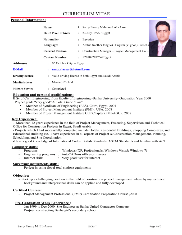 CURRICULUM VITAE Personal Information: Name : Samy Fawzy Mahmoud AL-Aaser Date/ Place of birth : 23 July, 1975 / Egypt Nationality : Egyptian Languages : Arabic (mother tongue) –English (v. good)-French (little) Current Position : Construction Manager – Project Management Co. – Egypt. Contact Number : +201092877669Egypt Addresses : 6th October City – Egypt E-Mail : [email protected] Driving license : Valid driving license in both Egypt and Saudi Arabia Marital status : Married+2 child Military Service : Completed Education and personal qualifications: B.Sc.of Civil Engineering, from faculty of Engineering -Banha University- Graduation Year 2000 Project grade “very good” & Total Grade “Fair” Member of Syndicate of Engineering (EES), Cairo, Egypt. 2001 Member of Project Management Institute (PMI) , USA, 2008 Member of Project Management Institute Gulf Chapter (PMI-AGC) , 2008 Key Experience: - More than 12 years experience in the field of Project Management, Executing, Supervision and Technical Office for Construction Projects in Egypt, Saudi Arabia - Projects which I had successfully completed include Hotels, Residential Buildings, Shopping Complexes, and Educational Building etc. I have experience in all aspects of Project & Construction Management, Planning, Scheduling, and Site Coordination. -Have a good knowledge of International Codes, British Standards, ASTM Standards and familiar with ACI Computer skills: - Programs : Windows (XP. Professionals, Windows Vista& Windows 7) - Engineering programs : AutoCAD-ms office-primavera - Internet skills : Very good user for internet Surveying instruments skills: - Perfect in using (level-total station) equipments Objective: - Seeking a challenging position in the field of construction project management where by my technical background and interpersonal skills can be applied and fully developed Certified Courses: - Project Management Professional (PMP) Certification Preparation Course ,2008 Pre-Graduation Work Experience : - Jan 1999 to Dec 2000 Site Engineer at Banha United Contractor Company Project: constructing Banha girl's secondary school. Samy Fawzy M. EL-Aaser 02/08/17 Page 1 of 5 Professional History Feb.2012 up to Date Egyptian Canadian Project Managers (EGYCAN) (Grand Heights Compound – Green Built -6th of October –Egypt ) (Phase I – Infrastructure Work ) Scope of work: Assisting the Project Manager in Managing the project crew (designers, consultant and contractor) , Coordinating with designers for any missing information needed , Follow up the work progress on site. Monitor day to day work according to project time schedule , Preparing and Checking the monthly invoice and submitting to Employer with a follow up for paying to contractor , Randomly inspection for work executed & material delivered to insure the quality and Attending and issuing Minuets of all project meetings (Progress, Quality, Safety ,Planning and any other needed meetings) Project Description : Construction of infrastructure work of around 3,800,000 m2 (900Feddans)in the green built in 6th October city the work contains Irrigation, Sewage, Storm Water Networks including Tanks ,valve champers, manholes……etc. Project Directory : Employer :KUWADICO Project Manager :Egyptian –Canadian Project Managers (EGYCAN) Engineer :Engineering Consulting Group (ECG) Infrastructure Design Consultant : AAW Consulting Engineers Master Planning Lead Consultant :EHAF Consultant Office Contractor :ORASCOM CONSTRUCTION General : Phase I Amount : 247,000,000 EGP All Project Estimated Amount :1,000,000,000 EGP Project Period :22 months Job Title: Construction Manager / Project Coordinator. Samy Fawzy M. EL-Aaser 02/08/17 Page 2 of 5 Dec.2009 toFeb.2012 : Makro Cash& Carry Egypt (Salam Store& Qalioob Store ) Scope of work: Managing the project crew (consultant & contractors) and follow up all the construction stages& Handing over the stores to the operation department. Reporting to MCCI Head Of Engineering about any deviation in the project track to be sure that project will be handed over As per contract condition Project Description : Unique mega store Consists of 10000m2 steel structural building(the store) + 25000m2 as parking area & service area Essential Duties and Responsibilities include the following: Prepare design brief for all new stores according to standards Coordinate with the designers and provide them with the required information needed for the store design ( Mall Manual, as built drawings and shop requirements) Coordinate with the mall management as well as the designers until the concept drawings approved. Appoint contractors (construction, furniture and flooring) for the new projects. Work on the quotations of the contractor according to the budget, and get the approval of the MCCI Head of Engineering. Follow up the work progress on site and assure the projects to be completed on time. Managing the fit out work &Take over the store from the contractors and prepare signage. Hand over the store to the operation and coordinate with the other departments for the store opening. Auditing, controlling Contractors invoices and follow up Contractors’ payments with our accounting department. Auditing and controlling the contractors work quality. Working on the municipalities' approvals to start work on sites. REPORTS: submit the following reports to the MCCI Head Of Engineering, Work progress reports for each project (weekly), Work flow reports for all the projects under construction (weekly) and Other Reports as requested. Project Directory : Employer :MAKRO CASH AND CARRY EGYPT Engineer :MA Consultant Civil Contractor :DETAC Electromechanical Contractor : SIEMENS , ECO, Experts and delta General : Samy Fawzy M. EL-Aaser Location Salam City& Cairo Alex agriculture road - Cairo- Egypt Estimated Budget for each store 150,000,000 EGP Project Period : 8 months for each store The job title: (Project Manager-Owner representative) 02/08/17 Page 3 of 5 Nov