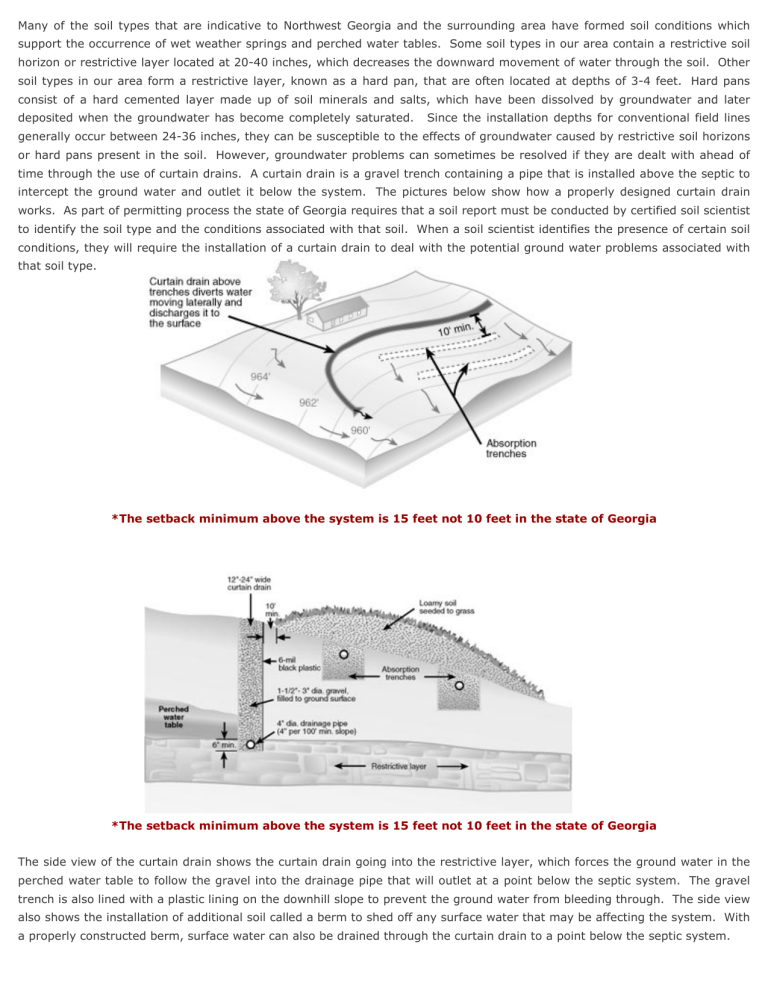 Many of the soil types that are indicative to Northwest Georgia and the surrounding area have formed soil conditions which support the occurrence of wet weather springs and perched water tables. Some soil types in our area contain a restrictive soil horizon or restrictive layer located at 20-40 inches, which decreases the downward movement of water through the soil. Other soil types in our area form a restrictive layer, known as a hard pan, that are often located at depths of 3-4 feet. Hard pans consist of a hard cemented layer made up of soil minerals and salts, which have been dissolved by groundwater and later deposited when the groundwater has become completely saturated. Since the installation depths for conventional field lines generally occur between 24-36 inches, they can be susceptible to the effects of groundwater caused by restrictive soil horizons or hard pans present in the soil. However, groundwater problems can sometimes be resolved if they are dealt with ahead of time through the use of curtain drains. A curtain drain is a gravel trench containing a pipe that is installed above the septic to intercept the ground water and outlet it below the system. The pictures below show how a properly designed curtain drain works. As part of permitting process the state of Georgia requires that a soil report must be conducted by certified soil scientist to identify the soil type and the conditions associated with that soil. When a soil scientist identifies the presence of certain soil conditions, they will require the installation of a curtain drain to deal with the potential ground water problems associated with that soil type. *The setback minimum above the system is 15 feet not 10 feet in the state of Georgia *The setback minimum above the system is 15 feet not 10 feet in the state of Georgia The side view of the curtain drain shows the curtain drain going into the restrictive layer, which forces the ground water in the perched water table to follow the gravel into the drainage pipe that will outlet at a point below the septic system. The gravel trench is also lined with a plastic lining on the downhill slope to prevent the ground water from bleeding through. The side view also shows the installation of additional soil called a berm to shed off any surface water that may be affecting the system. With a properly constructed berm, surface water can also be drained through the curtain drain to a point below the septic system.