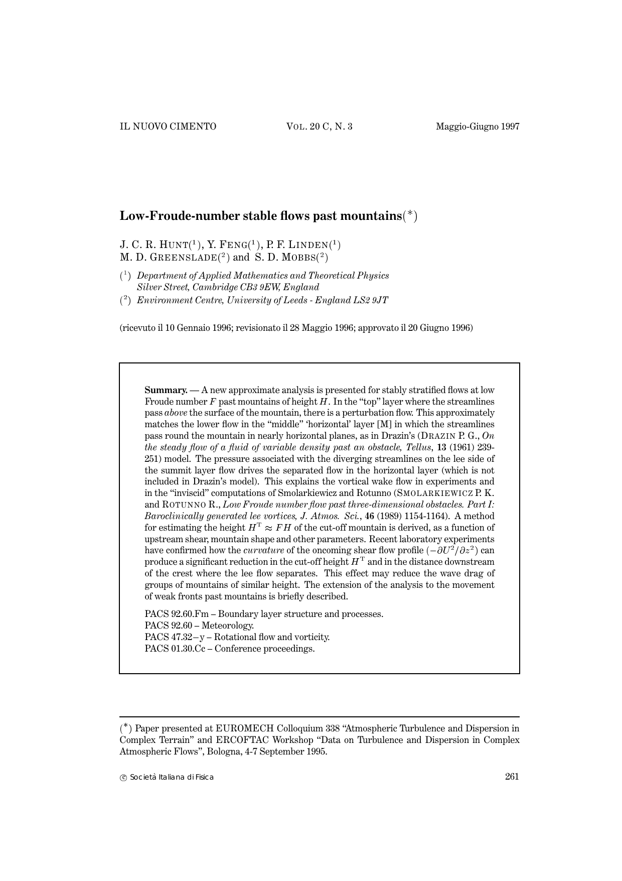 IL NUOVO CIMENTO V OL . 20 C, N. 3 Maggio-Giugno 1997 Low-Froude-number stable flows past mountains() () () () () J. C. R. H UNT 1 , Y. F ENG 1 , P. F. L INDEN 1 M. D. G REENSLADE 2 and S. D. M OBBS 2 () 1 ( ) Department of Applied Mathematics and Theoretical Physics Silver Street, Cambridge CB3 9EW, England 2 ( ) Environment Centre, University of Leeds - England LS2 9JT (ricevuto il 10 Gennaio 1996; revisionato il 28 Maggio 1996; approvato il 20 Giugno 1996) Summary. — A new approximate analysis is presented for stably stratified flows at low Froude number F past mountains of height H . In the “top” layer where the streamlines pass above the surface of the mountain, there is a perturbation flow. This approximately matches the lower flow in the “middle” ‘horizontal’ layer [M] in which the streamlines pass round the mountain in nearly horizontal planes, as in Drazin’s (D RAZIN P. G., On the steady flow of a fluid of variable density past an obstacle, Tellus, 13 (1961) 239251) model. The pressure associated with the diverging streamlines on the lee side of the summit layer flow drives the separated flow in the horizontal layer (which is not included in Drazin’s model). This explains the vortical wake flow in experiments and in the “inviscid” computations of Smolarkiewicz and Rotunno (S MOLARKIEWICZ P. K. and R OTUNNO R., Low Froude number flow past three-dimensional obstacles. Part I: Baroclinically generated lee vortices, J. Atmos. Sci., 46 (1989) 1154-1164). A method for estimating the height H T F H of the cut-off mountain is derived, as a function of upstream shear, mountain shape and other parameters. Recent laboratory experiments have confirmed how the curvature of the oncoming shear flow profile ( @U 2 =@z 2 ) can produce a significant reduction in the cut-off height H T and in the distance downstream of the crest where the lee flow separates. This effect may reduce the wave drag of groups of mountains of similar height. The extension of the analysis to the movement of weak fronts past mountains is briefly described. ; PACS 92.60.Fm – Boundary layer structure and processes. PACS 92.60 – Meteorology. PACS 47.32 y – Rotational flow and vorticity. PACS 01.30.Cc – Conference proceedings. ; ( ) Paper presented at EUROMECH Colloquium 338 “Atmospheric Turbulence and Dispersion in Complex Terrain” and ERCOFTAC Workshop “Data on Turbulence and Dispersion in Complex Atmospheric Flows”, Bologna, 4-7 September 1995. c Società Italiana di Fisica 261 262 J. C. R. HUNT, Y. FENG, P. F. LINDEN ETC. 1. – Introduction The importance of mesoscale topographic effects has long been recognised by meteorologists (see, for example, the review by [1]). If we accept that the influence of a mountain or mountain range on the weather and general circulation is generally proportional to its size, then the importance of low Froude number flow effects, where Froude number is inversely proportional to mountain height (see below), can readily be appreciated. Under general atmospheric conditions, mountains over about 1 km in height are frequently associated with low Froude number flows, while the flow associated with mountains above about 2 km in height is in the low Froude number regime most of the time. But only recently have low Froude number effects begun to be represented in forecasting models (e.g. [2]), though there are some outstanding questions about the effects of finite Rossby numbers in these flows [3]. We consider steady, stably stratified flow (buoyancy frequency profile N z , with representative value N0 , mean flow profile U z in the x-direction, with a representative value of velocity at the hill top of U0 ) past an isolated three-dimensional mountain of height H and half-width L under the conditions that the Froude number is small (F U0 =N0 H ) and that the Reynolds number is large (Re U0 L= , = kinematic viscosity). The basic structure of the flow, as confirmed by laboratory experiments and numerical simulations, is described in Sect. 2 below, together with some theoretical considerations which have been aired previously. In Sect. 3 a partial explanation of the shape of the wake as observed experimentally by Sysoeva and Chashechkin [4] is put forward. In Sect. 4 linear theory is used to gain a quantitative result connecting changes in the curvature of the mean flow profile with details of the structure of the flow. Section 5 summarises unpublished work of Greenslade, Hunt and Mobbs [5] in which the model is extended to allow for a horizontally inhomogeneous flow, as occurs in the atmosphere at a front. Our conclusions are presented in Sect. 6. () () = 1 = 1 2. – Structure of the flow We examine the geophysically relevant parameter regime in which the Froude number is small (1) F NU0H 1 R U0L 1: 0 and the Reynolds number is large (2) e A mathematically rigorous solution has not been achieved at the present time, nor is one likely to be. Furthermore, no approximate solution exists which is self-consistent and which explains all the observed features of the model (though the equations of motion have been integrated numerically). Our aim here is to review progress towards a suitable approximate solution. The division of the flow into three main regions has been described by Greenslade [6, 7], see fig. 1. In the middle region [M], which extends over most of the depth of the mountain, air must flow around the mountain. Only in the top (or summit) region [T] (and above) does the flow rise over the mountain. A third region, the base region [B], lies beneath [M] so here again the air must flow around the mountain. (In exceptional model 263 LOW-FROUDE-NUMBER STABLE FLOWS ETC. Fig. 1. – Schematic of upwind/side view of low Froude number flow over three-dimensional mountain. cases such as a hemispherical mountain, [B] effectively does not exist.) The distinguishing property of both [T] and [B] is that the weak vertical motions are dynamically significant within these