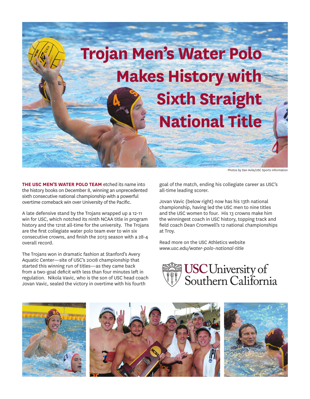 Trojan Men’s Water Polo Makes History with Sixth Straight National Title Photos by Dan Avila/USC Sports Information THE USC MEN’S WATER POLO TEAM etched its name into the history books on December 8, winning an unprecedented sixth consecutive national championship with a powerful overtime comeback win over University of the Pacific. A late defensive stand by the Trojans wrapped up a 12-11 win for USC, which notched its ninth NCAA title in program history and the 121st all-time for the university. The Trojans are the first collegiate water polo team ever to win six consecutive crowns, and finish the 2013 season with a 28-4 overall record. The Trojans won in dramatic fashion at Stanford’s Avery Aquatic Center—site of USC’s 2008 championship that started this winning run of titles—as they came back from a two-goal deficit with less than four minutes left in regulation. Nikola Vavic, who is the son of USC head coach Jovan Vavic, sealed the victory in overtime with his fourth goal of the match, ending his collegiate career as USC’s all-time leading scorer. Jovan Vavic (below right) now has his 13th national championship, having led the USC men to nine titles and the USC women to four. His 13 crowns make him the winningest coach in USC history, topping track and field coach Dean Cromwell’s 12 national championships at Troy. Read more on the USC Athletics website www.usc.edu/water-polo-national-title
