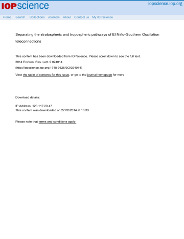 Home Search Collections Journals About Contact us My IOPscience Separating the stratospheric and tropospheric pathways of El Niño–Southern Oscillation teleconnections This content has been downloaded from IOPscience. Please scroll down to see the full text. 2014 Environ. Res. Lett. 9 024014 (http://iopscience.iop.org/1748-9326/9/2/024014) View the table of contents for this issue, or go to the journal homepage for more Download details: IP Address: 128.117.20.47 This content was downloaded on 27/02/2014 at 18:33 Please note that terms and conditions apply. Environmental Research Letters Environ. Res. Lett. 9 (2014) 024014 (9pp) doi:10.1088/1748-9326/9/2/024014 Separating the stratospheric and tropospheric pathways of El Niño–Southern Oscillation teleconnections Amy H Butler1,2 , Lorenzo M Polvani3,4,5 and Clara Deser6 1 University of Colorado/Cooperative Institute for Research in Environmental Sciences, Boulder, CO, USA National Oceanic and Atmospheric Administration/Earth System Research Laboratory/Chemical Sciences Division, Boulder, CO, USA 3 Department of Applied Physics and Applied Mathematics, Columbia University, New York, NY, USA 4 Department of Earth and Environmental Sciences, Columbia University, New York, NY, USA 5 Lamont-Doherty Earth Observatory of Columbia University, Palisades, NY, USA 6 National Center for Atmospheric Research, Boulder, CO, USA 2 E-mail: [email protected] Received 5 December 2013, revised 27 January 2014 Accepted for publication 29 January 2014 Published 26 February 2014 Abstract The El Niño–Southern Oscillation (ENSO) is a major driver of Northern Hemisphere wintertime variability and, generally, the key ingredient used in seasonal forecasts of wintertime surface climate. Modeling studies have recently suggested that ENSO teleconnections might involve both a tropospheric pathway and a stratospheric one. Here, using reanalysis data, we carefully distinguish between the two. We first note that the temperature and circulation anomalies associated with the tropospheric pathway are nearly equal and opposite during the warm (El Niño) and cold (La Niña) phases of ENSO, whereas those associated with the stratospheric pathway are of the same sign, irrespective of the ENSO phase. We then exploit this fact to isolate the two pathways. Our decomposition reveals that ENSOs climate impacts over North America are largely associated with the tropospheric pathway, whereas ENSOs climate impacts over the North Atlantic and Eurasia are greatly affected by the stratospheric pathway. The stratospheric pathway, which we here define on the basis of the occurrence of one or more sudden stratospheric warmings in a given winter, and whose signature projects very strongly on the North Atlantic Oscillation, is found to be present 60% of the time during ENSO winters (of either phase): it therefore likely plays an important role in improving seasonal forecasts, notably over the North Atlantic and the Eurasian continent. Keywords: El Niño-Southern Oscillation, stratospheric variability, sudden stratospheric warmings, teleconnections, Eurasian climate S Online supplementary data available from stacks.iop.org/ERL/9/024014/mmedia 1. Introduction precipitation anomalies in the Northern Hemisphere in wintertime: as a consequence, ENSO is a fundamental component of most seasonal climate forecasts in the extratropics. Horel and Wallace (1981) showed that ENSO teleconnections resemble tropospheric Rossby wave trains forced in the tropical Pacific Ocean by slowly evolving anomalous sea surface temperatures (SSTs) via changes in precipitation. Many ENSO induced climate anomalies are, to first order, linear in character, It is well established that El Niño–Southern Oscillation (ENSO) teleconnections cause important temperature and Content from this work may be used under the terms of the Creative Commons Attribution 3.0 licence. Any further distribution of this work must maintain attribution to the author(s) and the title of the work, journal citation and DOI. 1748-9326/14/024014+09$33.00 1 c 2014 IOP Publishing Ltd Printed in the UK Environ. Res. Lett. 9 (2014) 024014 A H Butler et al i.e. their sign reverses as the tropical Pacific SST anomalies change from warm (El Niño) to cold (La Niña). In fact, over the Pacific and North American sectors, ENSO impacts can be largely accounted for with linear wave theory and simple ray tracing in the troposphere (Hoskins and Karoly 1981, Horel and Wallace 1981, Sardeshmukh and Hoskins 1988). We note, however, that over Europe and Asia the precise mechanism for ENSO impacts remains less clear (Greatbatch et al 2004, Toniazzo and Scaife 2006, Brönnimann et al 2007). Because ENSO is a large perturbation of the climate system, it is not surprising that the stratosphere too is affected by anomalous tropical Pacific SSTs. The stratospheric response, however, is richer in character than the tropospheric response. On the one hand, the mean seasonal stratospheric response to ENSO is approximately linear: it is well documented that during El Niño winters the Northern Hemisphere polar vortex is anomalously weak as a consequence of enhanced planetary wave fluxes into the stratosphere (Van Loon and Labitzke 1987), resulting in a warmer stratosphere (Garfinkel and Hartmann 2007), and higher ozone concentrations in the polar regions (Randel et al 2009). Similar but oppositely signed anomalies are observed during La Niña winters, albeit with smaller amplitude (Manzini et al 2006, Garfinkel and Hartmann 2007, Free and Seidel 2009). On the other hand, the extreme stratospheric response to ENSO is highly non-linear. This is clearly seen in the frequency of occurrence of so-called sudden stratospheric warmings (SSWs). During these events, the polar vortex is completely disrupted, the winds reverse from westerly to easterly, and the polar stratosphere warms by tens of degrees within a few days (Charlton and Polvani 2007). One might naı̈vely expect that SS