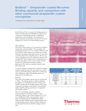 Appli cat i on N ote BioBind™ - Streptavidin coated Microtiter Binding capacity and comparison with other commercial streptavidin coated microplates LCP Research Group, Thermo Electron Oy, Vantaa, Finland In this Technical Note we present the binding capacity of Thermo’s streptavidin coated BioBind microplates and a comparison to the binding capacity of competitors’ streptavidin coated microplates. The uniformity of different manufacturing batches is presented by lot-to-lot binding CV% and lot-to-lot biotin binding capacity. Test method 200 μl FITC-biotin solution (0.25 nmol/ml) was added to streptavidin coated microplates. The microplates were incubated for 60 min at 37 °C on a shaker (900 rpm). 100 μl of the FITC-biotin solution was transferred to a white Microtiter microplate and the fluorescence was measured on Thermo Fluoroskan using filter pair ex. 485 nm / em. 538 nm. The fluorescence was compared to that of a 0.25 nmol/ml FITC-biotin solution that was added directly to the white microplate. In this way the amount of biotin bound to the streptavidin microplate could be determined. The results are expressed as pmol bound FITC-biotin/well. To test the resistance of streptavidin coating for stringent washing conditions, half of the microplates was washed with a 0.1 M NaOH solution, followed by washing steps with a PBS-Tween-buffer. The binding capacity was determined as described above. Results The results of the binding capacity tests are summarized in Table 1. The binding capacity of Thermo BioBind microplates was 25 pmol/well and after washing with NaOH 23 pmol/well. The binding capacity of the tested competitor’s microplates were between 7-19 pmol/well without NaOH-washing and between 5-15 pmol/well after NaOH-washing. The CV% and binding capacities in different manufacturing lots are shown in Figures 1 and 2, respectively. Figure 1 shows biotin binding CV% of 18 lots of BioBind breakable strip microplates. Figure 2 shows the binding capacity of BioBind microplates without NaOH washing and after NaOH washing. The average binding capacity without NaOH-washing step was 26 pmol/well and after NaOH-washing 23 pmol/ well. Thermo BioBind cat. no 95029 293 Competitor 1 Competitor 2 Competitor 3 Warm Cold Binding capacity (pmol/well) 26 Binding capacity after NaOH treatment (pmol/well) 22 15 19 7 Cold Warm 14 15 5 Cold Cold Table 1. Average binding capacity of streptavidin coated clear microplates Lot Lot-to-lot variation Microtiter BioBind (breakable strips, 95029 293) Binding capacity Microtiter BioBind (breakable strips, 95029 293) 40 9 after NaOH washing 7 CV% FITC-biotin pmol/well unwashed 8 6 5 4 3 2 1 0 unwashed 35 after NaOH washing 30 25 20 15 10 5 0 1 2 3 4 5 6 7 8 9 10 11 12 13 14 15 16 17 18 1 2 3 4 5 6 7 8 Lot 9 10 11 12 13 14 15 16 17 18 Lot Figure 1. Biotin binding CV% of 18 lots of BioBind clear breakable strip microplates. Binding capacity Figure 2. Binding capacity of 18 lots of BioBind clear breakable strip microplates. Microtiter BioBind (breakable strips, 95029 293) FITC-biotin pmol/well 40 Cat. no 95 029 263 Product descriptionunwashed Bottom BioBind Strip Assembledafter NaOH washing Flat 95 029 293 BioBind Strip Assembled 20 95 029 273 15 95 029 283 35 30 25 Strip Solid 1x8 Qty/bag 1 Qty/box 5 Flat Breakable 1x8 1 5 White BioBind Strip Assembled Flat Solid 1x8 1 5 Black BioBind Strip Assembled Flat Solid 1x8 1 5 10 5 0 1 2 3 Conclusions 4 5 6 7 8 9 10 11 12 13 14 15 16 17 18 Lot Thermo streptavidin coated BioBind Microtiter microplates showed a high binding capacity and an excellent lot-to-lot consistency. Stringent washing conditions had only a minor effect on the streptavidin coating. thermoscientific.com © 2014 Thermo Fisher Scientific Inc. All rights reserved. All trademarks are the property of Thermo Fisher Scientific Inc. and its subsidiaries. Specifications, terms and pricing are subject to change. Not all products are available in all countries. Please consult your local sales representative for details. ANZ: Australia: 1300 735 292, New Zealand: 0800 933 966; Asia: China Toll-free: 800-810-5118 or 400-650-5118; India: +91 22 6716 2200, India Toll-free: 1 800 22 8374; Japan: +81-3-5826-1616; Other Asian countries: 65 68729717 Europe: Austria: +43 1 801 40 0; Belgium: +32 2 482 30 30; Denmark: +45 4631 2000; France: +33 2 2803 2180; Germany: +49 6184 90 6000, Germany Toll-free: 0800 1-536 376; Italy: +39 02 95059 554; Netherlands: +31 76 571 4440; Nordic/Baltic countries: +358 9 329 10200; Russia/CIS: +7 (812) 703 42 15; Spain/Portugal: +34 93 223 09 18; Switzerland: +41 44 454 12 22; UK/Ireland: +44 870 609 9203 North America: USA/Canada +1 585 586 8800; USA Toll-free: 800 625 4327 South America: USA sales support: +1 585 899 7198 Countries not listed: +49 6184 90 6000 or +33 2 2803 2000 TN-LCP-MICROTITER02-0714 Appli cat i on N ote 10