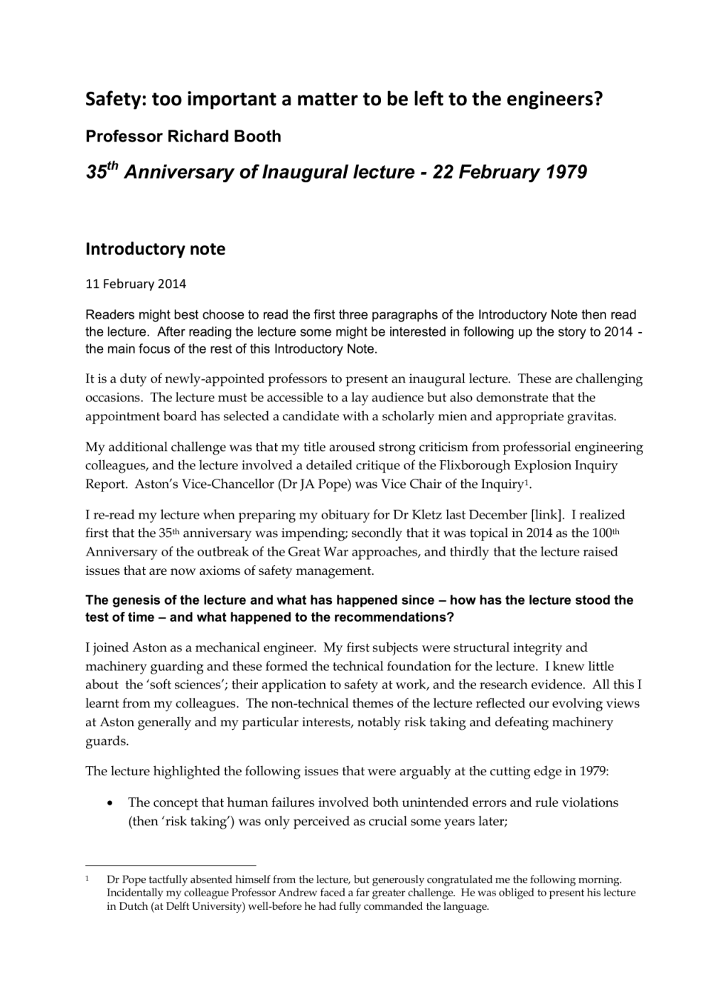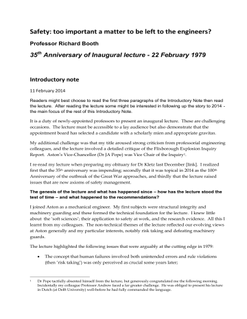 Safety: too important a matter to be left to the engineers? Professor Richard Booth 35th Anniversary of Inaugural lecture - 22 February 1979 Introductory note 11 February 2014 Readers might best choose to read the first three paragraphs of the Introductory Note then read the lecture. After reading the lecture some might be interested in following up the story to 2014 the main focus of the rest of this Introductory Note. It is a duty of newly-appointed professors to present an inaugural lecture. These are challenging occasions. The lecture must be accessible to a lay audience but also demonstrate that the appointment board has selected a candidate with a scholarly mien and appropriate gravitas. My additional challenge was that my title aroused strong criticism from professorial engineering colleagues, and the lecture involved a detailed critique of the Flixborough Explosion Inquiry Report. Aston’s Vice-Chancellor (Dr JA Pope) was Vice Chair of the Inquiry1. I re-read my lecture when preparing my obituary for Dr Kletz last December [link]. I realized first that the 35th anniversary was impending; secondly that it was topical in 2014 as the 100th Anniversary of the outbreak of the Great War approaches, and thirdly that the lecture raised issues that are now axioms of safety management. The genesis of the lecture and what has happened since – how has the lecture stood the test of time – and what happened to the recommendations? I joined Aston as a mechanical engineer. My first subjects were structural integrity and machinery guarding and these formed the technical foundation for the lecture. I knew little about the ‘soft sciences’; their application to safety at work, and the research evidence. All this I learnt from my colleagues. The non-technical themes of the lecture reflected our evolving views at Aston generally and my particular interests, notably risk taking and defeating machinery guards. The lecture highlighted the following issues that were arguably at the cutting edge in 1979: 1 The concept that human failures involved both unintended errors and rule violations (then ‘risk taking’) was only perceived as crucial some years later; Dr Pope tactfully absented himself from the lecture, but generously congratulated me the following morning. Incidentally my colleague Professor Andrew faced a far greater challenge. He was obliged to present his lecture in Dutch (at Delft University) well-before he had fully commanded the language. The importance of risk assessment (then ‘procedures to identify and control dangers’) was emphasised; enshrined in legislation much later; The need for accident investigators to pursue the underlying and root causes (then ‘preconditions’); The phrase ‘technical, behavioural and procedural aspects of safety’ may not have been in common usage at the time. Together with Law and Occupational Health they (with variations in exact wording) were from the outset the five modules of Aston courses and carried through into NEBOSH; The following quotation continues to be apposite “I suspect that some practitioners in the risk equation business become so intoxicated by the elegance of their mathematical analysis that they fail to recognise the vast potential for errors in their basic assumptions and in their raw data”. My theme was that “safety is too important a matter to be left to any key professional group, whether engineers, doctors, chemists, psychologists, lawyers or accountants.” In 1979 these professional groups thought themselves as having ‘ownership’ of safety in their domains. Many still do. But in 2014 safety practitioners should be added to the list. If I was to give the lecture again it would have the title “Safety: too important a matter to be left to the safety professionals”. In 1979 safety professionals were an endangered species. Now they play a dominant role in risk decision-making and many perceive that their domain is the whole field, encompassing ownership of legislation, management systems, human factors, tolerability of risk, as well as technical controls. And case studies of some contemporary accidents and disasters could have pointed to the shortcomings of safety practitioners (some in regulatory bodies) in much the same way as I castigated engineers 35 years ago. The presumptions I made that First World War generals lacked strategic insights and were incompetent has been challenged by modern historians (although the tensions between the generals and politicians are historical fact). On their terms my basic analogy to the First World War is wrong. The arguments are that a long period of attritional warfare on the primary battlefield is now accepted as inevitable before a final victory was to be won2. The resources devoted to ‘side shows’ impeded the main effort on the Western Front. The learning curve of strategic and tactical methods to break through ‘impregnable’ trench lines could barely have been more rapid, and by 1917 the rapidly-formed citizen British Empire army was just the match of the German army, and by August 1918 by far the most effective army on the Western Front. The ‘interference’ of the politicians was, it is now argued, often counter-productive, and prolonged the duration of the War. So ‘war: too important a matter to the generals’, the axiom that underpinned the lecture has, paradoxically been the part that has least well withstood the test of time. But while the military analogy is now challenged by military historians, the 2 The Second World War was won by a prolonged attritional battles on the Eastern Front and in bombing campaigns with vastly greater casualties than in the First War. During the Cold War the West, for political reasons, down-played the Soviet Union’s dominant contribution to final victory. I have added a footnote in the main text developing some of these points. 2 argument that safety should not be dominated by any professional group is if anything