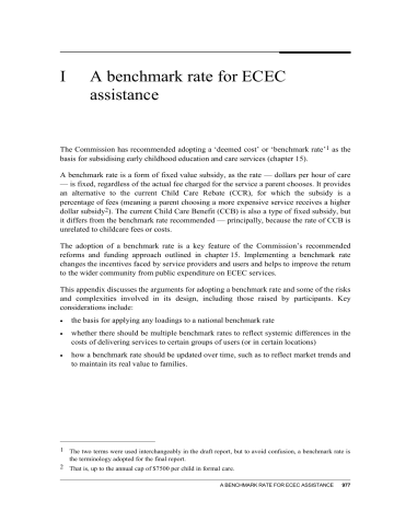 I A benchmark rate for ECEC assistance The Commission has recommended adopting a ‘deemed cost’ or ‘benchmark rate’1 as the basis for subsidising early childhood education and care services (chapter 15). A benchmark rate is a form of fixed value subsidy, as the rate — dollars per hour of care — is fixed, regardless of the actual fee charged for the service a parent chooses. It provides an alternative to the current Child Care Rebate (CCR), for which the subsidy is a percentage of fees (meaning a parent choosing a more expensive service receives a higher dollar subsidy2). The current Child Care Benefit (CCB) is also a type of fixed subsidy, but it differs from the benchmark rate recommended — principally, because the rate of CCB is unrelated to childcare fees or costs. The adoption of a benchmark rate is a key feature of the Commission’s recommended reforms and funding approach outlined in chapter 15. Implementing a benchmark rate changes the incentives faced by service providers and users and helps to improve the return to the wider community from public expenditure on ECEC services. This appendix discusses the arguments for adopting a benchmark rate and some of the risks and complexities involved in its design, including those raised by participants. Key considerations include: the basis for applying any loadings to a national benchmark rate whether there should be multiple benchmark rates to reflect systemic differences in the costs of delivering services to certain groups of users (or in certain locations) how a benchmark rate should be updated over time, such as to reflect market trends and to maintain its real value to families. 1 The two terms were used interchangeably in the draft report, but to avoid confusion, a benchmark rate is the terminology adopted for the final report. 2 That is, up to the annual cap of $7500 per child in formal care. A BENCHMARK RATE FOR ECEC ASSISTANCE 977 I.1 A benchmark rate and the subsidy paid to families How would the benchmark rate affect the subsidy paid to families? The amount of the subsidy for mainstream services received by families — that is, assistance provided in the form of the recommended Early Care and Learning Subsidy (ECLS) — is a direct function of the determined benchmark rate. Specifically, a benchmark rate represents an upper bound on ECLS paid to families, since the amount of a subsidy families receive for each child is equivalent to their family subsidy rate (which depends on household income) applied to the benchmark rate (figure I.1). Figure I.1 The relationship between a benchmark rate and an Early Care and Learning Subsidy Determine the benchmark rate Step 1: Step 2: Step 3: Choose estimation approach OPTIONS to adjust benchmark rate over time OPTIONS to adjust benchmark rate to reflect efficient differences in costs Efficient price Based on: cost model OR Automatic indexation Benchmark price Based on: market prices Multiple benchmark rates Based on: Actual price or cost changes OR OR Pre-agreed escalation formula Based on: anticipated cost or price changes Single benchmark rate Based on: Type of service? Location of service? Age of child? For profit v. not-for-profit? Additional needs? Benchmark rate ($/hour of care) Family characteristics: Household income test: 20 to 85 % of Benchmark rate ECLS paid to individual families ($/hour of care) For example, under the Commission’s proposal, ECLS for eligible families earning less than $60 000 per year would be 85 per cent of the benchmark rate (for each child in care), while eligible families with a household income of more than $250 000 would receive 20 per cent of this rate (chapter 15). This means that families with the same household income and other relevant circumstances will generally receive the same dollar subsidy per hour of childcare, regardless of the fees charged at the service they have chosen — hence, improving horizontal equity. 978 CHILDCARE AND EARLY CHILDHOOD LEARNING Participant views on the benchmark rate approach The inquiry draft report put forward two options for estimating a benchmark rate. The first approach involved benchmarking observed market prices — for example, a benchmark rate could be set according to the median market price or some other percentile along the distribution of fees charged — the ‘benchmark price’. The second approach involved identifying the efficient price of ECEC services by modelling the long-run cost of delivering a service that satisfies the National Quality Standard (NQS). The Commission’s draft report proposed implementing a benchmark rate by initially adopting an efficient price approach and moving to a benchmark price within three years. Submissions from participants raised concerns about the impacts from adopting a benchmark rate on childcare affordability for users (subs DR567; DR689; DR875; DR614), and urged the Commission to ensure a benchmark rate considers differences in underlying cost across, for example, care types and locations (subs DR837; DR508; DR839; DR755). As shown in figure I.1, it is possible to apply adjustments to a single benchmark rate (or to set multiple benchmark rates) that reflect different user or service characteristics. Several providers raised the issue of how a benchmark rate would affect the viability of some services, especially in remote areas and in the high cost central business areas of Sydney and Melbourne (sub. DR593; sub. DR574). For example, UTS Child Care expressed concern that inner city families, and NSW families in general, would face a higher gap than families in other locations unless: … the deemed cost of care takes into account the higher cost of service provision in NSW, caused by higher land costs (especially in Sydney city, inner city and inner west where demand is highest and land is most expensive) and long standing higher qualifications and ratio requirements. (sub, DR593, p. 2) The NSW Family Day Care Association was uncertain about 