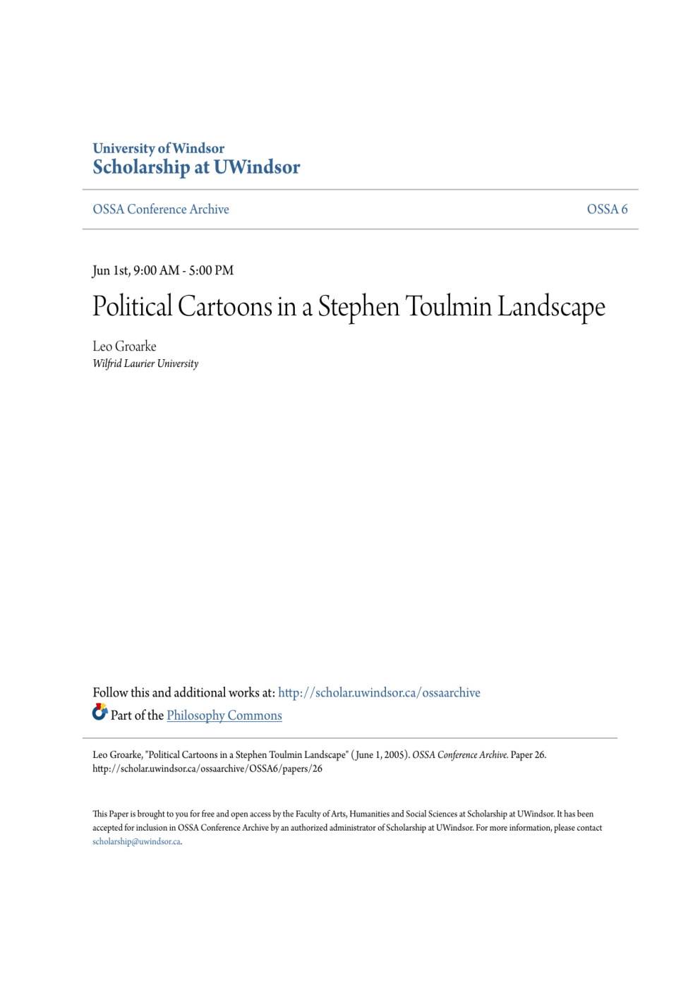 University of Windsor Scholarship at UWindsor OSSA Conference Archive OSSA 6 Jun 1st, 9:00 AM - 5:00 PM Political Cartoons in a Stephen Toulmin Landscape Leo Groarke Wilfrid Laurier University Follow this and additional works at: http://scholar.uwindsor.ca/ossaarchive Part of the Philosophy Commons Leo Groarke, "Political Cartoons in a Stephen Toulmin Landscape" ( June 1, 2005). OSSA Conference Archive. Paper 26. http://scholar.uwindsor.ca/ossaarchive/OSSA6/papers/26 This Paper is brought to you for free and open access by the Faculty of Arts, Humanities and Social Sciences at Scholarship at UWindsor. It has been accepted for inclusion in OSSA Conference Archive by an authorized administrator of Scholarship at UWindsor. For more information, please contact [email protected]. Political Cartoons in a Stephen Toulmin Landscape LEO GROARKE Office of the Dean Wilfrid Laurier University Brantford, Ontario Canada N3T 2Y3 [email protected] KEY WORDS: Stephen Toulmin, visual arguments, political cartoons ABSTRACT: Fifteen years ago, those who studied arguments assumed that they are sets of verbal claims. Since that time, ‘visual’ arguments have emerged as an important topic in the theory of argument. In the course of this development, a number of commentators have made important contributions to our understanding of such arguments (see, e.g., Shelley 1996; Shelley 2003; Blair 1996; Blair 2003; Gilbert 1997; Groarke 1996; Groarke 2002; Groarke and Tindale 2004; Lunsford, Ruszkiewicz & Walters 2005.). Some other commentators (most notably Johnson 2003) steadfastly reject the suggestion that visual images can be arguments. But even they accept that a satisfactory attempt to understand argument must recognize the pervasive role that visual images play in everyday persuasion, argument POLITICAL CARTOONS IN A STEPHEN TOULMIN LANDSCAPE 187 and debate, and this itself implies the need for an account of argument that recognizes the role that visual images play in these kinds of contexts. The interest in visual argument that characterizes contemporary work on argument befits an age in which technology has made images an increasingly important feature of day-to-day argument. It is in view of this that public argument is frequently framed, defined and fuelled by the images we see on television, in photographs, glossy advertisements and political cartoons, on the World Wide Web, and in promotional, documentary and feature film. In the present paper, I hope to add to the literature on visual argument by showing how the Toulmin model of argument can be applied to visual arguments. By ‘Toulmin model’ I mean the data-warrant account of argument that Stephen Toulmin develops in Chapter III of The Uses of Argument. In this discussion I will, like many commentators in Speech Communication, be using the model as a practical tool in the analysis of arguments. In using the model in this way, I will leave for elsewhere a discussion of the important implications that Toulmin=s view of argument has for the philosophy of argument. In applying the Toulmin model to visual arguments, I take the latter to be sets of premises and conclusions that are expressed by (non-verbal) visual means. Not every argument that is accompanied by visual images is, on this account, a visual argument. In many cases, the images that accompany arguments are coincidental or purely aesthetic, or function as ‘visual flags’ that attempt to capture our attention, but play no role within the argument in question (see Groarke & Tindale 2004). A visual argument is an argument in which images are essential to the argument or its communication. If one eliminates its visual components, then what remains of a visual argument does not convey the argument in question. Photographs, drawings, cartoons, logos, symbols, film footage, dramatic performances, etc. may all function as elements of visual arguments. One can find visual arguments that are expressed in entirely visual ways, but most visual arguments combine visual and verbal cues. In the world of working argument, this makes good sense because it allows arguers to expand the possibilities for creating and expressing argument. In this way, visual arguments can combine the strengths of verbal and visual modes of communication. The Toulmin model has become a popular model for argument analysis (most notably in Speech Communication) because it illuminates aspects of argument that are not as clearly delineated in alternative approaches. In the context of visual argument, the model raises a number of intriguing questions. Are the different elements of the Toulmin model B data, warrant, backing, qualifier, reservation, rebuttal, field B evident in visual arguments? Is it possible to understand visual arguments in these terms? How can one express the different Toulminian features B qualifiers, for example B in visual terms? Does the Toulmin model have any shortcomings when it is used in this context? And can its analysis of visual argument teach us anything about the analysis of arguments more generally? In this paper, I shall argue that the Toulmin model can be applied to visual arguments, and will attempt to illustrate the different aspects of the model B data, warrant, backing, qualifier, reservation and rebuttal B with concrete examples of cartoons and especially political cartoons. In doing so, I aim to demonstrate that visual arguments incorporate the elements of argument countenanced in the Toulmin approach to argument. In view of this, the Toulmin model can be a useful tool in the analysis of visual argument. 188 LEO GROARKE REFERENCES Blair, J. Anthony 1996. ‘The Possibility and Actuality of Visual Arguments,’ Argument and Advocacy 33.1. Blair, J. Anthony 2003. ‘The Rhetoric of Visual Arguments.’ In Charles A. Hill & Marguerite Helmers, eds. Defining Visual Rhetorics. Mahwah, NJ: Lawrence Erlbaum Associates. Gilbert, Michael 1997. Coalescent Argument. Mahaw, NJ: Erlbaum. Groarke, Leo 1
