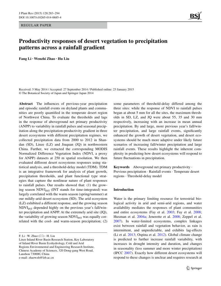 J Plant Res (2015) 128:283–294 DOI 10.1007/s10265-014-0685-4 REGULAR PAPER Productivity responses of desert vegetation to precipitation patterns across a rainfall gradient Fang Li · Wenzhi Zhao · Hu Liu Received: 5 May 2014 / Accepted: 27 September 2014 / Published online: 23 January 2015 © The Botanical Society of Japan and Springer Japan 2014 Abstract The influences of previous-year precipitation and episodic rainfall events on dryland plants and communities are poorly quantified in the temperate desert region of Northwest China. To evaluate the thresholds and lags in the response of aboveground net primary productivity (ANPP) to variability in rainfall pulses and seasonal precipitation along the precipitation-productivity gradient in three desert ecosystems with different precipitation regimes, we collected precipitation data from 2000 to 2012 in Shandan (SD), Linze (LZ) and Jiuquan (JQ) in northwestern China. Further, we extracted the corresponding MODIS Normalized Difference Vegetation Index (NDVI, a proxy for ANPP) datasets at 250 m spatial resolution. We then evaluated different desert ecosystems responses using statistical analysis, and a threshold-delay model (TDM). TDM is an integrative framework for analysis of plant growth, precipitation thresholds, and plant functional type strategies that capture the nonlinear nature of plant responses to rainfall pulses. Our results showed that: (1) the growing season NDVIINT (INT stands for time-integrated) was largely correlated with the warm season (spring/summer) at our mildly-arid desert ecosystem (SD). The arid ecosystem (LZ) exhibited a different response, and the growing season NDVIINT depended highly on the previous year’s fall/winter precipitation and ANPP. At the extremely arid site (JQ), the variability of growing season NDVIINT was equally correlated with the cool- and warm-season precipitation; (2) F. Li · W. Zhao (*) · H. Liu Linze Inland River Basin Research Station, Key Laboratory of Inland River Basin Ecohydrology, Cold and Arid Regions Environmental and Engineering Research Institute, Chinese Academy of Sciences, 320 Dong‑gang West Road, Lanzhou 730000, China e-mail: [email protected] some parameters of threshold-delay differed among the three sites: while the response of NDVI to rainfall pulses began at about 5 mm for all the sites, the maximum thresholds in SD, LZ, and JQ were about 55, 35 and 30 mm respectively, increasing with an increase in mean annual precipitation. By and large, more previous year’s fall/winter precipitation, and large rainfall events, significantly enhanced the growth of desert vegetation, and desert ecosystems should be much more adaptive under likely future scenarios of increasing fall/winter precipitation and large rainfall events. These results highlight the inherent complexity in predicting how desert ecosystems will respond to future fluctuations in precipitation. Keywords Aboveground net primary productivity · Previous precipitation · Rainfall events · Temperate desert regions · Threshold-delay model Introduction Water is the primary limiting resource for terrestrial biological activity in arid and semi-arid regions, and water availability mediates the responses of plant communities and entire ecosystems (Fay et al. 2003; Fay et al. 2008; Huxman et al. 2004a; Jenerette et al. 2008; Zeppel et al. 2007). In water-limited ecosystems, complex linkages exist between rainfall and vegetation behavior, as rain is intermittent, and unpredictable, and exhibits lag-effects (Li et al. 2013; Ospina et al. 2012). Global climate change is predicted to further increase rainfall variability, with increases in drought intensity and duration, and changes in seasonality (less summer and more winter precipitation) (IPCC 2007). Exactly how different desert ecosystems will respond to these changes is unclear and requires research at 13 284 the interface of ecology and hydrology, especially in arid regions (Plaut et al. 2013; Roca et al. 2004). Aboveground net primary productivity (ANPP), a key ecosystem process, exhibits spatial and temporal variability, and reflects floral and community responses to fluctuations in annual and seasonal precipitation (Bradford et al. 2006; Shafran-Nathan et al. 2012). In all terrestrial ecosystems, plant functions, including ANPP, respond by constraining gas exchange during dry periods, and altering structural and physiological attributes that affect the ability of plants to utilize soil water following precipitation (Blackman et al. 2009; Brodribb et al. 2010; Resco et al. 2009). The normalized difference vegetation index (NDVI) provides information on plant density and growing conditions on the ground (Berger et al. 2013), and it is widely used as a proxy for productivity in arid ecosystems (Gamon et al. 2013; Horion et al. 2013; Svoray and Karnieli 2011). NDVI is closely and positively correlated with the fraction of photosynthetically active radiation absorbed by green vegetation which tends to be in synchrony with canopy development, when the inter-annual variability of incident radiation and radiation use efficiency is small (Camberlin et al. 2007; Paruelo et al. 1997). These requirements were met in our study sites, and thus most of the inter-annual variability in ANPP was accounted for by changes in green-leaf biomass (Fabricante et al. 2009). Precipitation seasonality exerts an important control over ecosystem processes, particularly in dry ecosystems, and affects productivity (Gao and Reynolds 2003; Xiao and Moody 2004), vegetation structure, and composition (Robinson et al. 2013). Desert ecosystems have a high potential to respond to changes in seasonality (Robinson et al. 2013). The relationship between seasonally-accumulated rainfall and ANPP during the growing season has been studied extensively on a regional scale, but fall/winter climate dynamics also play an important role in determining the structure and function of arid-land ecosystems (Hamerly