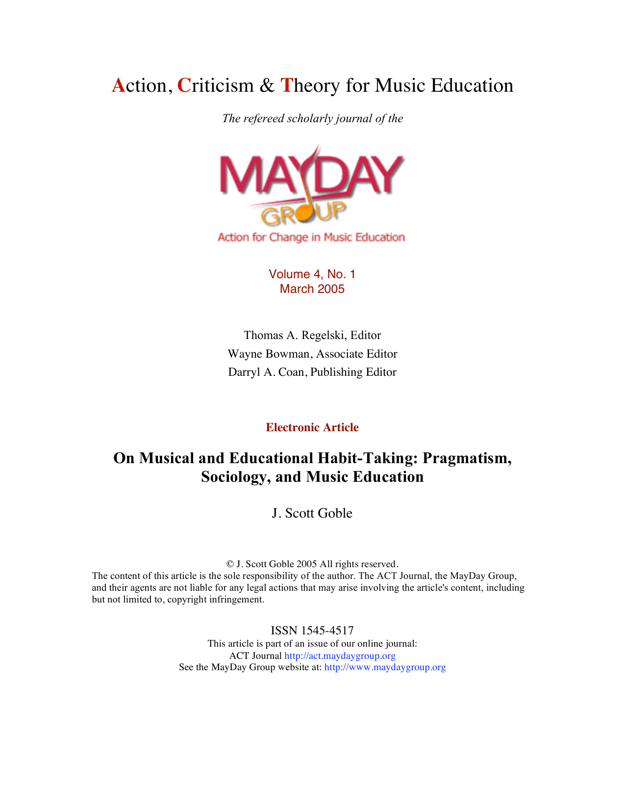 Action, Criticism, and Theory for Music Education. Vol.4, #4 (March 2005).