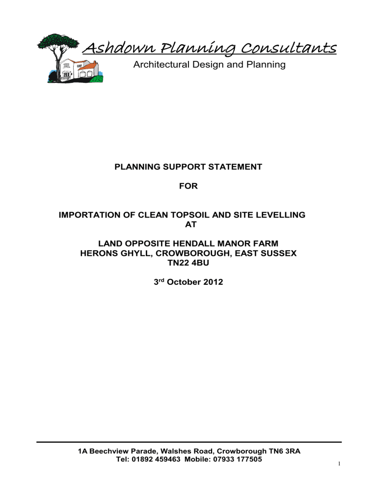 Ashdown Planning Consultants Architectural Design and Planning PLANNING SUPPORT STATEMENT FOR IMPORTATION OF CLEAN TOPSOIL AND SITE LEVELLING AT LAND OPPOSITE HENDALL MANOR FARM HERONS GHYLL, CROWBOROUGH, EAST SUSSEX TN22 4BU 3rd October 2012 1A Beechview Parade, Walshes Road, Crowborough TN6 3RA Tel: 01892 459463 Mobile: 07933 177505 1 PLANNING STATEMENT AND AGRICULTURAL JUSTIFICATION FOR IMPORTATION OF TOPSOIL, SITE LEVELLING AND LAND IMPROVEMENT Site: Land opposite Hendall Manor Farm. East of A26, Herons Ghyll, Crowborough East Sussex. Title Number Esx 221678 View from south to north showing slope, screening and invasive plants Introduction: This supporting statement accompanies an application for the improvement of the above land to enable further livestock grazing by importing high quality top soil and improving drainage on the land. The land the subject of this application is owner by the applicant, Mr M Carter and is a registered agricultural holding under DEFRA Reg 41/138/0276. The land is currently used as pasture by local farmers for sheep and cattle. There are currently approximately 100 sheep grazing on site. 2 The applicant has a farm plan to improve the quality of the land for grazing and introduce his own small herd of approximately 12-13 Dexter cattle, and 20 sheep with the intention of adding a small pig unit. Site Description: The entire site area, as shown on the submitted plan amounts to 5.87 Ha and is linear on a north/south axis. There is an existing farm gate and access into the site, immediately opposite the entrance to Hendall Farm to the west of the A26. The northern part of the site, where the land improvement is proposed (outlined red on the submitted site plan), is heavily tree screened on all sides and no part of the land is visible from either the highway or any other nearby farm buildings.and amounts to some 2.4 Ha. Existing Land and Proposal: In its present state, this part of the land is of marginal arable use which is poorly drained and difficult to work due to the impermeable nature of the soil. A soil analysis was undertaken by Alan Furneaux and this has been submitted with the application. In its present state the land is unsuitable for farming and livestock grazing. Flora on the site are consistent with very damp grassland, these include water mint, mares tail, alder and willow saplings. Also creeping thistle and brambles are plentiful with bracken running into the site from the boundary to the A26. This creates an area that cannot currently be referred to as grassland in an agricultural sense, nor is it species rich in varieties considered to be important for the local habitat. The proposal is to skim the top part of the field by a depth of approximately 2”, leaving the spoil in a low heap in the middle of the field. The field would then be overlain with a 1m thick layer of topsoil on the lower north and east ends of the site levelling to the existing depth at road height, forming a plateau with a maximum 7degree angle of repose. The imported soil will consist of reclaimed top soil containing no concrete, asbestos, or chemicals, which has been filtered and mixed with manure. A humus builder and soils structure improver ley would be sown, utilising strong taproot species to bind the new soil together. The contractor proposed to provide the importation and levelling will be PJ Browns who have a proven track record in this field. This company provide full wheel washing facilities on site to ensure no soil is deposited onto the A26 from exiting lorries. The boundaries of the site are characterised by different levels of ditches with a local council pipeline bearing water run off from the A26 at the north east corner of the site. This has caused some erosion of the applicants land due to it being cut short before the ditch itself. The applicant proposes to extend this pipeline into the ditch to combat this. It is proposed that improvement to this part of land will also address the issue of waterlogging. There will be no risk of trees or tree roots of worth being damaged in the course of the proposed soil spreading as all works will be within the existing fence line in accordance with BS5837. The imported soil will not encroach upon the adjoining woodland as a 15 meter buffer zone will be observed from the crown spread. Once green cover has been established this area of farmland will be returned to a traditional pastoral Wealden landscape, removing the invasive species of flora currently on the site and providing for a viable agricultural use of the land. Services to the Site: 3 Water: A bore hole has been dropped on the southern part of site which located and tapped into an ample supply of water for animal needs and for any planting or horticulture. Electricity: The applicant is currently investigating the possibility of supplying electricity to the land and is in consultation with the necessary authorities/suppliers. Agricultural Enterprise: During the summer months the land would be strip grazed by moving the cattle forward to crop the grass and close their retreat, behind them. It will take 60 days for the cattle to graze the field in this manner, giving ample time for re-growth. With the proposed improvement to the northern area of the land, a further 12 Tons of grass will be produced, providing an extra 4 Tons of hay. Farm machinery currently owned by the applicant include a Wessex topper and various small farming implements. Should the proposal be given permission he will proceed with his purchases of a tractor, tedder, a bailer and trailers. Future added farming activities are planned which includes a small pig unit, and a horticultural and poultry enterprise on the southern, well drained area of the holding. Currently some 100 sheep are grazing the land. The applicant has attended meat cutting courses at Plumpton College, with lamb/pork/venison/cow/sausage and ham courses for which he is certificated. He also has a poultry slaughter license an