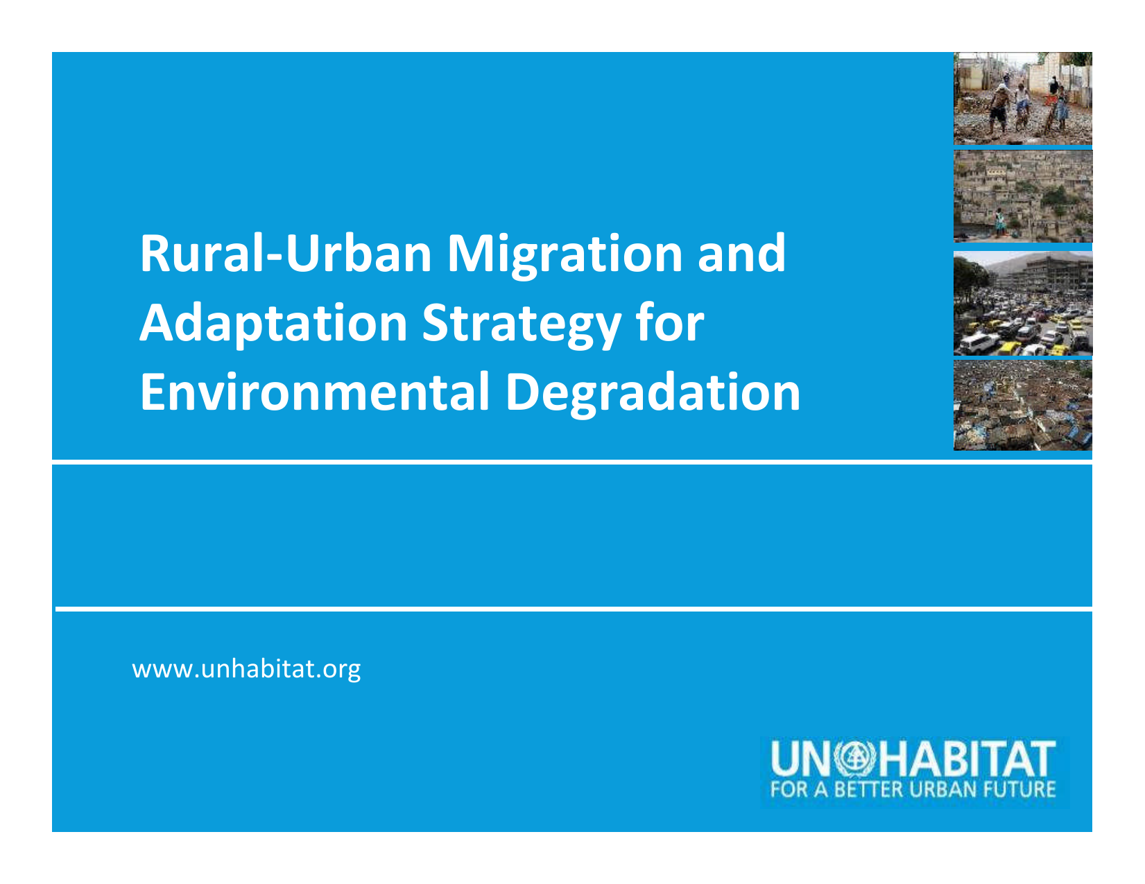 Rural-Urban Migration and Adaptation Strategy for Environmental Degradation www.unhabitat.org Rural-Urban Migration and Adaptation Strategy for Environmental Degradation • What motivates people to move to the cities? – Quality of life – Looking for better services (health, education, etc. ) – Employment – Food /water – Security issues – Young – exploration/alternatives – Natural and man-made disasters Rural-Urban Migration and Adaptation Strategy for Environmental Degradation • Future/ Climate Change Migration – Low-elevation coastal zones, where many of the world’s largest cities are located. – Only 2 per cent of the world’s total land area. – 13 per cent of the world’s urban population with Asia having a higher concentration. – By 2050, some 200 million people may be forced to leave their homes due to environmental degradation and water shortages caused by climate change. Rural-Urban Migration and Adaptation Strategy for Environmental Degradation • Rural-Urban: History perspective – Agricultural cycles – Industrialization – Jobs - urbanization --- cities – New opportunities: Europe, US, Latin America, East Asia – Now - Africa and parts of Asia? Rural-Urban Migration and Adaptation Strategy for Environmental Degradation • Common threads in urban areas 1. Impacts may have ripple effects across many sectors in city life. 2. Gender, age, race, and wealth have implications for the vulnerability of individuals and groups. 3. Urban planning, failure to adjust zoning and building codes limits the prospects of infrastructure adaption and place lives at risk. 4. Climate change impacts can be long-lasting. Rural-Urban Migration and Adaptation Strategy for Environmental Degradation • Generic lessons for Adaptation Strategies 1. Built commitments among stakeholders and official recognition 2. Risk/vulnerability assessment for the city 3. Developing strategic plans for the city as a whole 4. Adaptation option/strategy will fall to local government to implement Rural-Urban Migration and Adaptation Strategy for Environmental Degradation • City Development Strategies – UN-Habitat’s Cities and Climate Change Initiative • Piloted in 4 cities- Esmeraldas (Ecuador), Kampala (Uganda), Maputo (Mozambique) and Sorsogan (the Philippines). • Brings a variety of stakeholders- local and national governments, academia, NGOs and international organizations to alert cities to the actions that they can take to respond to climate change. Rural-Urban Migration and Adaptation Strategy for Environmental Degradation • City Development Strategies – ISDR Resilient Cities Campaign – The most pressing challenge : “to have countries and cities seen and understood adaptation strategies for environmental degradation as a central dimension of development” Some Examples on Particular Issues • Adaptation Option/Strategy: Addressing the constraints on freshwater supply – – – – – – – – – Expand and diversify water supply; Reduce demand/improve leak management; Increase drought preparedness; Increase public awareness about impacts upon water supplies; Expanded rainwater harvesting; water storage and conservation techniques; Water reuse; Desalination; Water-use and irrigation efficiency; Relocation. Some Examples on Particular Issues • Adaptation Option/Strategy: Addressing Storm and floodwater management – – – – – – Increase capacity to manage storm water Reduce property damage from flooding Improve early warning system for storm and flood events Sea walls and storm surge barriers Dune reinforcement Land acquisition and creation of marshlands/wetlands as buffer against sea-level rise and flooding protection of existing natural barriers Some Examples on Particular Issues • Adaptation Option/Strategy: Addressing Infrastructure and settlements – Improving housing, infrastructure and services, particularly for the urban poor in vulnerable areas Some Examples on Particular Issues • Adaptation Option/Strategy: Addressing Public Health – Reduce impacts of extreme heat events – Improve disease surveillance and protection – Heat-health action plans – Emergency medical services – Improved climate-sensitive disease and surveillance and control – Safe water and improved sanitation. www.unhabitat.org 13