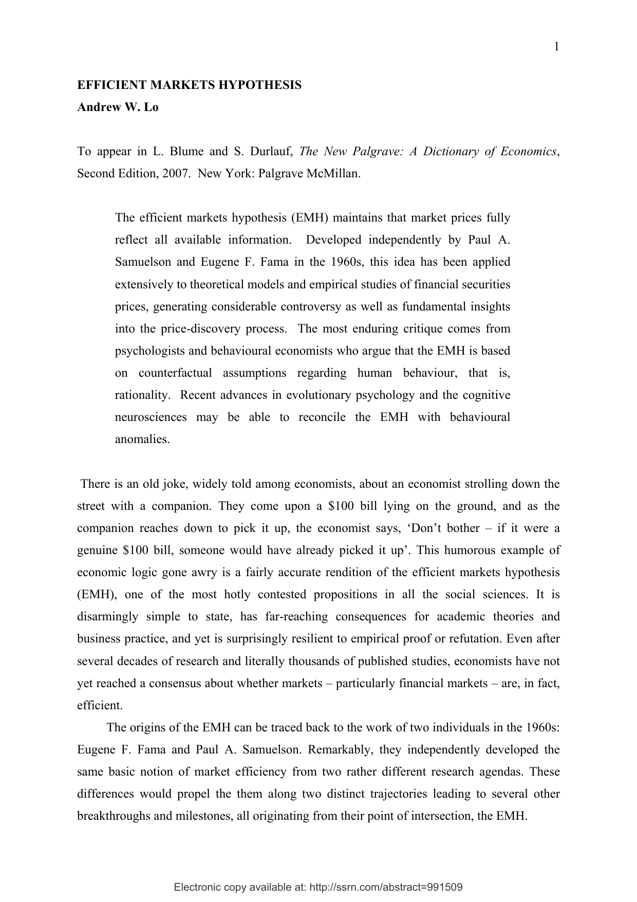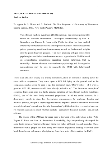 1 EFFICIENT MARKETS HYPOTHESIS Andrew W. Lo To appear in L. Blume and S. Durlauf, The New Palgrave: A Dictionary of Economics, Second Edition, 2007. New York: Palgrave McMillan. The efficient markets hypothesis (EMH) maintains that market prices fully reflect all available information. Developed independently by Paul A. Samuelson and Eugene F. Fama in the 1960s, this idea has been applied extensively to theoretical models and empirical studies of financial securities prices, generating considerable controversy as well as fundamental insights into the price-discovery process. The most enduring critique comes from psychologists and behavioural economists who argue that the EMH is based on counterfactual assumptions regarding human behaviour, that is, rationality. Recent advances in evolutionary psychology and the cognitive neurosciences may be able to reconcile the EMH with behavioural anomalies. There is an old joke, widely told among economists, about an economist strolling down the street with a companion. They come upon a $100 bill lying on the ground, and as the companion reaches down to pick it up, the economist says, ‘Don’t bother – if it were a genuine $100 bill, someone would have already picked it up’. This humorous example of economic logic gone awry is a fairly accurate rendition of the efficient markets hypothesis (EMH), one of the most hotly contested propositions in all the social sciences. It is disarmingly simple to state, has far-reaching consequences for academic theories and business practice, and yet is surprisingly resilient to empirical proof or refutation. Even after several decades of research and literally thousands of published studies, economists have not yet reached a consensus about whether markets – particularly financial markets – are, in fact, efficient. The origins of the EMH can be traced back to the work of two individuals in the 1960s: Eugene F. Fama and Paul A. Samuelson. Remarkably, they independently developed the same basic notion of market efficiency from two rather different research agendas. These differences would propel the them along two distinct trajectories leading to several other breakthroughs and milestones, all originating from their point of intersection, the EMH. Electronic copy available at: http://ssrn.com/abstract=991509 2 Like so many ideas of modern economics, the EMH was first given form by Paul Samuelson (1965), whose contribution is neatly summarized by the title of his article: ‘Proof that Properly Anticipated Prices Fluctuate Randomly’. In an informationally efficient market, price changes must be unforecastable if they are properly anticipated, that is, if they fully incorporate the information and expectations of all market participants. Having developed a series of linear-programming solutions to spatial pricing models with no uncertainty, Samuelson came upon the idea of efficient markets through his interest in temporal pricing models of storable commodities that are harvested and subject to decay. Samuelson’s abiding interest in the mechanics and kinematics of prices, with and without uncertainty, led him and his students to several fruitful research agendas including solutions for the dynamic assetallocation and consumption-savings problem, the fallacy of time diversification and logoptimal investment policies, warrant and option-pricing analysis and, ultimately, the Black and Scholes (1973) and Merton (1973) option-pricing models. In contrast to Samuelson’s path to the EMH, Fama’s (1963; 1965a; 1965b, 1970) seminal papers were based on his interest in measuring the statistical properties of stock prices, and in resolving the debate between technical analysis (the use of geometric patterns in price and volume charts to forecast future price movements of a security) and fundamental analysis (the use of accounting and economic data to determine a security’s fair value). Among the first to employ modern digital computers to conduct empirical research in finance, and the first to use the term ‘efficient markets’ (Fama, 1965b), Fama operationalized the EMH hypothesis – summarized compactly in the epigram ‘prices fully reflect all available information’ – by placing structure on various information sets available to market participants. Fama’s fascination with empirical analysis led him and his students down a very different path from Samuelson’s, yielding significant methodological and empirical contributions such as the event study, numerous econometric tests of single- and multi-factor linear asset-pricing models, and a host of empirical regularities and anomalies in stock, bond, currency and commodity markets. The EMH’s concept of informational efficiency has a Zen-like, counter-intuitive flavour to it: the more efficient the market, the more random the sequence of price changes generated by such a market, and the most efficient market of all is one in which price changes are completely random and unpredictable. This is not an accident of nature, but is in fact the direct result of many active market participants attempting to profit from their information. Driven by profit opportunities, an army of investors pounce on even the smallest informational advantages at their disposal, and in doing so they incorporate their information Electronic copy available at: http://ssrn.com/abstract=991509 3 into market prices and quickly eliminate the profit opportunities that first motivated their trades. If this occurs instantaneously, which it must in an idealized world of ‘frictionless’ markets and costless trading, then prices must always fully reflect all available information. Therefore, no profits can be garnered from information-based trading because such profits must have already been captured (recall the $100 bill on the ground). In mathematical terms, prices follow martingales. Such compelling motivation for randomness is unique among the social sciences and is reminiscent of the