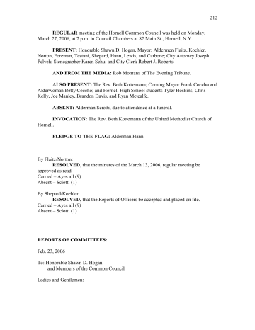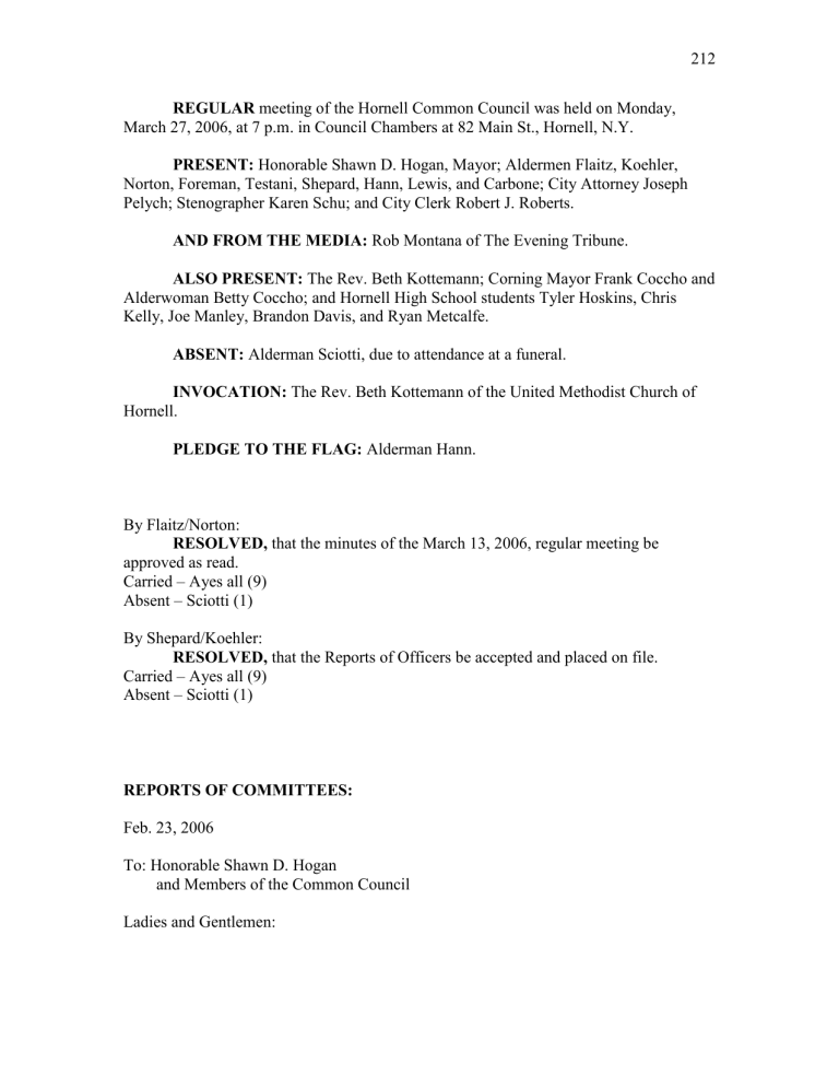 212 REGULAR meeting of the Hornell Common Council was held on Monday, March 27, 2006, at 7 p.m. in Council Chambers at 82 Main St., Hornell, N.Y. PRESENT: Honorable Shawn D. Hogan, Mayor; Aldermen Flaitz, Koehler, Norton, Foreman, Testani, Shepard, Hann, Lewis, and Carbone; City Attorney Joseph Pelych; Stenographer Karen Schu; and City Clerk Robert J. Roberts. AND FROM THE MEDIA: Rob Montana of The Evening Tribune. ALSO PRESENT: The Rev. Beth Kottemann; Corning Mayor Frank Coccho and Alderwoman Betty Coccho; and Hornell High School students Tyler Hoskins, Chris Kelly, Joe Manley, Brandon Davis, and Ryan Metcalfe. ABSENT: Alderman Sciotti, due to attendance at a funeral. INVOCATION: The Rev. Beth Kottemann of the United Methodist Church of Hornell. PLEDGE TO THE FLAG: Alderman Hann. By Flaitz/Norton: RESOLVED, that the minutes of the March 13, 2006, regular meeting be approved as read. Carried – Ayes all (9) Absent – Sciotti (1) By Shepard/Koehler: RESOLVED, that the Reports of Officers be accepted and placed on file. Carried – Ayes all (9) Absent – Sciotti (1) REPORTS OF COMMITTEES: Feb. 23, 2006 To: Honorable Shawn D. Hogan and Members of the Common Council Ladies and Gentlemen: 213 The Audit Committee met and audited bills at 7 p.m. on Tuesday, March 21, 2006. Bills were audited and approved by members Jean Shepard, John Carbone, Glenn Hann, and Christopher Koehler, Chairman. Bills audited and approved: CC $847,722.94 CD 53,337.31 PAYROLL 78,936.09 TOTAL $979,996.34 Respectfully submitted, Christopher Koehler Chairman, Audit Committee March 22, 2006 To: Honorable Shawn Hogan, Mayor and members of the Common Council Ladies and Gentlemen: The Youth & Recreation Committee met March 21, 2006, at 7 p.m. in the conference room. Members present were Bob Flaitz, Chris Koehler, Angelo Sciotti, Chairman Jean Shepard, and Recreation Director Dennis O’Brien. Also present was Glen Hann. Items discussed: 1) Offering tennis lessons; the Dodger program; and starting a drama program. Items approved: 1) Applicants for pool and playground. 2) Salaries for attendants, lifeguards, and supervisors A) Park attendants -- $6.75 per hour; B) Lifeguards -- $7.50 per hour; C) Two pool attendants -- $6.75 per hour; D) Two supervisors -- $8.25 per hour 2) Pool and playground schedules remain the same. A) Pool opens June 16-19 on short hours, and June 24-Aug. 13 full hours B) Parks open June 26-Aug. 11 3) Policies for park attendants and lifeguards remain the same. There being no further business, the meeting adjourned at 8 p.m. Respectfully submitted, Jean Shepard Chairman, Youth & Recreation Committee 214 March 25, 2006 To: Honorable Mayor Hogan and members of the Common Council Ladies and Gentlemen: The Finance Committee met on March 25, 2006, at the Council Chambers of City Hall at 10:45 a.m. Members present were Aldermen Norton, Flaitz, Koehler and Foreman. Also present was Mayor Hogan. Items discussed: 1) A motion was made by Foreman, second by Norton, to enter executive session. 2) The members discussed insurance bids. 3) A motion by Norton, second by Flaitz to exit the executive session. The meeting adjourned at 10:55 a.m. Respectfully submitted, Joe Foreman, Chairman Finance Committee By Testani/Koehler: RESOLVED, that the Reports of Committees be accepted and placed on file. Carried – Ayes all (9) Absent – Sciotti (1) RESOLUTIONS: #1 – APPROVAL OF 2006-07 GENERAL FUND BUDGET – HN-06-26 By Testani/Koehler: RESOLVED, that the 2006-07 City of Hornell budget be and is hereby approved. Carried – Ayes all (9) Absent – Sciotti (1) ON THE QUESTION: See Appendix K. Mayor Hogan noted there is no tax-rate increase in this budget, which he attributed to a 24.11-percent increase in the state Aid and Incentives to Municipalities program. That increase meant an additional $262,664 to the City of Hornell. Without that aid, the Mayor said, the City would have had to raise taxes, make cuts, or both. He thanked the Finance Committee and Chairman Foreman. Alderman Koehler credited Mayor Hogan for lobbying for the increased state aid. 215 #2 – APPROVAL OF THE 2006-07 WATER FUND BUDGET – HN-06-27 By Flaitz/Hann: RESOLVED, that the 2006-07 City of Hornell water budget be and is hereby approved. Carried – Ayes all (9) Absent – Sciotti (1) ON THE QUESTION: See Appendix L. Mayor Hogan said the City’s water system is wrapping up a major $2.6 million project and still has other, smaller work that needs to be done. This budget reflects a 3-percent increase in the water rates, for a total of $240 a year for City residents. He noted the City pays more than $160,000 a year in taxes on its reservoirs, its plant, and its water lines. #3 – APPORTION TAXES – HN-06-28 By Koehler/Norton: WHEREAS, the budget report as adopted shows the amount to be raised by tax for the current year to be $2,598,487.00, and NOW, THEREFORE, BE IT RESOLVED, that the Common Council does ascertain that the aforesaid sum of $2,598,487.00 as above set out, be and the same is hereby levied according to the valuation upon the assessment roll for the current year, and the City Clerk and the Mayor along with the City Chamberlain be, and are hereby directed, in accordance with the provisions of the City Charter of Hornell, to apportion said sum levied on the assessment roll to be raised by tax, and to receive and collect same. Carried – Ayes all (9) Absent – Sciotti (1) #4 – AUTHORIZATION TO DRAW CHECKS – HN-06-29 By Testani/Shepard: NOW, THEREFORE, BE IT RESOLVED, that the Mayor, City Chamberlain and City Clerk be authorized to draw checks. Carried – Ayes all (9) Absent – Sciotti (1) #5 – DESIGNATING OFFICIAL DEPOSITORIES – HN-06-30 By Carbone/Hann: 216 NOW, THEREFORE, BE IT RESOLVED, that Steuben Trust Co., HSBC, Five Star National Bank and Depository Trust Company of New York, Chase Manhattan Bank, and MBIA Municipal Investors Service Corp., be and are hereby designated official depositories for monies of the City of 