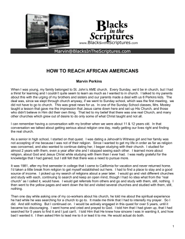www.BlacksintheScriptures.com [email protected] HOW TO REACH AFRICAN AMERICANS Marvin Perkins When I was young, my family belonged to St. John’s AME church. Every Sunday, we’d be in church, but I had a thirst for learning and I couldn’t quite seem to learn as much as I wanted to in church. I talked to my parents about this with the urging of my brothers and sisters and our parents made a deal with us 6 Perkins kids. The deal was, since we slept through church anyway, if we went to Sunday school, which was the first meeting, we did not have to go to church. This was great news for us. In one of the Sunday School classes, Mrs. Mosley taught a lesson that gave me the impression that Jesus came down here and set up His Church, and those who didn't believe in Him did their own thing. That led to my belief that there was one real Church, and many other churches which grew out of desire to do only some of what Christ taught and not all. I can remember having a conversation with my brother when we were about 11 & 12 years old. In that conversation we talked about getting serious about religion one day, really getting our lives right and finding the real church. As a senior in high school, I started on that quest. I was dating a Jehovah's Witness girl and her family was not accepting of me because I was not of their religion. Since I wanted to get my life in order as far as religion was concerned, and also wanted to continue dating her, I began studying with their church. I studied for almost 2 years with them, even a year after she and I stopped seeing each other. I learned more about religion, about God and Jesus Christ while studying with them than I ever had. I was really grateful for the knowledge that I had gained, but I still felt that there was a need to pursue more. It was 1981, after my first semester in college that I came to California for vacation and never returned home. I’d taken a little break from religion to get myself established out here. I had to find a place to stay and a good source of income. I picked up my search of religions about a year later. I would go and visit different churches and study with each, continuing to search and keep an open mind, though I had no idea what from the “real church” as I called it, would have. I would get referrals from others and go and study with them, still, nothing. I then went to the yellow pages and went down the list and visited several churches and studied with them, still, nothing. Then one day while asking one of my co-workers about his church, he told me about the spiritual experience he had while he was searching for a church to go to. It made me think that I had to intensify my prayer. So I did. And still nothing. But I continued on. I would be actively engaged in this quest for over 5 years, until it became too discouraging. I went home and cried and prayed to God. I told him that I had given up, that I had searched for 5 years to find it and I just can't. I told Him that He knew how sincere I was in wanting it, and how bad I wanted it. I then asked Him to lead me to it or lead it to me. He would actual do both. 1 I was first introduced to the church by one of my business associates. We had gone to park bench where I’d have my first experience LDS literature, the Joseph Smith History. I was so taken by this story. So much so, that I began to feel a strange sensation come over me. I began to be emotional over what I was reading. I asked myself quietly, “is this what I’ve been in search of for so long?” I was drawn in by the similarities of my and Joseph Smith’s search for the real Church, and felt instantly connect to him. That’s when I asked my associate where I could get one of these Book of Mormons. I didn't understand her excitement at that question. But she quickly handed me her copy, which surprised me. I told her that I could just go and buy it somewhere, but she insisted. So I took the book and distanced myself from Mary for the next several weeks. She spoke about the Church with so much conviction, and I did not want her to influence me. I thought that this might be the answer to my prayer of almost a year ago, and if so it was too important to do this any other way. So I was reading and reading and reading. I could not put the book down. It fascinated me. And as I read, I felt like this all made sense. Eventually, I was ready to ask, to put the James 1:5 to the test. And I did. As I prayed and asked Heavenly Father about the truthfulness of this Book, asking Him if it was truly His work, of Him, by Him, I felt an undeniable presence there in my one bedroom apartment. It was so real, that I got up and searched the apartment to make sure I was alone. It was real, and it lingered until I was sure... My search was over. He had both led me to it and it to me. I then went into the yellow pages again, this time I looked up and called the Church of Jesus Christ of Latterday. I set up a time to come down and check out one of the services. I then got back in touch with Mary, told her what all had happened, and ask her if she would mind coming along with me to help explain things that I may not understand. As we studied over the next several weeks, the issue of the Blacks and the Priesthood came up, and I thought, ok, no problem, I'll just ask the members and they'll tell me, and we can move on. But that was not the case. The answers that were given over and over by the members did more to offend than to satisfy. I couldn't believe that they could believe such things. It continued to be an obstacle to baptism. I would not join this church until I received some satisfaction on this issue, which I did not find. I now had a real dilemma. I was growing further away from the church that I thought was the one real church. In efforts to help me, Mary suggested that I go and see the Stake President, who was an extremely knowledgeable man. As I sat down with President Jack Rushton, I asked him my questions, to whic