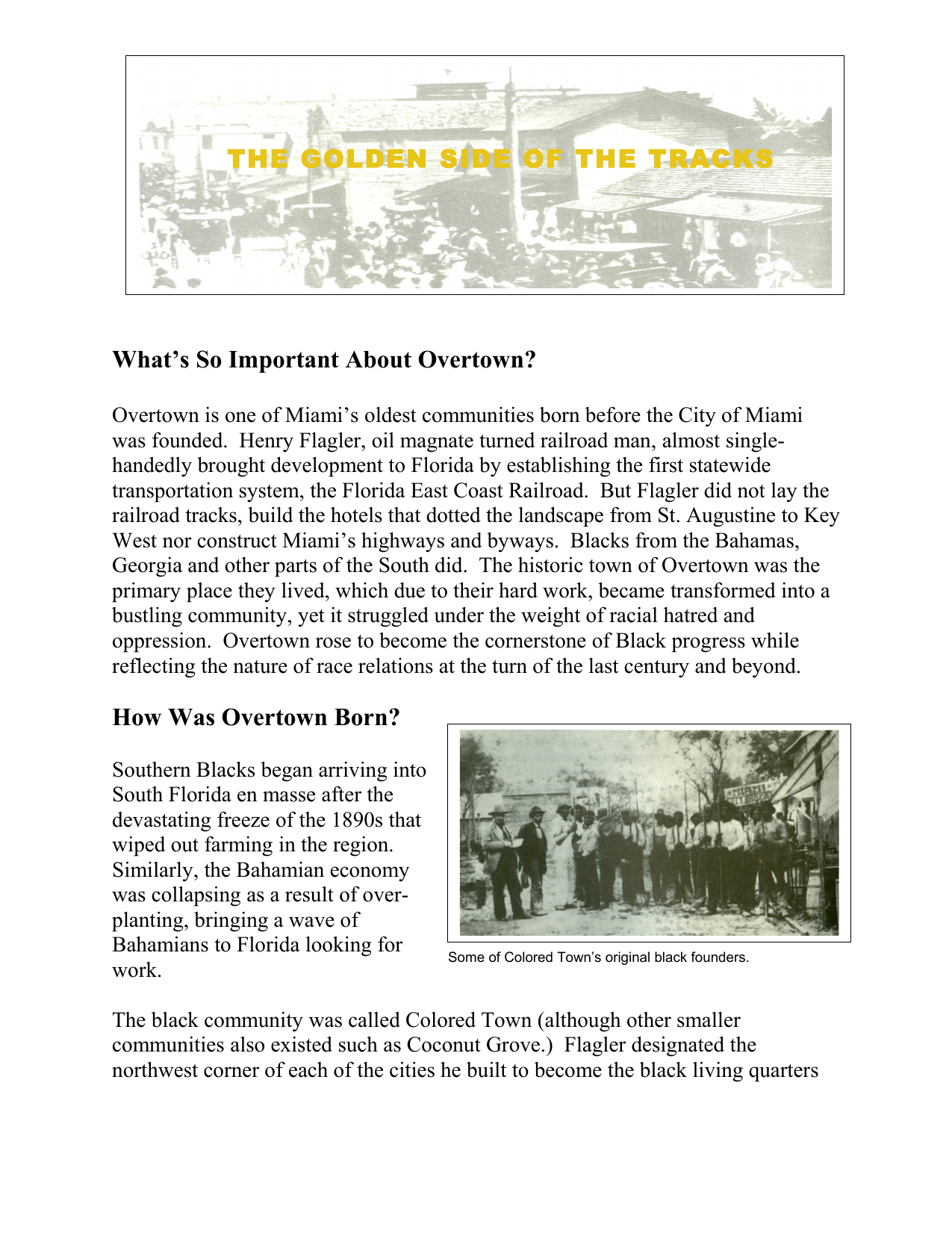THE GOLDEN SIDE OF THE TRACKS What’s So Important About Overtown? Overtown is one of Miami’s oldest communities born before the City of Miami was founded. Henry Flagler, oil magnate turned railroad man, almost singlehandedly brought development to Florida by establishing the first statewide transportation system, the Florida East Coast Railroad. But Flagler did not lay the railroad tracks, build the hotels that dotted the landscape from St. Augustine to Key West nor construct Miami’s highways and byways. Blacks from the Bahamas, Georgia and other parts of the South did. The historic town of Overtown was the primary place they lived, which due to their hard work, became transformed into a bustling community, yet it struggled under the weight of racial hatred and oppression. Overtown rose to become the cornerstone of Black progress while reflecting the nature of race relations at the turn of the last century and beyond. How Was Overtown Born? Southern Blacks began arriving into South Florida en masse after the devastating freeze of the 1890s that wiped out farming in the region. Similarly, the Bahamian economy was collapsing as a result of overplanting, bringing a wave of Bahamians to Florida looking for work. Some of Colored Town’s original black founders. The black community was called Colored Town (although other smaller communities also existed such as Coconut Grove.) Flagler designated the northwest corner of each of the cities he built to become the black living quarters so that he had a ready source of labor to build his hotels, who could be separated from the white population after working hours. Colored Town was a crowded, harsh place to live, deprived of even the most basic services, resulting in diseases such as yellow fever and smallpox running rampant. Thriving Business Community Despite these conditions, Colored Town became a leading center of black commerce. D.A. Dorsey became Miami’s first black millionaire by building houses for the local black population and starting the first black bank. Besides a plethora of family-owned businesses, a growing black professional community was established which included doctors, dentists, and hospitals. The community also had seven black newspapers and over a dozen community organizations including the Eastern Star Lodge, the Masons, the Elks, the Odd Fellows and more. Transportation blossomed along the heart of Colored Town, Second and Third Avenues, where One of the more successful businesses in automobiles, bicycles, horse-drawn carriages and Colored Town owned by S.W. Brown. . wagons moved people and wares across the community. The church community provided not only a spiritual connection for blacks, but also a foundation for social and political activism as well as a source of public welfare. The Harlem of the South Most prominent in Colored Town was its entertainment palaces led by the Lyric Theater, which featured vaudeville, music, silent movies and more. Other venues included the Rockland Palace, the Harlem Square Club, the Cotton Club, the Ritz Theater, the Mary Elizabeth Hotel, the Sir John and many more. These clubs and theaters featured the greatest artists of The Lyric Theater, one of Overtown’s premiere venues. their day including Count Basie, Ella Fitzgerald, James Brown, Billie Holiday, and Cab Calloway to name a few. This entertainment served as a source of pride for the community but also directly related to entertainment serving the larger white community. Black entertainers who performed for the white community were not allowed to stay on Miami Beach or in traditional hotels, so they performed first for the white community and then in Colored Town, often for free, before getting some shuteye at a hotel in Overtown. Racism Raises Its Ugly Head Lynchings were not a rare occurrence in the black community. The Klan formally arrived in Miami in the 1920s, fomenting mob action against blacks, using dynamite to blow up homes, and running blacks out of town through force of violence. The police were not friends of the black community either. Many were from the South where attitudes concerning blacks were mixed at best. Blacks were routinely locked up under dubious vagrancy laws, outright torture was practiced against black prisoners including the use of electric chairs, and occasionally police officers committed murder against the black population with impunity. The End of an Era In the 1950s plans were laid to build an extension to Interstate 95. Although several alternatives existed, the chamber of commerce and the road department decided to build the expressway running through Overtown. With urban renewal and expressway construction, over 20,000 blacks lost their homes and a bustling black community lost its footing. What wasn’t taken by the construction of the roadway was taken through urban renewal, which for many blacks resulting in their removal from the community. I-95 changed the face of Overtown forever. Overtown today is not dead. Although the population is substantially smaller today than during its heyday, it faces a new threat, gentrification. During the building boom of the mid 2000s, tens of thousands of condos were planned in and around Overtown. Substantially all of the new homes were well above the affordability threshold of most Overtowners. In fact, the City of Miami was demolishing more affordable housing units than it was building despite the millions of dollars allocated for this purpose. With today’s building bust, the black community is seeking creative solutions to solve their housing crisis. Some are working with government officials to insure that money allocated for housing projects goes to low cost housing. Others are organizing to seek alternative avenues of housing for the poor and homeless including organizations such as Take Back the Land and the Miami Workers Center. Whatever the solutions will be, Overtowners will need a strong voice so that history does not repeat itself a