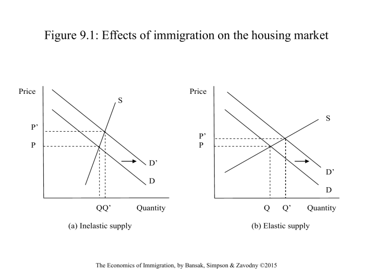 Figure 9.1: Effects of immigration on the housing market Price Price S S P’ P’ P P D’ D’ D D QQ’ (a) Inelastic supply Quantity Q Q’ Quantity (b) Elastic supply The Economics of Immigration, by Bansak, Simpson & Zavodny ©2015 Figure 9.2: Housing market in the destination when natives respond to immigration by moving out of the area Price S P’ P” P D’ D” D Q Q” Q’ Quantity The Economics of Immigration, by Bansak, Simpson & Zavodny ©2015 Figure 9.3: Market for landscaping services with immigration Price S S’ P P’ D Q Q’ Quantity The Economics of Immigration, by Bansak, Simpson & Zavodny ©2015 Figure 9.4: Market for ethnic food with immigration Price S S’ P D’ D Q Q’ Quantity The Economics of Immigration, by Bansak, Simpson & Zavodny ©2015 Figure 9.5: Various channels of how immigration affects national income Housing Prices of products Product variety and diversity Immigration International trade National income Financial markets Capital Innovation and productivity The Economics of Immigration, by Bansak, Simpson & Zavodny ©2015 Figure 9.6: Solow growth model Output per worker, y y=Af(k) Capital per worker, k The Economics of Immigration, by Bansak, Simpson & Zavodny ©2015 Figure 9.7: Solow growth model steady state Output, investment and savings per worker, y, i and s i=(n+d)k y=Af(k) s=λAf(k) k* Capital per worker, k The Economics of Immigration, by Bansak, Simpson & Zavodny ©2015 Figure 9.8: Solow growth model with population growth and TFP increase i,s i,s i’ i i s’ s k*’ k* (a) Increase in population growth k s k* k**’ k (b) Increase in total factor productivity The Economics of Immigration, by Bansak, Simpson & Zavodny ©2015