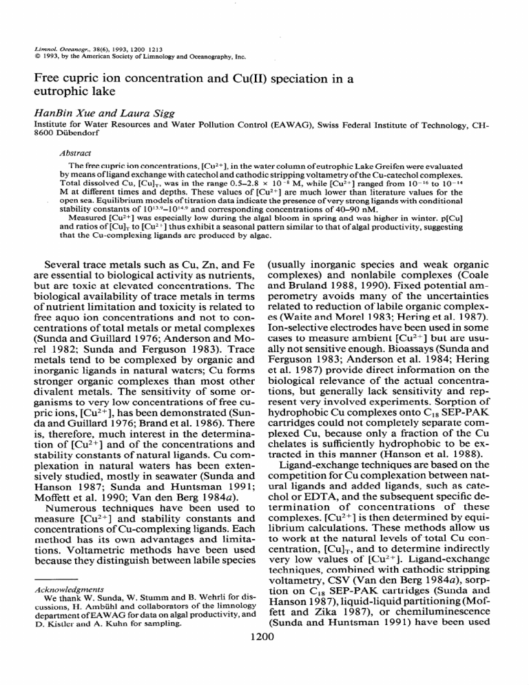 The free cupric ion concentrations, [Cu2+], in the water column ofeutrophic Lake Greifen were evaluated