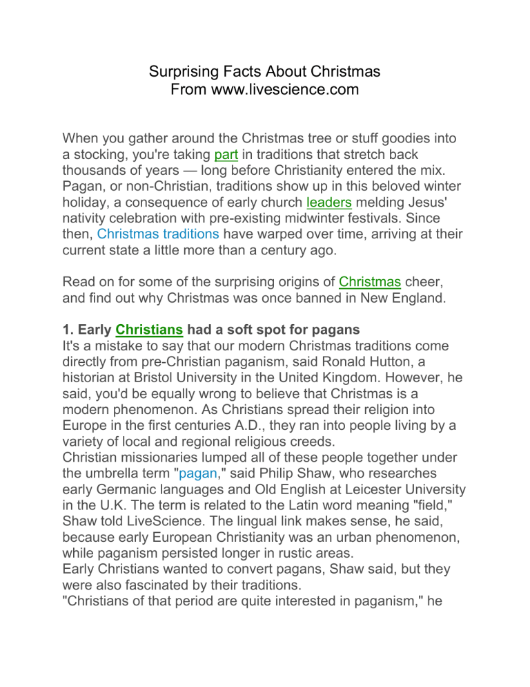 Surprising Facts About Christmas From www.livescience.com When you gather around the Christmas tree or stuff goodies into a stocking, you're taking part in traditions that stretch back thousands of years — long before Christianity entered the mix. Pagan, or non-Christian, traditions show up in this beloved winter holiday, a consequence of early church leaders melding Jesus' nativity celebration with pre-existing midwinter festivals. Since then, Christmas traditions have warped over time, arriving at their current state a little more than a century ago. Read on for some of the surprising origins of Christmas cheer, and find out why Christmas was once banned in New England. 1. Early Christians had a soft spot for pagans It's a mistake to say that our modern Christmas traditions come directly from pre-Christian paganism, said Ronald Hutton, a historian at Bristol University in the United Kingdom. However, he said, you'd be equally wrong to believe that Christmas is a modern phenomenon. As Christians spread their religion into Europe in the first centuries A.D., they ran into people living by a variety of local and regional religious creeds. Christian missionaries lumped all of these people together under the umbrella term "pagan," said Philip Shaw, who researches early Germanic languages and Old English at Leicester University in the U.K. The term is related to the Latin word meaning "field," Shaw told LiveScience. The lingual link makes sense, he said, because early European Christianity was an urban phenomenon, while paganism persisted longer in rustic areas. Early Christians wanted to convert pagans, Shaw said, but they were also fascinated by their traditions. "Christians of that period are quite interested in paganism," he said. "It's obviously something they think is a bad thing, but it's also something they think is worth remembering. It's what their ancestors did." [In Photos: Early Christian Rome] Perhaps that's why pagan traditions remained even as Christianity took hold. The Christmas tree is a 17th-century German invention, University of Bristol's Hutton told LiveScience, but it clearly derives from the pagan practice of bringing greenery indoors to decorate in midwinter. The modern Santa Claus is a direct descendent of England's Father Christmas, who was not originally a gift-giver. However, Father Christmas and his other European variations are modern incarnations of old pagan ideas about spirits who traveled the sky in midwinter, Hutton said. 2. We all want that warm Christmas glow But why this fixation on partying in midwinter, anyway? According to historians, it's a natural time for a feast. In an agricultural society, the harvest work is done for the year, and there's nothing left to be done in the fields. "It's a time when you have some time to devote to your religious life," said Shaw. "But also it's a period when, frankly, everyone needs cheering up." The dark days that culminate with the shortest day of the year -— the winter solstice — could be lightened with feasts and decorations, Hutton said. "If you happen to live in a region in which midwinter brings striking darkness and cold and hunger, then the urge to have a celebration at the very heart of it to avoid going mad or falling into deep depression is very, very strong," he said. Stephen Nissenbaum, author of the Pulitzer Prize finalist "The Battle for Christmas" (Vintage, 1997), agreed. "Even now when solstice means not all that much because you can get rid of the darkness with the flick of an electric light switch, even now, it's a very powerful season," he told LIveScience. 3. The Church was slow to embrace Christmas Despite the spread of Christianity, midwinter festivals did not become Christmas for hundreds of years. The Bible gives no reference to when Jesus was born, which wasn't a problem for early Christians, Nissenbaum said. "It never occurred to them that they needed to celebrate his birthday," he said. With no Biblical directive to do so and no mention in the Gospels of the correct date, it wasn't until the fourth century that church leaders in Rome embraced the holiday. At this time, Nissenbaum said, many people had turned to a belief the Church found heretical: That Jesus had never existed as a man, but as a sort of spiritual entity. "If you want to show that Jesus was a real human being just like every other human being, not just somebody who appeared like a hologram, then what better way to think of him being born in a normal, humble human way than to celebrate his birth?" Nissenbaum said. [Religious Mysteries: 8 Alleged Relics of Jesus] Midwinter festivals, with their pagan roots, were already widely celebrated, Nissenbaum said. And the date had a pleasing philosophical fit with festivals celebrating the lengthening days after the winter solstice (which fell on Dec. 21 this year). "O, how wonderfully acted Providence that on that day on which that Sun was born … Christ should be born," one Cyprian text read. 4. The Puritans hated the holiday But if the Catholic Church gradually came to embrace Christmas, the Protestant Reformation gave the holiday a good knock on the chin. In the 16th century, Christmas became a casualty of this church schism, with reformist-minded Protestants considering it little better than paganism, Nissenbaum said. This likely had something to do with the "raucous, rowdy and sometimes bawdy fashion" in which Christmas was celebrated, he added. In England under Oliver Cromwell, Christmas and other saints' days were banned, and in New England it was illegal to celebrate Christmas for about 25 years in the 1600s, Nissenbaum said. Forget people saying, "Happy holidays" instead of "Merry Christmas," he said. "If you want to look at a real 'War on Christmas,' you've got to look at the Puritans," he said. "They banned it!" 5. Gifts are a new (and surprisingly controversial) tradition While gift-giving may seem inextricably tied to Christmas, it used to be that people looked 
