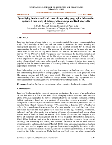INTERNATIONAL JOURNAL OF GEOMATICS AND GEOSCIENCES Volume 2, No 1, 2011 © Copyright 2010 All rights reserved Integrated Publishing services Research article ISSN 0976 – 4380 Quantifying land use and land cover change using geographic information system: A case study of Srinagar city, Jammu and Kashmir, India Wani, R. A1, Khairkar.V. P2 1- Ph.D. Research Scholar, University of Pune, India 2- Associate professor, Department of Geography, University of Pune, [email protected] ABSTRACT Land use/ land cover change study is very important aspect of the natural resources data base study. The knowledge of land use and land cover is important for many planning and management activities as it is considered as an essential element for modeling and understanding the earth’s features. The pressure of urbanization on Srinagar city can be drawn from the fact that the city had an area of 12.8 km² in 1901which increased to 82.88 km² in 1971 to 270 km² in 2001. The present study investigates the land transformation of Srinagar city located in the heart of the Himalayan mountain system in Kashmir valley. Urban expansion of Srinagar city and land transformation has severely affected the aerial extent of agricultural land, water bodies, marsh area etc. Srinagar city is ten times larger in population than the second urban centre of Anantnag (Primacy index= 9.95 in two city index) depicting its command over the region. Land information system plays a very vital role in managing the land resources of any area. For understanding the impacts of changing physical characteristics on land, geospatial tools like remote sensing and GIS have been useful. Therefore, in order to have a better understanding of the land use/ land cover change around Srinagar city, topographic and a multi-spectral remote sensing data was used to analyze the change around the city. Keywords: Land use/land cover, urbanization, urban expansion, land transformation, GIS, 1. Introduction Land use/ land cover studies have got a renewed emphasis as the process of agricultural use of land has been in a flux in the wake of fast changing national economy under the new global order. Land use refers the purpose of the land serves, for example, recreation, wild life habitat, agriculture. Land use is a product of interaction between a society’s cultural background, state and its physical needs on the one hand and the natural potential of land on the other hand (Baalak Ram and Kolarkar, 1993). According to Longley (2001), “land cover refer to the physical materials on the surface of a given parcel of land, while land use refer to the human activities that takes place on or make use of land e.g. residential, commercial, industrial etc.” An urban centre is a collection of houses of non-agricultural people where various uses of land are found on account of the forces of attraction and integration, the forces of dispersion and disintegration and the forces of spatial differentiation (Dickinson, 1964). Urban land use deals with the problem emerging in urban centres in the process of selecting and translating into action, the optimum utilization of limited land between shopping centres and residential areas (ManDul, 2000). Long term understanding on land use and land cover need to propose a more dynamic framework that explicitly links what is often divided into separate natural and human systems into a more integrated model. In developing countries like India, scenario are likely land use and land cover are often semantically Submitted on September 2011 published on November 2011 110 Quantifying land use and land cover change using geographic information system: A case study of Srinagar city, Jammu and Kashmir, India Wani, R. A, Khairkar.V. P equivalent i.e., land use activities associated with logging leads to a deforested land cover (Lambin, 1997). Land use and land cover is dynamic in nature and is an important factor for the comprehension of the interaction and relationship of anthropogenic activities with the environment. Land use and land cover change have been recognized as important drivers of global environment change. Land use is influenced by economic, cultural, political, historical and land-tenure factors at multiple scales. Land cover, on the other hand, is one of the many biophysical attributes of the land that affect how ecosystems function. Knowledge of the nature of land use and land cover change and their configuration across spatial and temporal scales is consequently indispensable for sustainable environmental management and development (Turner et al 1995). Urban landscapes are exemplified by the large concentration of population and fast expansion of urban zones which lead to alteration in the land use and land cover configuration that consequently impacts the landscape environment (Long et al., 2008). Land transformation is one of the most important fields of human induced environmental transformations, with an extensive history dating back to antiquity. Alteration is nearly inseparable from human occupation and use, and the goal is to encourage degradation. The degradation of water bodies are largely attributed to extensive agricultural reclamation, resulting in negative ecological consequences such as frequent floods, a decline in biodiversity and the extinction of a number of endemic species. Largest changes in terms of land area, and arguably also in terms of hydrological impacts, often arise from aforestation and deforestation activities (Calder, 1992). Studies have utilized remote sensed data to examine urban land changes in modern times with conclusions showing varying degree of different patterns of urban expansion and development in which could be associated with specific environmental factors (Long et al., 2008). Land use planning is basically concerned with the location, intensity and amount of land development required for various uses of space, functioning of the city, e.g., industry, wholesaling, business, hous