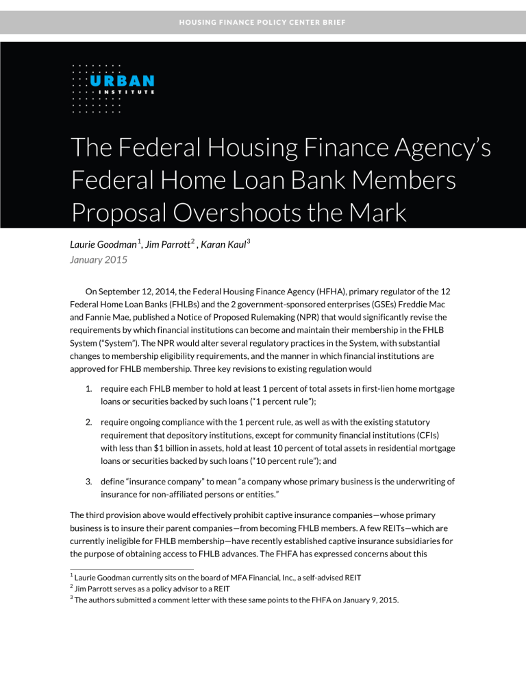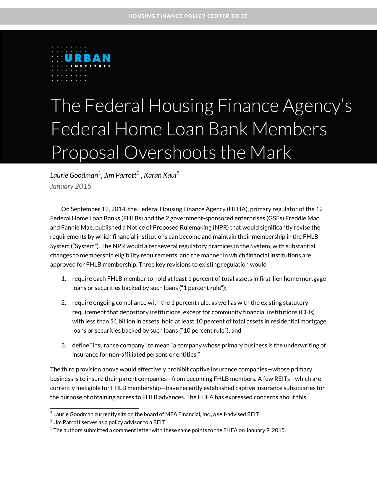 HOUSING FINANCE POLICY CENTER BRIEF The Federal Housing Finance Agency’s Federal Home Loan Bank Members Proposal Overshoots the Mark Laurie Goodman 1, Jim Parrott 2 , Karan Kaul 3 January 2015 On September 12, 2014, the Federal Housing Finance Agency (HFHA), primary regulator of the 12 Federal Home Loan Banks (FHLBs) and the 2 government-sponsored enterprises (GSEs) Freddie Mac and Fannie Mae, published a Notice of Proposed Rulemaking (NPR) that would significantly revise the requirements by which financial institutions can become and maintain their membership in the FHLB System (“System”). The NPR would alter several regulatory practices in the System, with substantial changes to membership eligibility requirements, and the manner in which financial institutions are approved for FHLB membership. Three key revisions to existing regulation would 1. require each FHLB member to hold at least 1 percent of total assets in first-lien home mortgage loans or securities backed by such loans (“1 percent rule”); 2. require ongoing compliance with the 1 percent rule, as well as with the existing statutory requirement that depository institutions, except for community financial institutions (CFIs) with less than $1 billion in assets, hold at least 10 percent of total assets in residential mortgage loans or securities backed by such loans (“10 percent rule”); and 3. define “insurance company” to mean “a company whose primary business is the underwriting of insurance for non-affiliated persons or entities.” The third provision above would effectively prohibit captive insurance companies—whose primary business is to insure their parent companies—from becoming FHLB members. A few REITs—which are currently ineligible for FHLB membership—have recently established captive insurance subsidiaries for the purpose of obtaining access to FHLB advances. The FHFA has expressed concerns about this 1 Laurie Goodman currently sits on the board of MFA Financial, Inc., a self-advised REIT Jim Parrott serves as a policy advisor to a REIT 3 The authors submitted a comment letter with these same points to the FHFA on January 9, 2015. 2 practice, citing captive insurers’ “safety and soundness” and other statutory provisions in the Federal Home Loan Bank Act as key drivers for promulgating this prohibition on captive insurers. The proposed rule has received over one thousand comments, the vast majority from community banks, credit unions, and trade associations concerned about the effects of ongoing compliance with the 1 percent and 10 percent rules. In contrast, only a small number of comments have addressed the prohibition on captive insurers. Given the lack of attention this provision has received and because we believe a prohibition on captive insurers could significantly affect the mortgage market, we focus our comments exclusively on this aspect of the NPR. Our analysis is based primarily on economic and practical considerations of the rule; we do not analyze the legal issues. To date, only a few REITs have accessed FHLB advances through captives, and current volumes are low. Without this proposed rule change, however, we believe that REITs’ use of this funding source would gradually increase, which would in turn diversify and deepen liquidity in the secondary market. Ultimately, captives’ access to FHLB advances would lower costs to borrowers and strengthen the housing finance system. Moreover, prohibiting captives from becoming FHLB members would not necessarily mitigate FHFA’s safety and soundness concerns. To the extent such risks exist, they are low, and can be more effectively mitigated through existing regulatory and FHLB risk management practices. Analysis Prohibiting captive insurers from becoming FHLB members for safety and soundness reasons raises two basic questions: 1. Does the availability of FHLB advances for REIT captives benefit the FHLBs, their members, or the mortgage market more generally? 2. Can the FHFA’s safety and soundness concerns about captives be adequately addressed without banning them from membership? REIT Captives Support the Mission of FHLBs and Benefit the Larger Mortgage Market REITS have deep mortgage market focus. According to Federal Reserve Flow of Funds data, mortgage 4 REITs held approximately $545 billion in total assets as of Q3 2014. Approximately $295 billion, or roughly 55 percent, of these assets was in the form of residential mortgages or securities backed by residential mortgages. Total mortgage assets—residential and commercial—composed over 85 percent of mortgage REITs’ total assets as of the same period. These numbers are not surprising, given that REITs are required, by statute, to hold at least 75 percent of their assets in, and derive 75% of their 4 Flow tables, Financial Accounts of the United States, Third Quarter 2014, Federal Reserve. 2 FHFA’S FHLB MEMBERS PROPOSAL OVERSHOOTS THE MARK 5 gross income from real estate related investments. This almost-singular focus on the mortgage market ensures that REITs’ and their captives’ business practices and interests remain strongly aligned with the 6 mission of FHLBs—perhaps more so than those of many depository institution and insurance company members. REITS support the underserved non-QM market. According to recent media reports and other public 7 information, some REITs are building capabilities to provide funding for loans that might not otherwise qualify for traditional financing, including loans that do not meet the qualified mortgage (QM) test. Origination of non-QM loans remains especially tight as lenders tread cautiously in the new “post-QM” lending environment, primarily worried about legal risks of lending outside of QM. This concern is greater for large banks, which face especially high scrutiny from shareholders, investors, regulators, policymakers, and the media, and which therefore may be less willing to originate such loans. The lack of liq