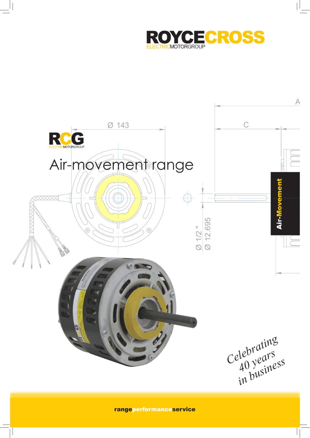 A C Ø 143 Air-Movement Ø 1/2 '' Ø 12.695 Air-movement range g n i t a s r b e Cel 0 year ess 4 usin in b rangeperformanceservice About Us Royce Cross Agencies prides itself on its large electrical motor and accessory range, product performance, personalised technical service and speedy delivery throughout Australia. Our range of high-quality electric motors includes such brands as the Royce Cross RCG (which replaces the REMX brand), Crompton Greaves, Toshiba, ABB, Transtecno and Baldor. When it comes to electric motors, the team at Royce Cross Agencies offers unparalleled knowledge and experience. Our resourceful staff assist a vast array of industries, from agriculture, manufacturing and engineering to electrical, mining, air conditioning and refrigeration. Our technical team also supplies to individuals with home hobbies. We deliver nationally with orders normally shipped within one to two days. Royce Cross Agencies understands individual needs and adapts to customers’ requirements. Our specialisation in the electric motor business has enabled us to develop and enhance our business, offering a complete solutions package, which includes: • • • • • • • Three-phase motors Single-phase motors Air-movement motors Variable speed drives Geared motors DC motors & controllers Accessories Technical services Royce Cross Agencies has established a large network of motor technical specialists that provide a range of quality services which include: • • • • • • • • Motor rewinds and repairs Motor redesign and engineering Motor overhaul Motor weatherproofing Mechanical services Testing Industrial electronics Design starter/VSD construction Visit www.roycecross.com.au to order your products online. Alternatively, speak with a member of our technical sales team by calling 1300 553 229. All Royce Cross Agencies (RCA) products are regularly redesigned. RCA reserves the right to modify the design, technical specification and dimensions without prior notice. E&OE. rangeperformanceservice Contents RCT Air movement series 1. RCT52 - Fridgemaster series Page 4 2. RCT76 & 82 - General purpose motors Page 6 3. RCT85 - Totally enclosedcondenser motor Page 8 Mounting Codes: M02 - Band Mount B02 - Resilient Mount - single shaft F02 - Stud Mount 4. RCT85 - Single-shaft blower motor Page 10 Mounting Codes: B02 - Resilient mount - single shaft 5. RCT85 - Double-shaft (ODF) blower motor Page 12 Mounting Codes: C02 - Resilient mount - double shaft 6. RCT90 - Double-shaft fan motor Page 14 Mounting Codes: C02 - Resilient mount - double shaft 7. Accessories Page 15 Ph: 1300 553 229 www.roycecross.com.au RCT52 Fridgemaster series The RCT52 series has been designed for flexibility of application used mostly in refrigeration and for small fan uses. The series offers a more efficient PSC design over shaded pole motors. Key features - Thermal fuse - Efficient PSC design - Standard shaft and hub drive - Universal mounting arrangement - Electrically reversible - Capacitor supplied - Mounting screws supplied - 12 month warranty - Distinctive snap and fit four in one design (40 watt version) RCG part no Replaces Fasco/Betts Replaces Kulthorn Replaces Brinsmead RCT52-134S-TE 30D501-80A / 50D501-80A KL10D / KJB2M4701 BLD13-11A RCT52-204S-TE 30D502-80A / 50D502-80A KL20D / KJB2P4700 BLD20-11A RCT52-404DS-TE 30D503-80A / 50D503-80A KL40DB / KJF2F4700 BLD40-11A Motor specifications RCG Part no Watts Full Speed out load RPM AMPS Cap. size uf/V Cap. supplied Reversible Voltage Suits fan dia Suits fan pitch RCT52-134S-TE 13 0.15 1350 2/440 YES YES 240 229 40o RCT52-204S-TE 20 0.25 1300 2/440 YES YES 240 254 40o RCT52-404DS-TE 40 0.50 1300 2/440 YES YES 240 275 40o Fan selections are based on 5 blade propeller style fans and are a guide only. Check fan curves prior to selecting alternate style fans. 4 rangeperformanceservice Dimensions RCT52 single shaft (13 & 20 watt) 32 ± 2 70 3 holes tapped M5x0.8 on PCD 71.4 both ends 45° ± 0.5 Ø 5/16'' Ø 7.924 4 holes tapped M5x0.8 on PCD 54.0 both ends ( 4 Screw Provided ) 12 0° 90.4 110 17.5 RCT52 double shaft (40 watt) 36 ± 2 70 32 ± 2 3 holes tapped M5x0.8 on PCD 71.4 both ends 45° ± 0.5 4 holes tapped M5x0.8 on PCD 54.0 both ends ( 4 Screw Provided ) 12 0° Ø 5/16'' Ø 7.924 90.4 110 17.5 98.5± 2 Ph: 1300 553 229 www.roycecross.com.au 5 RCT76 & 82 General purpose motors The RCT76 & 82 series has been designed specifically for general purpose application. Offering flexibility and adaptability the series can be applied to domestic, commercial and light industrial use. Common applications include cement mixers, drill presses and light duty machinery. Key features - Drip proof air cooled - 4 pole - 1 metre flex and plug - Foot mounted - Single phase 240V 50Hz - Electrically reversible - Motor specifications RCG part no Watts Full Speed out load RPM AMPS Standard rotation directions Reversible Voltage Type S.25C4SRCM 250 3.1 1430 ACW YES 240 Split Phase S.37C4CRCM 370 3.7 1430 ACW YES 240 Cap Start 6 rangeperformanceservice Dimensions RCT76 Ø 131.5 130± 1 87 ± 1 Switch ON/OFF With weather proof cover 101± 1 37 ± 0.5 +0 -0.3 Ø 1/2 ” Ø 12.695 71 +0 -0.03 +0 -0.5 12 56 56 40 45 45 45 110 148 231± 2 RCT82 148± 1 ØØ1 14747 97 ± 1 Switch ON/OFF With weather proof cover 120± 1 46± 0.5 Ø 5/8 ” Ø 15.87 +0 -0.03 78 +0 -0.5 14.7 +0 -0.3 62.5 62.5 165 48 50 50 50 130 268± 2 Note: direction of rotation is viewed from shaft end. Ph: 1300 553 229 www.roycecross.com.au 7 RCT85 Single-shaft condenser motor The Totally enclosed RCT85 series motor range is designed for a variety of outdoor applications, including condensing units and ventilation systems. The RCT85 series is designed to industry standards which allows them to be directly interchangeable with existing motors. Flexibility in the design process enables motors to be manufactured to meet specific customer designs. Key features - Low noise bearings - Designed to international standards - Auto 