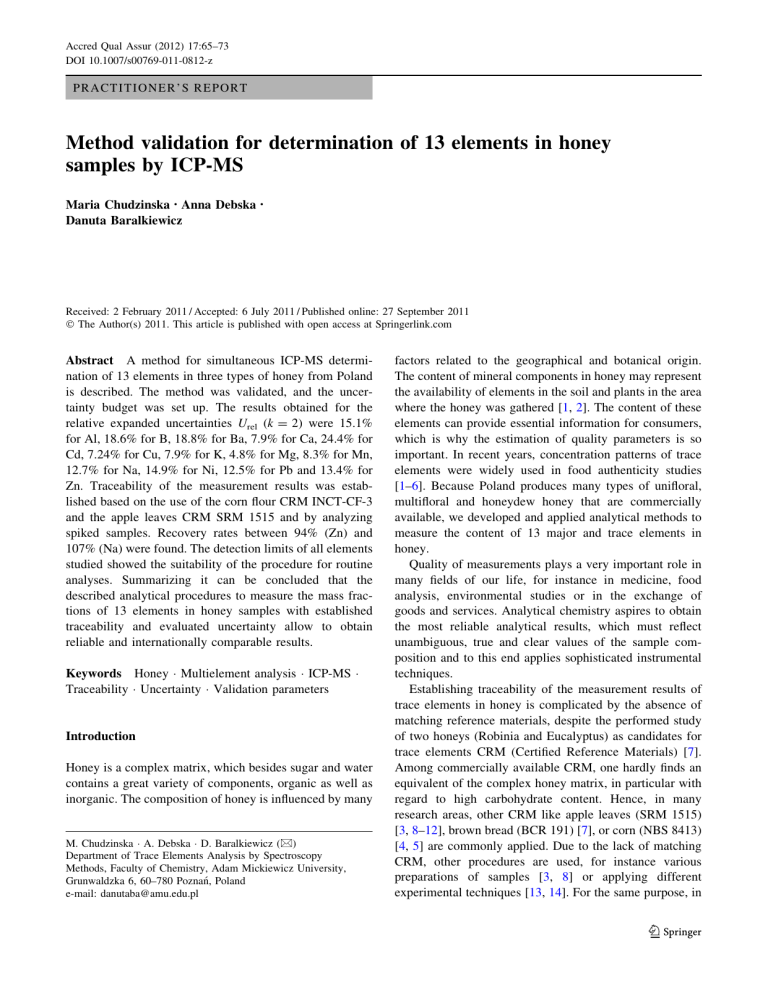 Accred Qual Assur (2012) 17:65–73 DOI 10.1007/s00769-011-0812-z PRACTITIONER’S REPORT Method validation for determination of 13 elements in honey samples by ICP-MS Maria Chudzinska • Anna Debska Danuta Baralkiewicz • Received: 2 February 2011 / Accepted: 6 July 2011 / Published online: 27 September 2011 Ó The Author(s) 2011. This article is published with open access at Springerlink.com Abstract A method for simultaneous ICP-MS determination of 13 elements in three types of honey from Poland is described. The method was validated, and the uncertainty budget was set up. The results obtained for the relative expanded uncertainties Urel (k = 2) were 15.1% for Al, 18.6% for B, 18.8% for Ba, 7.9% for Ca, 24.4% for Cd, 7.24% for Cu, 7.9% for K, 4.8% for Mg, 8.3% for Mn, 12.7% for Na, 14.9% for Ni, 12.5% for Pb and 13.4% for Zn. Traceability of the measurement results was established based on the use of the corn flour CRM INCT-CF-3 and the apple leaves CRM SRM 1515 and by analyzing spiked samples. Recovery rates between 94% (Zn) and 107% (Na) were found. The detection limits of all elements studied showed the suitability of the procedure for routine analyses. Summarizing it can be concluded that the described analytical procedures to measure the mass fractions of 13 elements in honey samples with established traceability and evaluated uncertainty allow to obtain reliable and internationally comparable results. Keywords Honey Multielement analysis ICP-MS Traceability Uncertainty Validation parameters Introduction Honey is a complex matrix, which besides sugar and water contains a great variety of components, organic as well as inorganic. The composition of honey is influenced by many M. Chudzinska A. Debska D. Baralkiewicz (&) Department of Trace Elements Analysis by Spectroscopy Methods, Faculty of Chemistry, Adam Mickiewicz University, Grunwaldzka 6, 60–780 Poznań, Poland e-mail: [email protected] factors related to the geographical and botanical origin. The content of mineral components in honey may represent the availability of elements in the soil and plants in the area where the honey was gathered [1, 2]. The content of these elements can provide essential information for consumers, which is why the estimation of quality parameters is so important. In recent years, concentration patterns of trace elements were widely used in food authenticity studies [1–6]. Because Poland produces many types of unifloral, multifloral and honeydew honey that are commercially available, we developed and applied analytical methods to measure the content of 13 major and trace elements in honey. Quality of measurements plays a very important role in many fields of our life, for instance in medicine, food analysis, environmental studies or in the exchange of goods and services. Analytical chemistry aspires to obtain the most reliable analytical results, which must reflect unambiguous, true and clear values of the sample composition and to this end applies sophisticated instrumental techniques. Establishing traceability of the measurement results of trace elements in honey is complicated by the absence of matching reference materials, despite the performed study of two honeys (Robinia and Eucalyptus) as candidates for trace elements CRM (Certified Reference Materials) [7]. Among commercially available CRM, one hardly finds an equivalent of the complex honey matrix, in particular with regard to high carbohydrate content. Hence, in many research areas, other CRM like apple leaves (SRM 1515) [3, 8–12], brown bread (BCR 191) [7], or corn (NBS 8413) [4, 5] are commonly applied. Due to the lack of matching CRM, other procedures are used, for instance various preparations of samples [3, 8] or applying different experimental techniques [13, 14]. For the same purpose, in 123 66 Accred Qual Assur (2012) 17:65–73 quality control, recovery rates are measured using spiked samples [3, 8, 9, 15–17]. The aim of this study was to validate the analytical method for quantitative determination of 13 elements in honey using the technique of inductively coupled plasma mass spectrometry, ICP-MS. Three types of honey were investigated: honeydew, buckwheat and rape. The method was fully validated according to the international guidelines ISO/IEC 17025:2005 [18], concerning (1) the parameters of the analytical procedure; (2) the uncertainty budget of the measurement; and (3) establishing traceability. Experimental Instruments and apparatus For the sample pretreatment—a digestion procedure—a microwave oven was used (MARS 5, CEM). Instrumental parameters and settings are reported in Table 1. We used an ELAN DRC II ICP-MS instrument (Perkin Elmer SCIEX, Canada) for measuring the mass fractions of all elements studied. Typical daily instrumental parameters are given in Table 2. All measurements were performed in a standard mode, although this instrument can be used in the ‘dynamic reaction cell’ (DRC) mode to remove polyatomic interferences. Table 2 ICP-MS operating conditions Spectrometer ELAN DRC II (Perkin Elmer Sciex, Canada) Spray chamber Cyclonic Nebulizer Meinhard Interface Mass analizator Pt cones Quadrupole RF power (W) 1,200 Ar gas flow rates (L min-1) Plasma 15 Auxiliary 1.2 Nebulizer 0.94 Lens voltage (V) 7.75 Scanning mode Peak hopping Resolution (amu) 0.7 Replicate time (s) 1 Dwell time (ms) 50 Sweeps 20 Reading 1 Number of Replicates 3 Internal standard Isotopes Sc45, Y89, Tb159 Al27, B11, Ba138, Ca43, Cd111, Cu63, K39, Mg24, Mn55, Na23, Ni60, Pb208, Zn66 Corrected intensities Icorr: Icorr(Ba138) = I(Ba138) - 0.000901 I(La139) - 0.002838 I(Ce140), Icorr(Mn55) = I(Mn55) - 0.00014 I(Cl35), Reagents and solution Icorr(Ni60) = I(Ni60) - 0.0022 I(Ca44) All solutions were prepared with double deionized water obtained by passing distilled water through a Millipore Milli-Q water purification system (Waters Corporation, Milford, MA, USA). All reagents were of analytical grade unless otherwise stated. The elem
