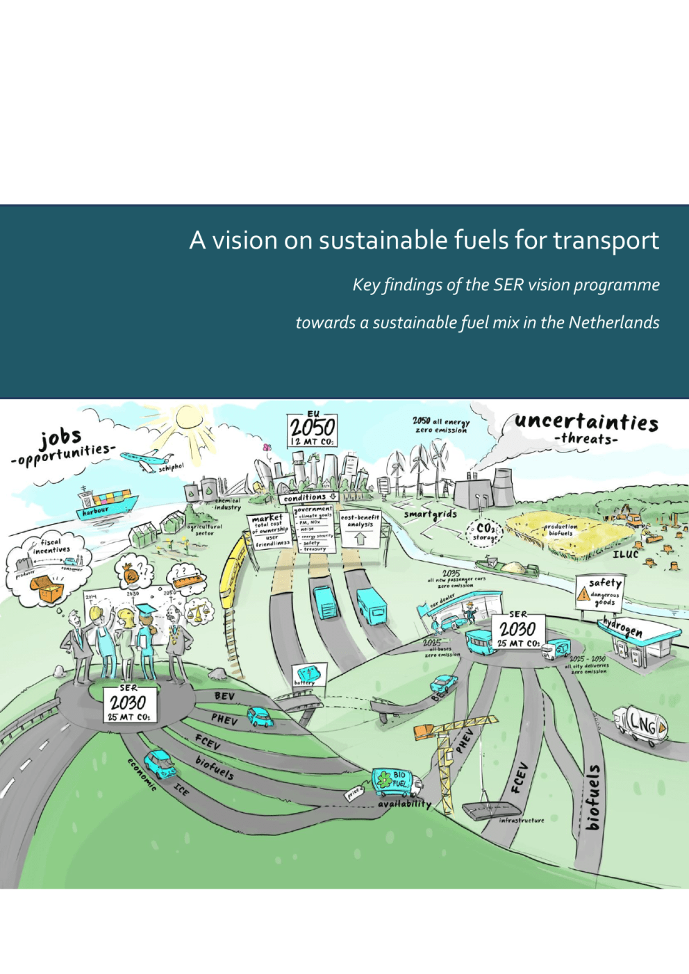 A vision on sustainable fuels for transport Key findings of the SER vision programme towards a sustainable fuel mix in the Netherlands Titel te positioneren voor foto zodanig dat deze goed leesbaar is A vision on sustainable fuels for transport A vision on sustainable fuels for transport Key findings of the SER vision programme, Towards a sustainable fuel mix for transport in the Netherlands June 2014 ii COLOPHON This publication was developed under the auspices of the Ministry of Infrastructure and the Environment In collaboration with: Stratelligence Blueconomy Cover illustration by: De Jongens van de Tekeningen Postal address: Ministry of Infrastructure and the Environment PO Box 20901 NL-2500 EX The Hague For more information: Ministry of Infrastructure and the Environment. The underlying reports that form the basis of this publication are available from the SER website: www.energieakkoordser.nl/nieuws/brandstofvisie.aspx June 2014 A vision on sustainable fuels for transport FOREWORD Within the framework of the SER Energy Agreement completed in September 2013 by the Dutch Cabinet and various stakeholders, ambitious targets in the field of energy and climate were set. Our ministry was asked to lead the development of an integrated vision and action plan for a sustainable fuelmix in the transport sector, that allows the ambitious targets for the transport sector to be met in 2020, 2030 and 2050. Demand for sustainable mobility and energy is an important topic on today’s international agenda of the European Commission, International Energy Agency, UNFCCC and other relevant international organisations. At a European level a new directive has recently been adopted (Clean Power for Transport Directive) that states that alternative fuels are urgently needed to break the over-dependence of European transport on oil. Transport in Europe is currently 94 % dependent on oil, 84 % of it being imported, with an estimated bill up to EUR 1 billion per day, and increasing costs to the environment. Research and technological development have led to successful demonstrations of alternative fuel solutions for all transport modes. Market take-up, however, requires additional policy action. The Clean Power for Transport package aims to facilitate the development of a single market for alternative fuels for transport in Europe. All Member States are required under the new Directive to provide sufficient infrastructure for alternative fuels for transport and are urged to use international co funding opportunities within the EU. This has led in the Netherlands to the development of a vision for a sustainable fuelmix for transport. A vision that inspires, connects, is realistic and provides insight in various pathways allowing the transport sector to set course for a more sustainable future. It can therefore serve as a reference framework, provides a basis for an actionplan that will be drawn up in the course of 2014 and enable a transition to a sustainable fuelmix for transport. During six sessions at the LEF Future Center, more than a hundred experts and stakeholders were challenged to look beyond their own expertise and help to clarify the anticipated development paths for road transport, rail transport, inland shipping, maritime shipping and aviation. The project team and the LEF management created an inspirational environment in which the relevant issues could be explored in depth in a number of meetings on special ‘ round tables on various fuels without compromising the integrity of our task: securing clean and economical transport for the future. The vision should integrate the various transport modalities and the targets. Whilst energy and climate targets were central to development of the vision, explicit attention was also given to air quality, health, external safety and economic opportunities. The outcome is an ambitious and realistic vision, setting out how we can achieve the objectives of the Energy Agreement for Sustainable Growth and the Climate Agenda. Although we made great progress together, some issues remain to be resolved such as the availability of biomass for the transport and the extent to which gas can be used for road transport. These and other points are on the agenda for further consideration during the action plan phase. We wish to thank all of you who contributed to the project for your invaluable input and cooperation. There is every reason to be proud of this vision that we have created together. Its publication demonstrates that all those who took part in the project realise that we must now act together and seize the opportunities in order to ensure that the Netherlands is amongst Europe’s leading nations in the field of sustainable mobility. In the autumn, we will begin the task of translating the vision into an actionplan by developing a robust package of public and private measures. We look forward to setting the next step on our pathway to sustainable mobility; drawing up those plans that will allow us to put the vision into concrete action! Els de Wit Innovation, Fuels and Infrastructure Coordinator Ministry of Infrastructure and the Environment iv A vision on sustainable fuels for transport v SUMMARY: A VISION ON SUSTAINABLE FUELS FOR TRANSPORT In the Netherlands this vision of a sustainable fuel mix has been compiled in the first half of 2014 following intensive collaboration between more than 100 organisations. Around the world, a number of major transitions are taking place with regard to energy provision (sustainability and energy conservation) and the use of fuels. This vision brings together climate-related mobility objectives and social issues relating to sustainable energy, energy conservation, green growth, living conditions (air quality and noise pollution) and safety in a global context. The driving factor in the Netherlands is the Energy Agreement signed under the auspices of the Social 1 and Economic Council (SER) in September 2013, in which ambitiou