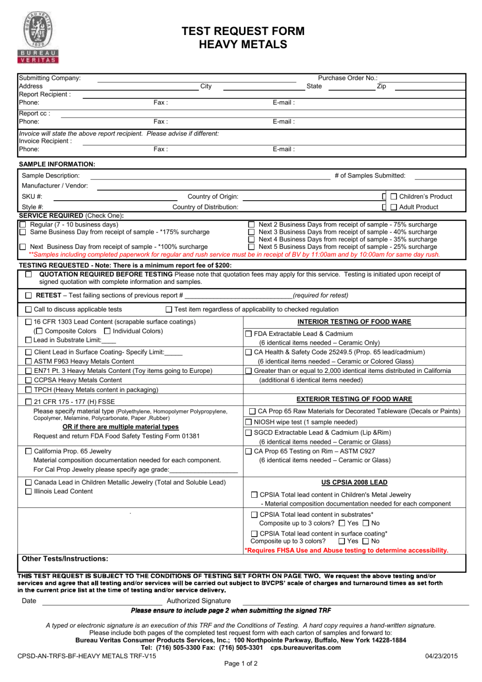 TEST REQUEST FORM HEAVY METALS Submitting Company: Address Report Recipient : Phone: Purchase Order No.: State Zip Fax : E-mail : Report cc : Phone: Fax : E-mail : City Invoice will state the above report recipient. Please advise if different: Invoice Recipient : Phone: Fax : E-mail : SAMPLE INFORMATION: Sample Description: # of Samples Submitted: Manufacturer / Vendor: SKU #: Children’s Children’s Product Product Country of Origin: Style #: Country of Distribution: SERVICE REQUIRED (Check One): Regular (7 - 10 business days) Same Business Day from receipt of sample - *175% surcharge Adult Adult Product Product Next 2 Business Days from receipt of sample - 75% surcharge Next 3 Business Days from receipt of sample - 40% surcharge Next 4 Business Days from receipt of sample - 35% surcharge Next Business Day from receipt of sample - *100% surcharge Next 5 Business Days from receipt of sample - 25% surcharge **Samples including completed paperwork for regular and rush service must be in receipt of BV by 11:00am and by 10:00am for same day rush. TESTING REQUESTED - Note: There is a minimum report fee of $200: QUOTATION REQUIRED BEFORE TESTING Please note that quotation fees may apply for this service. Testing is initiated upon receipt of signed quotation with complete information and samples. RETEST – Test failing sections of previous report # ______________________________(required for retest) Call to discuss applicable tests Test item regardless of applicability to checked regulation 16 CFR 1303 Lead Content (scrapable surface coatings) ( Composite Colors Individual Colors) Lead in Substrate Limit:____ Client Lead in Surface Coating- Specify Limit:_____ ASTM F963 Heavy Metals Content EN71 Pt. 3 Heavy Metals Content (Toy items going to Europe) CCPSA Heavy Metals Content TPCH (Heavy Metals content in packaging) 21 CFR 175 - 177 (H) FSSE Please specify material type (Polyethylene, Homopolymer Polypropylene, Copolymer, Melamine, Polycarbonate, Paper ,Rubber) OR if there are multiple material types Request and return FDA Food Safety Testing Form 01381 California Prop. 65 Jewelry Material composition documentation needed for each component. For Cal Prop Jewelry please specify age grade:___________________ Canada Lead in Children Metallic Jewelry (Total and Soluble Lead) Illinois Lead Content . INTERIOR TESTING OF FOOD WARE FDA Extractable Lead & Cadmium (6 identical items needed – Ceramic Only) CA Health & Safety Code 25249.5 (Prop. 65 lead/cadmium) (6 identical items needed – Ceramic or Colored Glass) Greater than or equal to 2,000 identical items distributed in California (additional 6 identical items needed) EXTERIOR TESTING OF FOOD WARE CA Prop 65 Raw Materials for Decorated Tableware (Decals or Paints) NIOSH wipe test (1 sample needed) SGCD Extractable Lead & Cadmium (Lip &Rim) (6 identical items needed – Ceramic or Glass) CA Prop 65 Testing on Rim – ASTM C927 (6 identical items needed – Ceramic or Glass) US CPSIA 2008 LEAD CPSIA Total lead content in Children's Metal Jewelry - Material composition documentation needed for each component CPSIA Total lead content in substrates* Composite up to 3 colors? Yes No CPSIA Total lead content in surface coating* Composite up to 3 colors? Yes No *Requires FHSA Use and Abuse testing to determine accessibility. Other Tests/Instructions: Date Authorized Signature A typed or electronic signature is an execution of this TRF and the Conditions of Testing. A hard copy requires a hand-written signature. Please include both pages of the completed test request form with each carton of samples and forward to: Bureau Veritas Consumer Products Services, Inc.; 100 Northpointe Parkway, Buffalo, New York 14228-1884 Tel: (716) 505-3300 Fax: (716) 505-3301 cps.bureauveritas.com CPSD-AN-TRFS-BF-HEAVY METALS TRF-V15 04/23/2015 Page 1 of 2 CPSD-AN-TRFS-BF-HEAVY METALS TRF-V15 04/23/2015 Page 2 of 2