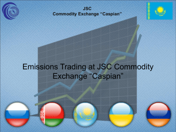 JSC Commodity Exchange ‘‘Caspian’’ Emissions Trading at JSC Commodity Exchange “Caspian” JSC Commodity Exchange “Caspian” About JSC “TBC” JSC Commodity Exchange “Caspian” (further JSC “TBC”) is registered as the legal entity on November 18, 2011 On December 30, 2011 JSC “TBC” obtained the state license No. 1000349 for the implementation of commodity exchange The first biddings on an exchange platform took place on December 30, 2011 at once after receipt of the license on agricultural products section. In January 2012, we launched an online electronic trading system and began regular trading on the section of industrial and consumer goods, agricultural products, oil and petroleum products, metals and metal products. Presently the organized commodity market becomes more and more demanded attribute in system of the market relations of domestic enterprises. Main objective of the exchange is forming of the organized commodity market providing concentration in one place of the demand and supply, and also establishment of the clear and transparent mechanism of forming of fair prices for basic commodities. The correctly organized commodity exchange building a system of guarantees of execution of transactions and helps to improve the liquidity of the commodity market, and hence the popularity of organized trade through the exchange infrastructure. From the moment of the basis of JSC “TBC” cooperates with commodity exchanges of CIS countries and foreign countries, the Kazakhstan and foreign banks, the Ministry of economic development and trade of the Republic of Kazakhstan, and also is official member of the Interexchange electronic union of the countries of EurAsEC. Our brokerage companies have the certified accreditation, and the personnel of the Exchange was trained concerning the organization of commodity exchange trading on leading exchange platforms of the world Today JSC “TBC” conducts the biddings on the principles of publicity and equality. The agreements signed at the exchange are not subject to notarial certification, and are obligatory for accomplishment by their parties in case of internal and external economic relations. Clients of the Exchange use various services of JSC “TBC”: informational, advisory and etc. JSC “TBC” takes active part in reforming of national economy, development of international economic relations, and also formation of the market relations. Computer support of the bidding process, skilled specialists, standardization of conditions and exact accomplishment of rules erects to a minimum of loss of time for the conclusion of agreements. JSC Commodity Exchange “Caspian” The system of trading and clearing Client Exchange Client Head of exchange Clearing Member of Clearing House Clearing The clearing exchange center Member of Clearing House JSC Commodity Exchange “Caspian” Structure of elements and control Public law Council of the exchange • represents members of trade The Commission on sanctions Exchange management • The current work at the exchange Market research Reporting •Permanent control The exchange Arbitration Private law Supervisory council • Shareholders Management Current work JSC Commodity Exchange “Caspian” State control and cooperation. Committee of trade of Department of Economic Affairs and budgetary planning of the Republic of Kazakhstan www.comtorg.kz JSC “Zhasyl Damu” www.zhasyldamu.kz Council of the exchange www.tbc.kz The International Arbitration Court "IUS" www.iusea.com The Law of the Republic of Kazakhstan "On Commodity Exchanges" from 03.07.2013 Resolution of the Government of the Republic of Kazakhstan on December 28, 2012 № 1707 Resolution of the Government of the Republic of Kazakhstan on December 20, 2012 № 1644 Resolution of the Government of the Republic of Kazakhstan on December 21, 2012 № 1653 Resolution of the Government of the Republic of Kazakhstan on December 6, 2012 № 1552 The ecological code of Republic of Kazakhstan (Head – 9-1); The Order of the Government Republic of Kazakhstan of December 13, 2012 No. 1588 "About approval of the National plan of distribution of quotas of emissions of greenhouse gases for 2013"; The Order of the Minister of May 11, 2012 No. 151-p "Rules of trade in quotas of emissions of greenhouse gases and carbon units"; Exchange trading rules from 10.08.2012, the Terms of trade quotas on greenhouse gas emissions and carbon credits from 01.08.2013. Law of Republic of Kazakhstan of 28.12.2004 N 22-3 "On arbitration courts" Rules of the International Arbitration Court «IUS» JSC Commodity Exchange “Caspian” The contractual framework of control Exchange • • • • • The clearing exchange center Exchange trading rules Terms of trading Code of Conduct conditions of a contract tariffs Agreement on the exchange • trade agreement Terms of nonclearing members of nonclearing participant = trader Clearing agreement Transport System Operator Registration clearing conditions Terms of clearing members Clearing member Terms and Conditions JSC Commodity Exchange “Caspian” Activization of all groups of participants Hedged bidders Hedging with futures(for example, with respect to volatile spot prices of quota) Hedging with provision of possibility of participation in favorable development of the prices on condition of an award. Arbitrage trading participants Strategy of trade in case of which in proportion incorrectly estimated tools for receipt of risk-free profitability are used. Time arbitrage: In case of time arbitrage the line item which is liquidated again by means of simultaneous transactions with derivative financial instruments, opens in certain time. Third bidder The contract is bought / sold in anticipation of changes in market prices in order to elimina te later with the benefit of the final position. Third bidders take a risk and provide liquidity support to other bidders with different views on the market.. JSC