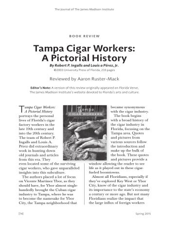 The Journal of The James Madison Institute BOOK REVIEW Tampa Cigar Workers: A Pictorial History By Robert P. Ingalls and Louis a Pérez, Jr. ©2003 University Press of Florida, 233 pages Reviewed by Aaron Ruster-Mack Editor’s Note: A version of this review originally appeared on Florida Verve, The James Madison Institute’s website devoted to Florida’s arts and culture. T ampa Cigar Workers: A Pictorial History portrays the personal lives of Florida’s cigar factory workers in the late 19th century and into the 20th century. The team of Robert P. Ingalls and Louis A. Pérez did extraordinary work in hunting down old journals and articles from this era. They even located some of the surviving cigar workers, who gave unparalleled insights into this subculture. The authors placed a lot of focus on Vicente Martinez Ybor, as they should have, for Ybor almost singlehandedly brought the Cuban cigar industry to Tampa, where he was to become the namesake for Ybor City, the Tampa neighborhood that [74] became synonymous with the cigar industry. The book begins with a broad history of the cigar industry in Florida, focusing on the Tampa area. Quotes and pictures from various sources follow the introduction and make up the bulk of the book. These quotes and pictures provide a window allowing the reader to see life as it played out in these cigarfueled boomtowns. Almost all Floridians, especially if they’ve explored Key West or Ybor City, know of the cigar industry and its importance to the state’s economy a century or more ago. But not many Floridians realize the impact that the large influx of foreign workers Spring 2015 The Journal of The James Madison Institute had on what, at the time, remained a sparsely populated state. In the U.S. Census of 1890, for instance, Florida’s population was only 391,422. Because of its proximity to Cuba and its similar climate, Key West was the first Florida city to receive Cuban immigrants. In the half century from 1840 to 1890 it went from a sleepy town with a population of less than 700 to a brief reign as Florida’s most populous (and wealthiest) city, with more than 18,000 residents. This small island city’s growth in that era was primarily due to the cigar industry. Vicente Martinez Ybor soon saw the problem inherent in such rapid growth on a small and remote island. So in 1885 he relocated, settling on a 40-acre tract of land next to Tampa, which was then a small town. Tampa’s location had two major advantages: Henry Plant’s new railroad and steamship lines connected the city to America’s populous northeast, and the tobacco fields of western Cuba were not far away. These factors made Tampa an easy choice. Vicente Ybor set off creating a city out of swampland. He built houses and businesses to cater to the workers, and he enticed other manufacturers to come by offering them cheap land and facilities. Ybor’s plan worked, and Ybor City quickly mushroomed into a boomtown of the late 19th century, growing faster than Key West. Ybor City was quickly annexed by the city of Tampa and labeled as the city’s “Latin quarter.” By 1900, it along with cigar-making rival West Tampa, became known as the “Cigar Capital of the World.” Spring 2015 This book primarily focuses on life in Ybor City, with sections on “Making Cigars,” “Early Strikes,” and “Workers at Play.” This is where real story lies, with the people who propelled this industry and the culture they brought. Authors Ingalls and Pérez note that the cigar workers at this time were quite urbane, dressing up every day and going to social clubs, yet they still remained very involved in the violent revolution happening in their homeland, just across the Straits of Florida. The cigar workers’ community was vital to their existence; indeed, many of them lived active lives outside of their factory shifts. Every afternoon the workers would change clothes and go out to dine with friends or go to one of the many social clubs. According to Ingalls and Pérez, “The clubs became centers of immigrant life with a variety of activities.” There was a social club for nearly every ethnicity, and some clubs catered to immigrants from particular Cuban cities or regions. Most of these social clubs had lavish facilities, with theaters, dining areas, and classrooms. In fact, some even had members-only hospitals. The workers could afford to lead this type of life because cigar making was one of the best-paid trades at that time. Baseball was the game of choice for the mostly Cuban population; different factories would field teams and play in very competitive leagues before large crowds. The people who worked in the factories rolling cigars didn’t let their work define them; they were active in the community [75] The Journal of The James Madison Institute and helped shape Florida to what it is today. The book includes a lot of material about labor strife in the cigar industry. Strikes became common as militant labor groups organized the workers. These unions espoused the socialist and anarchist principles that many of Tampa’s Cuban immigrants believed at this time, having left Cuba in the midst of a revolution. In the plants, lectors read to the workers as they labored away at their respective trades. In addition to reading the news of the day, some lectors passed along political propaganda. Revolutionaries, including Jose Martí occasionally visited the factories and were always welcomed by throngs of spectators. The authors point out that “[f]ew responded to Martí’s appeal with more enthusiasm than the cigar workers in Florida.” During Cuba’s fight for independence from Spanish rule, the cigar making communities of Florida were among the largest contributors to the rebels in the fight for a Cuba libre, and some were even militarily trained in Tampa and sent over as reinforcements. Tampa Cigar Workers: A Pictorial History excels in its exploration of a bygone era. Today, only 