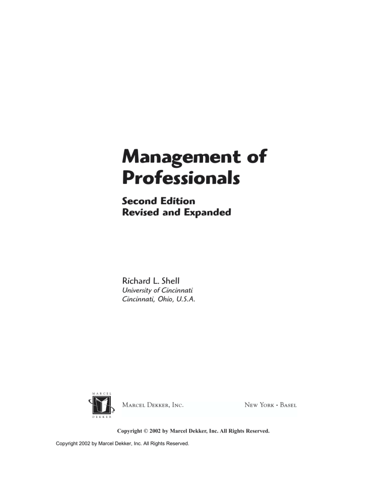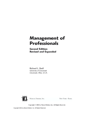 Management of Professionals Second Edition Revised and Expanded Richard L. Shell University of Cincinnati Cincinnati, Ohio, U.S.A. Marcel Dekker, Inc. New York • Basel TM Copyright © 2002 by Marcel Dekker, Inc. All Rights Reserved. Copyright 2002 by Marcel Dekker, Inc. All Rights Reserved. Cover illustration: Jimmy Seo. The first edition was published as Management of Professionals: Insights for Maximizing Cooperation, by D. D. Martin and R. L. Shell. ISBN: 0-8247-7847-2 (Marcel Dekker, 1988). ISBN: 0-8247-0829-6 This book is printed on acid-free paper. Headquarters Marcel Dekker, Inc. 270 Madison Avenue, New York, NY 10016 tel: 212-696-9000; fax: 212-685-4540 Eastern Hemisphere Distribution Marcel Dekker AG Hutgasse 4, Postfach 812, CH-4001 Basel, Switzerland tel: 41-61-260-6300; fax: 41-61-260-6333 World Wide Web http://www.dekker.com The publisher offers discounts on this book when ordered in bulk quantities. For more information, write to Special Sales/Professional Marketing at the headquarters address above. Copyright © 2003 by Marcel Dekker, Inc. All Rights Reserved. Neither this book nor any part may be reproduced or transmitted in any form or by any means, electronic or mechanical, including photocopying, microfilming, and recording, or by any information storage and retrieval system, without permission in writing from the publisher. Current printing (last digit): 10 9 8 7 6 5 4 3 2 1 PRINTED IN THE UNITED STATES OF AMERICA Copyright 2002 by Marcel Dekker, Inc. All Rights Reserved. To my longtime friend and professional colleague Desmond D. Martin, Professor of Management (1937–1990) Copyright 2002 by Marcel Dekker, Inc. All Rights Reserved. Preface This book is an outgrowth of the success of the first edition (Marcel Dekker, 1988). It was apparent from the response to that earlier work that a need existed for an updated and expanded volume designed to provide managers and professionals with tested management concepts and techniques that can be applied to increase individual and organizational effectiveness. The American work environment is increasingly composed of welleducated men and women who consider themselves professionals. Clearly, these employees have unique needs and expectations regarding how they manage and how they are managed in their working environment. The presence of global competition, world unrest, and economic changes threatens the American industrial base and offers new and greater challenges for management. The professional employee will often hold the key to whether or not these challenges are successfully met, which may in fact determine individual firm survival. Thus, it is imperative that both professionals and their managers gain a greater understanding of their mutual dependency. This book was developed to address that need. Relevant research and concepts directed at the professional work environment have been crystallized into a practical, “no-nonsense” approach to improving organizational effectiveness and bottom-line profitability. Copyright 2002 by Marcel Dekker, Inc. All Rights Reserved. I wish to thank my many friends and acquaintances from the business world, and my academic colleagues and students, who have influenced and shaped many views expressed in this book. My experience has been greatly enriched by the association with these individuals. Richard L. Shell Copyright 2002 by Marcel Dekker, Inc. All Rights Reserved. Contents Preface 1. Successfully Managing the Professional: The Challenge I. Introduction and Overview II. Who Is a Professional? III. The Special Characteristics of Professionals IV. The Professional as a Manager V. Management Defined VI. Management: An Art and a Science VII. Management Theory and Thought VIII. Emphasis of This Book 2. Planning and Forecasting for Success I. Introduction II. The Planning Process III. Strategic Planning for Long-Range Success IV. Tactical Planning for Operational Success V. Evaluation of Planning Systems and Their Results VI. Basic Forecasting Methods Copyright 2002 by Marcel Dekker, Inc. All Rights Reserved. VII. VIII. 3. Organizing and Staffing I. II. III. IV. V. VI. VII. VIII. IX. X. XI. XII. 4. Historical Development Unity of Command Division of Labor Line and Staff Successful Boundary Spanning Techniques for Professionals Professionals as Line Managers Professionals as Staff Advisors to Line Managers Span of Management Organizational Design Organizational Configurations Selection of Personnel Summary Directing and Controlling I. II. III. IV. V. VI. VII. VIII. IX. X. XI. XII. XIII. 5. Cost and Activity Indexes Summary Introduction Responsibility Authority Delegation How to Delegate Effectively Managing the Relationship with Your Boss Incentives and Motivation Wage and Salary Administration Control Systems System and Individual Performance Management Information Systems Critical Path Scheduling Summary Decision Making and Time Management I. II. III. IV. The Managerial Role in Decision Making The Decision-Making Process Systems Analysis Aids Decision Making Decision-Making Techniques Copyright 2002 by Marcel Dekker, Inc. All Rights Reserved. V. Team Decision Making and Some Common Mistakes VI. Time Management VII. Time-Compressed Management VIII. The Proactive Manager and Time Management IX. Summary 6. Individuals and Groups: Needs and Behavior in Professional Work Organizations I. II. III. IV. V. VI. 7. Building Effective Communication I. II. III. IV. V. VI. VII. VIII. IX. 8. Understanding the Professional Causes of Conflict Between Professional Employees and Organizations Culture and Status Informal Groups and Their Significance Group Decision Making Among Professionals Summary What Is Needed for Professionals Communicating with the Professional The Grapevine Nonverbal Communication Making Effective Presentations Approaches to Improving Managerial Communications Noise and Communication Barriers and Failure to Communicate Summary and Conclusions Motivating Today’s Professional I. I