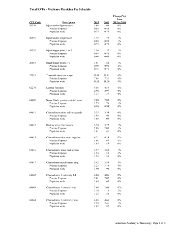 Total RVUs - Medicare Physician Fee Schedule CPT Code 20550 Descriptors Inject tendon/ligament/cyst Practice Expense Physician work 2015 1.68 0.84 0.75 2016 1.68 0.84 0.75 Change(%) from 2015 to 2016 0% 0% 0% 20551 Inject tendon origin/insert Practice Expense Physician work 1.72 0.88 0.75 1.73 0.89 0.75 1% 1% 0% 20552 Inject trigger point, 1 or 2 Practice Expense Physician work 1.56 0.84 0.66 1.57 0.84 0.66 1% 0% 0% 20553 Inject trigger points, > 3 Practice Expense Physician work 1.81 0.99 0.75 1.82 0.98 0.75 1% -1% 0% 37215 Transcath stent, cca w/eps Practice Expense Physician work 31.90 7.65 19.68 29.41 7.21 18.00 -8% -6% -9% 62270 Lumbar Puncture Practice Expense Physician work 4.56 2.98 1.37 4.53 2.97 1.37 -1% 0% 0% 64405 Nerve Block, greater occipital nerve Practice Expense Physician work 2.88 1.75 0.94 2.89 1.76 0.94 0% 1% 0% 64611 Chemodenerwation, salivary glands Practice Expense Physician work 3.35 1.92 1.03 3.34 1.92 1.03 0% 0% 0% 64612 Destroy nerve, face muscle Practice Expense Physician work 3.74 2.03 1.41 3.77 2.05 1.41 1% 1% 0% 64615 Chemodenervation musc migraine Practice Expense Physician work 4.21 1.68 1.85 4.14 1.67 1.85 -2% -1% 0% 64616 Chemodenerv musc neck dyston Practice Expense Physician work 3.57 1.54 1.53 3.62 1.58 1.53 1% 3% 0% 64617 Chemodener muscle larynx emg Practice Expense Physician work 5.42 3.23 1.90 5.59 3.10 1.90 3% -4% 0% 64642 Chemodenerv 1 extremity 1-4 Practice Expense Physician work 4.04 2.01 1.65 4.06 2.02 1.65 0% 0% 0% 64643 Chemodenerv 1 extrem 1-4 ea Practice Expense Physician work 2.68 1.16 1.22 2.66 1.18 1.22 -1% 2% 0% 64644 Chemodenerv 1 extrem 5/> mus Practice Expense Physician work 4.65 2.39 1.82 4.66 2.41 1.82 0% 1% 0% American Academy of Neurology Page 1 of 31 Total RVUs - Medicare Physician Fee Schedule CPT Code 64645 Descriptors Chemodenerv 1 extrem 5/> ea Practice Expense Physician work 2015 3.26 1.54 1.39 2016 3.28 1.56 1.39 Change(%) from 2015 to 2016 1% 1% 0% 64646 Chemodenerv trunk musc 1-5 Practice Expense Physician work 4.39 2.15 1.80 4.31 2.08 1.80 -2% -3% 0% 64647 Chemodenerv trunk musc 6/> Practice Expense Physician work 5.07 2.46 2.11 5.08 2.45 2.11 0% 0% 0% 64650 Chemodenervation, eccrine glands Practice Expense Physician work 2.22 1.40 0.70 2.21 1.38 0.70 0% -1% 0% 64653 Chemodenervation, eccrine glands Practice Expense Physician work 2.71 1.59 0.88 2.76 1.63 0.88 2% 3% 0% 67345 Destroy nerve of eye muscle Practice Expense Physician work 6.88 3.46 3.01 6.90 3.47 3.01 0% 0% 0% 70554 fMRI, brain by tech Practice Expense Professional Component Practice Expense - PC Technical Component Practice Expense - TC Physician work 12.65 10.37 3.06 0.80 9.59 9.57 2.11 12.66 10.39 3.03 0.79 9.63 9.60 2.11 0% 0% -1% -1% 0% 0% 0% 70555 fMRI, brain by phy/pshch Professional Component Practice Expense - PC Technical Component Practice Expense - TC Physician work N/A 3.69 0.94 N/A N/A 2.54 N/A 3.60 0.92 N/A N/A 2.54 N/A -2% -2% N/A N/A 0% American Academy of Neurology Page 2 of 31 Total RVUs - Medicare Physician Fee Schedule CPT Code 92540 Descriptors Vestibular testing Practice Expense Professional Component Practice Expense - PC Technical Component Practice Expense - TC Physician work 2015 2.87 1.32 2.24 0.70 0.63 0.62 1.50 2016 2.87 1.31 2.25 0.70 0.62 0.61 1.50 Change(%) from 2015 to 2016 0% -1% 0% 0% -2% -2% 0% 92541 Spontaneous nystagmus test Practice Expense Professional Component Practice Expense - PC Technical Component Practice Expense - TC Physician work 0.63 0.21 0.59 0.18 0.04 0.03 0.40 0.68 0.26 0.59 0.18 0.09 0.08 0.40 8% 24% 0% 0% 125% 167% 0% 92542 Postional syntagmus test Practice Expense Professional Component Practice Expense - PC Technical Component Practice Expense - TC Physician work 0.74 0.24 0.70 0.21 0.04 0.03 0.48 0.79 0.28 0.71 0.21 0.08 0.07 0.48 7% 17% 1% 0% 100% 133% 0% 92537 92538 Caloric vstblr test w/rec, bithermal Practice Expense Professional Component Practice Expense - PC Technical Component Practice Expense - TC Physician work 1.14 0.51 0.90 0.28 0.24 0.23 0.60 Caloric vstblr test w/rec, monothermal Practice Expense Professional Component Practice Expense - PC Technical Component Practice Expense - TC Physician work 0.58 0.26 0.45 0.14 0.13 0.12 0.30 American Academy of Neurology Page 3 of 31 Total RVUs - Medicare Physician Fee Schedule CPT Code Descriptors 2015 2016 Change(%) from 2015 to 2016 92544 Optokinetic nystagmus test Practice Expense Professional Component Practice Expense - PC Technical Component Practice Expense - TC Physician work 0.44 0.15 0.40 0.12 0.04 0.03 0.27 0.47 0.18 0.40 0.12 0.07 0.06 0.27 7% 20% 0% 0% 75% 100% 0% 92585 Brainstem Auditory EP Practice Expense Professional Component Practice Expense - PC Technical Component Practice Expense - TC Physician work 3.81 3.29 0.75 0.24 3.06 3.05 0.50 3.82 3.28 0.76 0.24 3.06 3.04 0.50 0% 0% 1% 0% 0% 0% 0% 93880 Carotid Duplex Scan Practice Expense Professional Component Practice Expense - PC Technical Component Practice Expense - TC Physician work 5.71 4.84 1.12 0.27 4.59 4.57 0.80 5.74 4.85 1.14 0.27 4.60 4.58 0.80 1% 0% 2% 0% 0% 0% 0% 93882 Carotid Duplex Scan Practice Expense Professional Component Practice Expense - PC Technical Component Practice Expense - TC Physician work 3.64 3.08 0.70 0.15 2.94 2.93 0.50 3.67 3.09 0.72 0.15 2.95 2.94 0.50 1% 0% 3% 0% 0% 0% 0% 93886 Transcranial Doppler Practice Expense Professional Component Practice Expense - PC Technical Component Practice Expense - TC Physician work 8.12 7.15 1.32 0.37 6.80 6.78 0.91 7.98 6.98 1.35 0.37 6.63 6.61 0.91 -2% -2% 2% 0% -3% -3% 0% 93888 Transcranial Doppler Practice Expense Professional Component Practice Expense - PC Technical Component Practice Expense - TC Physician work 4.22 3.68 0.72 0.19 3.50 3.49 0.50 4.17 3.62 0.73 0.19 3.44 3.43 0.50 -1% -2% 1% 0% -2% -2% 0% American Academy of Neurology Page 4 of 31 Total RVUs - Medicare Physician Fee Schedule CPT Code 93890 Descriptors TCD, vasoreactivity study Practice Expense Professional Component Practice Expense - 