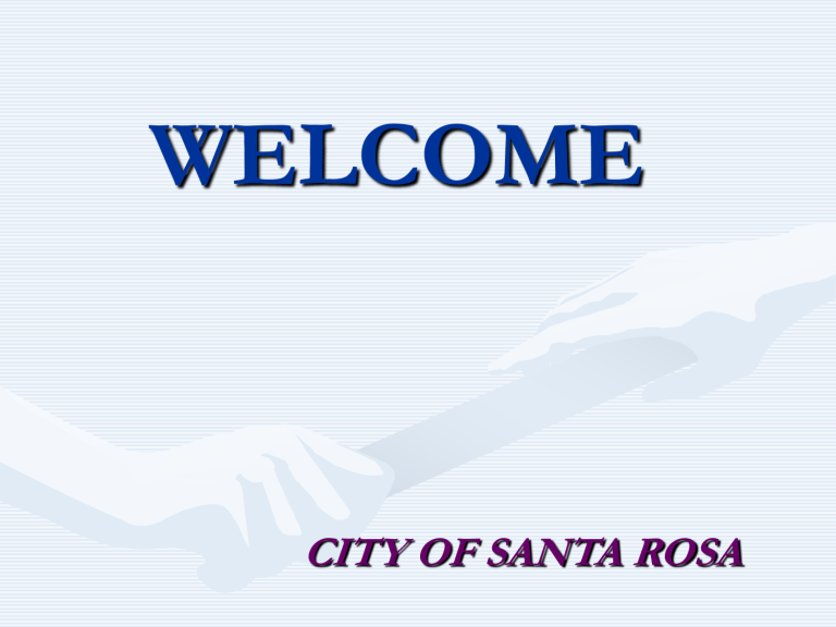 WELCOME CITY OF SANTA ROSA CITY OF SANTA ROSA IMPROVING ACCESS FOR ITS CITIZENS PRESENTED BY MAYOR BOB BLANCHARD Adoption of Update to ADA Transition Plan January 2006 • ADA Transition Advisory Committee – Forum for Citizen input on development of plan and prioritization of improvement projects. • A concise plan to keep the City’s momentum towards ADA compliance and accessibility for all citizenship. • Appointment of an ADA Coordinator to monitor the plan and respond to citizen ADA related requests and complaints. ADA Sensitivity Training For All Employees Implemented January 2007 City Adds A Total Of 80 New Curb Ramps This Year During Federal Overly Project The City will add an addition 84 Ramps under the CIP During 2007 For a total of 164 Audible Signal-Mounted Speakers Help Pedestrians Safely Cross Streets 2007 Installation of Countdown Crossing Signals with Chirpers & Improved Curb Cuts Cross Signal at 3rd & Railroad Speaks the Street Crossing Location & Includes a Tactical Raised Arrow City Bus services offers community easy access to its busses • Buses that kneel to the curb for ease of passenger loading and that eliminate steps for citizen’s with mobility challenges. City Bus Ramps Allow Citizen’s with Mobility Devices Equal Access. City Bus offers door to door services Through Paratransit Services City Councilmembers go through test for Functional Assessments for determining eligibility for ADA Paratransit Services Paratransit User Group Assists the City With Valuable Feedback Helping to Improve Services Vaughn Held, CRI Housing Access Program Manager, goes through screening process for ADA Paratransit Services before implementation of new program. Finley Aquatic Center • Parking with wide Ramps • Step Free Entrance Accessible Shower and Dressing Facilities Self-Serve Pool Ramp For Ease In Access Electric Chair Lift Therapeutic Swim Classes Steele Lane Community Center with Easy Access for all. Steele Lane Community Center adds Accessible bathrooms in 2006 Howarth Park Provides Accessible Recreation and Playground Areas Howarth Park Land of Imagination Accessible Equipment and Play Areas Land of Imagination Includes Accessible Water Works Bennett Valley Senior Center Gets T-Coil Loop System to Assist Citizen’s With Hearing Impairments Get Improved Reception From the Amplification System. Universal Design Concept Presented to Building Commissions Community Development Working with Private Business on ADA Code Enforcement Encroachment Permit Process at Work at Project on College Avenue Emergency Evacuation Training for Citizen’s with Special Needs • To get involved with the COPE program, contact us: • Citizens Organized to Prepare for Emergencies (COPE) Paul Hess, Emergency Preparedness Coordinator, City of Santa Rosa • 55 Stony Point Road, Santa Rosa, CA 9540 (707) [email protected] • For more information on preparedness visit the City of Santa Rosa web page at: http://ci.santa-rosa.ca.us/ Community Resources for Independence Honors Former Mayor Jane Bender and the City for their Efforts. In Recognition of: • • • • • • Becoming Independent Community Resources for Independence Council on Aging Earl Baum Center North Bay Regional Center Community Housing Development Corporation A Special Thanks To: • • • • • • • • Vice Mayor Lee Pierce Councilmember Jane Bender Councilmember John Sawyer Councilmember Susan Gorin Councilmember Veronica Jacobi Councilmember Mike Martini Lynne Margolies, Risk Manager City Employees Presentation Prepared by Mardell Morrison City of Santa Rosa ADA Coordinator