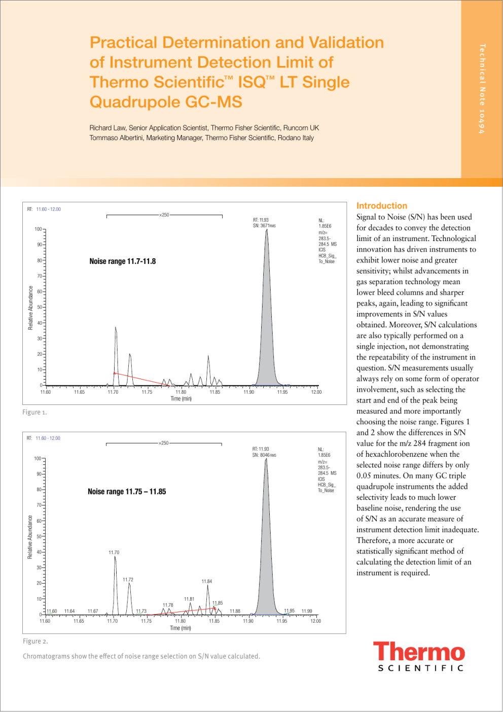 Richard Law, Senior Application Scientist, Thermo Fisher Scientific, Runcorn UK Tommaso Albertini, Marketing Manager, Thermo Fisher Scientific, Rodano Italy Introduction RT: 11.60 - 12.00 ×250 RT: 11.93 SN: 3671RMS 100 NL: 1.85E6 m/z= 283.5284.5 MS ICIS HCB_Sig_ To_Noise 90 Noise range 11.7-11.8 80 Relative Abundance 70 60 50 40 30 20 10 0 11.60 11.65 11.70 11.75 11.80 Time (min) 11.85 11.90 11.95 12.00 Figure 1. RT: 11.60 - 12.00 ×250 RT: 11.93 SN: 8046 RMS 100 NL: 1.85E6 m/z= 283.5284.5 MS ICIS HCB_Sig_ To_Noise 90 Noise range 11.75 – 11.85 80 Relative Abundance 70 60 50 40 11.70 30 11.72 20 11.84 10 11.78 11.60 0 11.60 Tech nical Note 1 0494 Practical Determination and Validation of Instrument Detection Limit of Thermo Scientific™ ISQ™ LT Single Quadrupole GC-MS 11.64 11.65 11.81 11.85 11.73 11.67 11.70 11.75 11.95 11.88 11.80 11.85 11.90 Time (min) Figure 2. Chromatograms show the effect of noise range selection on S/N value calculated. 11.95 11.99 12.00 Signal to Noise (S/N) has been used for decades to convey the detection limit of an instrument. Technological innovation has driven instruments to exhibit lower noise and greater sensitivity; whilst advancements in gas separation technology mean lower bleed columns and sharper peaks, again, leading to significant improvements in S/N values obtained. Moreover, S/N calculations are also typically performed on a single injection, not demonstrating the repeatability of the instrument in question. S/N measurements usually always rely on some form of operator involvement, such as selecting the start and end of the peak being measured and more importantly choosing the noise range. Figures 1 and 2 show the differences in S/N value for the m/z 284 fragment ion of hexachlorobenzene when the selected noise range differs by only 0.05 minutes. On many GC triple quadrupole instruments the added selectivity leads to much lower baseline noise, rendering the use of S/N as an accurate measure of instrument detection limit inadequate. Therefore, a more accurate or statistically significant method of calculating the detection limit of an instrument is required. 2 Instrument Detection Limit (IDL) One way of determining the instrumental Limit of Detection (LOD) is by using the standard deviation of the response of an analyte of choice at a concentration close to the estimated detection limit. This approach gives much more reliable LOD values as it takes into account not only the signal intensity, but also the consistency of the response. Method Detection Limits (MDL) are firmly established with many regulatory bodies and can be defined in many ways. According to the most recent U.S. Code of Federal Regulations1, MDL is defined as: “the minimum concentration of a substance that can be measured and reported with 99% confidence that the analyte concentration is greater than zero and is determined from analysis of a sample in a given matrix containing the analyte.” This methodology can be seamlessly transferred when calculating Instrument Detection Limits (IDL). Unlike MDL, the IDL uses solvent based standards containing the test chemical at concentrations that give a consistent response over several repeat injection (ex: %RSD <5). Therefore, the IDL is a statistically rigorous method that uses the precision of a measurement at low analyte levels and accurately reflects the true detection limit of an instrument, ultimately defining how sensitive an analytical system is. Simply, the IDL can be determined by using the following equation2: IDL = t * Amount * %RSD Where, t = student t-value for one-tailed distribution: for n = 8 injections; t = 2.998 Amount = amount of analyte (on-column) %RSD = relative standard deviation of the response During this study, the consistency in IDL for octafluronapthalene (OFN), a commonly used reference compound in GC-MS, was determined on three separate Thermo Scientific ISQ LT Single Quadrupole GC-MS systems using the method described above. Experimental Thermo Scientific ISQ LT Single Quadrupole GC-MS systems were used in all of the experiments, with AS 1310 Liquid Autosampler (two experiments) and a TriPlus RSH™ Autosampler (one experiment). Choosing different robotic arms on ISQs used for this test adds to the rigorosity of the experimental setup and the reduction of any potential autosampler bias. See Table 1 for detailed conditions. All experiments were performed using a 1 µL injection solution containing 10 fg/µL octafluoronaphthalene (OFN) in iso-octane. The IDL was calculated from n=8 sequential replicate injections. Table 1. GC Conditions Instrument Thermo Scientific TRACE 1310 ISQ LT Single Quadrupole GC-MS Column Thermo Scientific™ TraceGOLD™ SQC GC Column (p/n: 26070-1300) Column dimensions 15 m × 0.25 mm × 0.25 µm Injection volume 1 µL Inlet temperature 220 °C Injection Liner Thermo Scientific™ LinerGOLD™ Splitless Liner single taper with wool, 4 mm ID, 78.5 mm length (p/n: 453A0924) Injection mode Splitless Split flow rate/Splitless time 50 mL/min at 0.8 minutes Septum purge flow 5 mL/min (constant) Carrier mode Constant flow Carrier gas Helium Carrier flow 1.2 mL/min Temp. gradient 40 °C (hold for 1.0 min); ramp 30 °C/min to 150 °C; ramp 100 °C/min to 250 °C; (hold for 5 min) Total run time 10.67 min ™ ™ ™ MS Conditions Ionization mode EI, 70eV Emission Current 50 µA MS transfer line temperature 250 °C Ion source temperature 200 °C Acquisition mode Selective Ion Monitoring (SIM) m/z 272 Software (CDS) Dionex™ Chromeleon™ 7.2 Chromatography Data System Results and Discussion Three different ISQ LT Single Quadrupole GC-MS systems were evaluated using eight sequential replicate injections of a 10 fg/µL octafluoronaphthalene standard in iso-octane. The results from each instrument, along with calculated relative standard deviations from which the IDL is derived, are summarized in Table 2. The instruments used in the experiment are based in three different laboratories ar