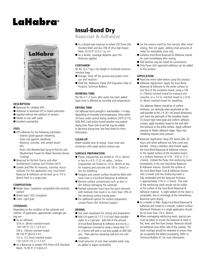 Insul-Bond Dry Basecoat & Adhesive nA s a double-layer basecoat to embed 355 Parex USA Standard Mesh and plus 358.20 Ultra High Impact Mesh: 35-55 ft2 (3.3-5.1 sq. m2) n As a leveler, coverage depends upon the thickness applied. CONTAINER: 50 lbs. (22.7 kgs.) net weight in multiwall moistureresistant bags. n Storage: Store off the ground and protect from sun and moisture n S helf life: Reference Parex USA Expiration Date of Products Technical Bulletin. DESCRIPTION: n Basecoat for LaHabra EIFS n Adhesive to laminate EPS to listed substrates n Applied without the addition of cement n Mixed on site with water n Excellent workability USES: n EPS adhesive for the following substrates: - Exterior grade gypsum sheathing - Glass mat gypsum sheathing - Masonry, concrete, and cement board - EPS - Parex USA WeatherSeal Spray & Roll-On and WeatherSeal Trowel-On Water Resistive Barrier Coatings n Basecoat for NuTech Stucco and other Architectural Coatings and Finishes (ACF). n Leveler and filler for masonry, concrete, stucco surfaces. For this application only, Insul-bond Basecoat & Adhesive can be built up to 1/4 in. (6mm) thick in a single pass. COMPOSITION: n Binder base: Copolymer compatible with portland cement n Water base: VOC-Compliant n Color: Light gray COVERAGE: Depending on the condition of the substrate and method of application, approximate coverages per bag are: n As an adhesive: 5/16 in. (8mm) notched trowel: 130-140 ft2 (12.1-13.0 m2) 5/8 in. (16mm) notched trowel: 90-100 ft2 (8.4-9.3 m2) 1/2 in. (12.7mm) notched trowel: 110-120 ft2 (10.2-11.2 m2) n As a Basecoat to embed 355 Parex USA Standard Mesh: 75-95 ft2 (7.0-8.8 m2) WORKING TIME: Pot life is 1–2 hours after water has been added. Open time is affected by humidity and temperature. DRYING TIME: Full adhesive bond strength is reachedafter 1–4 days, depending on humidity and temperature. Dries within 24 hours under normal drying conditions [70ºF (21ºC), 50% RH]. Cold and/or humid weather may extend drying time. Parex USA Accel-Pak may be added to decrease drying time. See Data sheet for more information. CLEAN-UP: Water-soluble prior to drying. Clean tools and containers with water before mixture sets. SURFACE PREPARATION: n P lanar irregularities are limited to 1/4 in. (6mm) or less in a 4 ft. (1.22 m) radius. Surface irregularities are limited to 1/4 in. (6mm) or less for masonry and concrete and 1/8 in. (3mm) or less for sheathing. n Irregular and uneven surface should be filled with Level Coat or Insul-Bond Basecoat & Adhesive. n R emove surface contaminants such as dust or dirt without damaging the substrate. n P ainted substrates must have the paint removed with methods that result in no more than 10% of the remaining surface having paint. n F or additional options for surface preparation, contact Parex USA Technical Support. MIXING: nU se clean equipment for mixing and preparation. nA dd 5-6 quarts (4.7-5.7 L) of cool clean potable water to a 5 gal pail. Add half of the amount of Insul-Bond Basecoat & Adhesive and mix to a homogenous consistency using a heavy-duty 1/2 in. (13mm) drill with a rust-free paddle at 400-500 rpm. Then add the remaining half and mix until consistent. n S mall amounts of cool clean potable water may be added to adjust workability. n Let the mixture stand for five minutes after initial mixing, then stir again, adding small amounts of water for workability once only. n LaHabra Insul-Bond Basecoat & Adhesive should be used immediately after mixing. n Half batches may be mixed for convenience. n Only Parex USA approved additives can be added to this product. APPLICATION: n Read the entire label before using this product. n Adhesive Application: Apply the Insul-Bond Basecoat & Adhesive to the entire surface on one face of the insulation board, using a 5/8 in. (16mm) notched trowel for masonry and concrete, or a 1/2-in. notched trowel or a 5/16 in. (8mm) notched trowel for sheathing. The adhesive ribbons should be of uniform thickness, run vertically when positioned on the wall (parallel to the 2 ft. [61 cm] board dimension), and reach the perimeter of the insulation board. To ensure high initial grab and uniform adhesive contact, apply insulation board to the wall with firm pressure to the entire surface. Apply sufficient pressure to flatten adhesive ridges. Glass mat sheathing requires extra pressure. n Basecoat Application: Rasp EPS board after 24 hours and when adhesive has fully cured and bonded. Using a stainless steel trowel, apply the Insul-Bond Basecoat & Adhesive mixture to the rasped surface of the insulation board to a uniform thickness of 1/16 - 3/32 in. (1.5 2.4mm). Embed the Parex USA reinforcing mesh immediately in the wet Insul-Bond Basecoat & Adhesive mixture. Smooth the surface of the Insul-Bond Base Coat & Adhesive mixture with a trowel until the reinforcing mesh is fully embedded and the basecoat thickness is approximately 1/16 in. (1.5mm). The color of the reinforcing mesh should not be visible at the surface of the Insul-Bond Basecoat & Adhesive material. A slight pattern of the mesh is acceptable, due to shrinkage of the cementitious Basecoat upon drying. n As a leveler or filler: Apply Insul-Bond Basecoat & Adhesive and trowel to a smooth, uniform surface. Maximum thickness in a single application should be no more than 1/4 in. (6mm). n When overlapping reinforcing mesh, special care must be taken to ensure the basecoat & mesh is flat, level, and free from bumps. Basecoat should be feathered onto either side of the overlap. The mesh overlaps should be reviewed to ensure they are acceptably flat before proceeding. Refer to Technical Bulletin 61 for more information. LIMITATIONS: nA mbient and surface temperature must be 40°F (4°C) or higher during application and curing time. Provide supplemental heat and protection from precipitation as needed. nU se only on surfaces that are sound, clean, dry, unpainted (10% or less) and free from any residue which may affect the ability 
