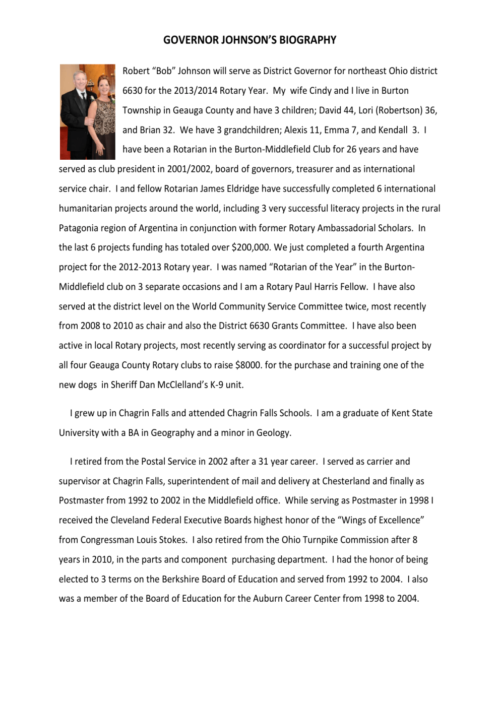 GOVERNOR JOHNSON’S BIOGRAPHY Robert “Bob” Johnson will serve as District Governor for northeast Ohio district 6630 for the 2013/2014 Rotary Year. My wife Cindy and I live in Burton Township in Geauga County and have 3 children; David 44, Lori (Robertson) 36, and Brian 32. We have 3 grandchildren; Alexis 11, Emma 7, and Kendall 3. I have been a Rotarian in the Burton-Middlefield Club for 26 years and have served as club president in 2001/2002, board of governors, treasurer and as international service chair. I and fellow Rotarian James Eldridge have successfully completed 6 international humanitarian projects around the world, including 3 very successful literacy projects in the rural Patagonia region of Argentina in conjunction with former Rotary Ambassadorial Scholars. In the last 6 projects funding has totaled over $200,000. We just completed a fourth Argentina project for the 2012-2013 Rotary year. I was named “Rotarian of the Year” in the BurtonMiddlefield club on 3 separate occasions and I am a Rotary Paul Harris Fellow. I have also served at the district level on the World Community Service Committee twice, most recently from 2008 to 2010 as chair and also the District 6630 Grants Committee. I have also been active in local Rotary projects, most recently serving as coordinator for a successful project by all four Geauga County Rotary clubs to raise $8000. for the purchase and training one of the new dogs in Sheriff Dan McClelland’s K-9 unit. I grew up in Chagrin Falls and attended Chagrin Falls Schools. I am a graduate of Kent State University with a BA in Geography and a minor in Geology. I retired from the Postal Service in 2002 after a 31 year career. I served as carrier and supervisor at Chagrin Falls, superintendent of mail and delivery at Chesterland and finally as Postmaster from 1992 to 2002 in the Middlefield office. While serving as Postmaster in 1998 I received the Cleveland Federal Executive Boards highest honor of the “Wings of Excellence” from Congressman Louis Stokes. I also retired from the Ohio Turnpike Commission after 8 years in 2010, in the parts and component purchasing department. I had the honor of being elected to 3 terms on the Berkshire Board of Education and served from 1992 to 2004. I also was a member of the Board of Education for the Auburn Career Center from 1998 to 2004.