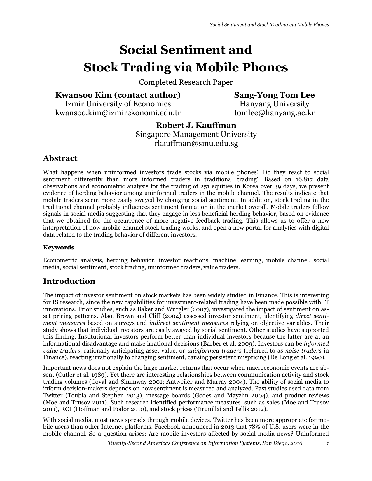 Social Sentiment and Stock Trading via Mobile Phones Social Sentiment and Stock Trading via Mobile Phones Completed Research Paper Kwansoo Kim (contact author) Izmir University of Economics [email protected] Sang-Yong Tom Lee Hanyang University [email protected] Robert J. Kauffman Singapore Management University [email protected] Abstract What happens when uninformed investors trade stocks via mobile phones? Do they react to social sentiment differently than more informed traders in traditional trading? Based on 16,817 data observations and econometric analysis for the trading of 251 equities in Korea over 39 days, we present evidence of herding behavior among uninformed traders in the mobile channel. The results indicate that mobile traders seem more easily swayed by changing social sentiment. In addition, stock trading in the traditional channel probably influences sentiment formation in the market overall. Mobile traders follow signals in social media suggesting that they engage in less beneficial herding behavior, based on evidence that we obtained for the occurrence of more negative feedback trading. This allows us to offer a new interpretation of how mobile channel stock trading works, and open a new portal for analytics with digital data related to the trading behavior of different investors. Keywords Econometric analysis, herding behavior, investor reactions, machine learning, mobile channel, social media, social sentiment, stock trading, uninformed traders, value traders. Introduction The impact of investor sentiment on stock markets has been widely studied in Finance. This is interesting for IS research, since the new capabilities for investment-related trading have been made possible with IT innovations. Prior studies, such as Baker and Wurgler (2007), investigated the impact of sentiment on asset pricing patterns. Also, Brown and Cliff (2004) assessed investor sentiment, identifying direct sentiment measures based on surveys and indirect sentiment measures relying on objective variables. Their study shows that individual investors are easily swayed by social sentiment. Other studies have supported this finding. Institutional investors perform better than individual investors because the latter are at an informational disadvantage and make irrational decisions (Barber et al. 2009). Investors can be informed value traders, rationally anticipating asset value, or uninformed traders (referred to as noise traders in Finance), reacting irrationally to changing sentiment, causing persistent mispricing (De Long et al. 1990). Important news does not explain the large market returns that occur when macroeconomic events are absent (Cutler et al. 1989). Yet there are interesting relationships between communication activity and stock trading volumes (Coval and Shumway 2001; Antweiler and Murray 2004). The ability of social media to inform decision-makers depends on how sentiment is measured and analyzed. Past studies used data from Twitter (Toubia and Stephen 2013), message boards (Godes and Mayzlin 2004), and product reviews (Moe and Trusov 2011). Such research identified performance measures, such as sales (Moe and Trusov 2011), ROI (Hoffman and Fodor 2010), and stock prices (Tirunillai and Tellis 2012). With social media, most news spreads through mobile devices. Twitter has been more appropriate for mobile users than other Internet platforms. Facebook announced in 2013 that 78% of U.S. users were in the mobile channel. So a question arises: Are mobile investors affected by social media news? Uninformed Twenty-Second Americas Conference on Information Systems, San Diego, 2016 1 Social Sentiment and Stock Trading via Mobile Phones traders are known to lose money by trading on social signals. They are not as fast as high-frequency (HFT) traders, who trade in millisecond intervals. Investors who trade on uniformative market signals may lose out to faster arbitrageurs. Yet many investors still have become involved in trading via mobile phones. We will study what happens with stock trading when mobile phones are involved. How do uninformed traders on mobile phones react to sentiment? Do they react differently compared to traders in the traditional market? We explore the relevant theory and conduct empirical research to see what is going on. Hereafter, we will cover research related to sentiment and mobile trading, and our research objectives. We then present our data and variables, and discuss our analysis approach, and what the results it can produce. We close with a discussion of our findings, and theoretical and practical implications. Research Context The impact of investor sentiment on stock markets and sentiment posted in social media are known to influence returns and asset valuation, and information disclosure and market reactions to announcements (Baker and Wurgler 2007). Social media marketing research further suggests that consumer posting, social networks and social influence must be considered (Schweidel and Moe 2014). There is also a link between social media and various performance measures, and changes in social sentiment based on tweets posted in Twitter.com are correlated with the changes in the values of the D0w-Jones Industrial Average (DJIA) that occurred 3 or 4 days later (Bollen et al. 2011). Social media is known to predict different kinds of outcomes in the world. And sentiment is significant in predicting returns for large companies, though the effect was not observed for small firms (Brown and Cliff 2005). Mobile communications play an important role in trading stocks. The benefits are potentially large because mobile phones give clients more control over their day-to-day orders and bid-ask quotes in near real-time. Over time, investors have begun to buy and sell stocks through the mobile channel. The growth in such trading is natural due to IT advances that have made the speed and reliability between trading by phone or PC indistinguishable, though the channel is