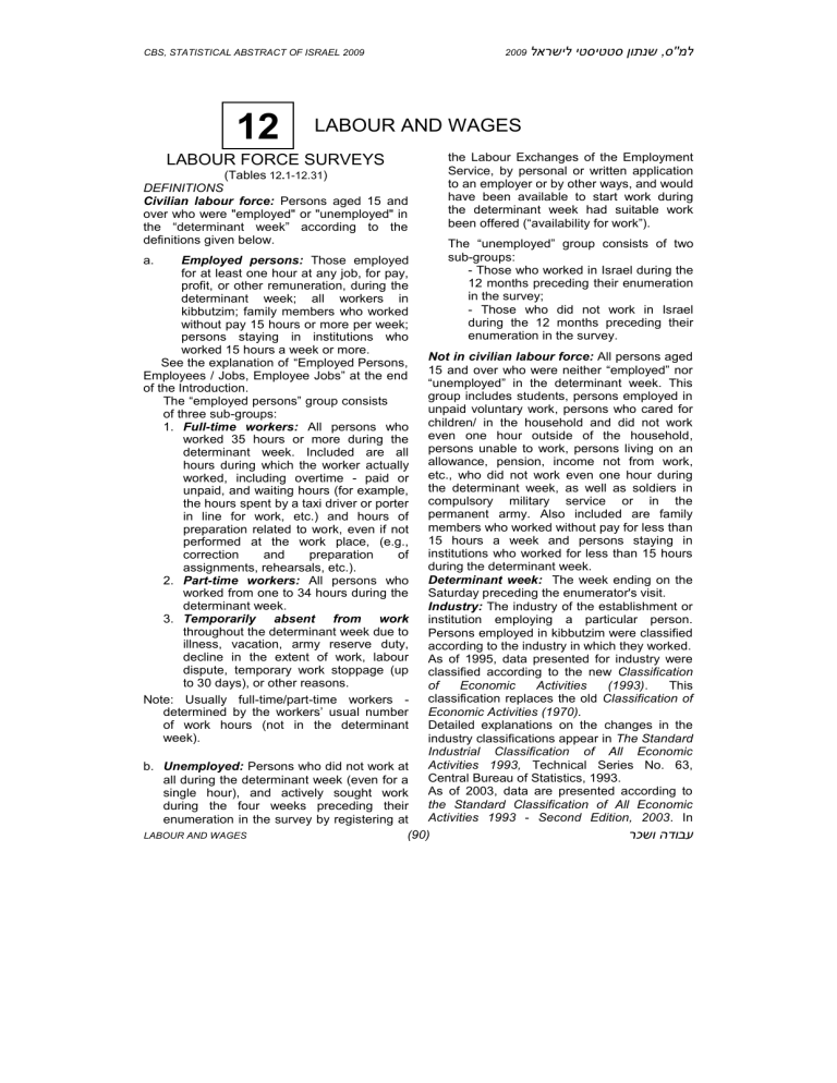 CBS, STATISTICAL ABSTRACT OF ISRAEL 2009 12 2009 שנתון סטטיסטי לישראל,למ''ס LABOUR AND WAGES the Labour Exchanges of the Employment Service, by personal or written application to an employer or by other ways, and would have been available to start work during the determinant week had suitable work been offered (“availability for work”). LABOUR FORCE SURVEYS (Tables 12.1-12.31) DEFINITIONS Civilian labour force: Persons aged 15 and over who were "employed" or "unemployed" in the “determinant week” according to the definitions given below. Employed persons: Those employed for at least one hour at any job, for pay, profit, or other remuneration, during the determinant week; all workers in kibbutzim; family members who worked without pay 15 hours or more per week; persons staying in institutions who worked 15 hours a week or more. See the explanation of “Employed Persons, Employees / Jobs, Employee Jobs” at the end of the Introduction. The “employed persons” group consists of three sub-groups: 1. Full-time workers: All persons who worked 35 hours or more during the determinant week. Included are all hours during which the worker actually worked, including overtime - paid or unpaid, and waiting hours (for example, the hours spent by a taxi driver or porter in line for work, etc.) and hours of preparation related to work, even if not performed at the work place, (e.g., correction and preparation of assignments, rehearsals, etc.). 2. Part-time workers: All persons who worked from one to 34 hours during the determinant week. 3. Temporarily absent from work throughout the determinant week due to illness, vacation, army reserve duty, decline in the extent of work, labour dispute, temporary work stoppage (up to 30 days), or other reasons. Note: Usually full-time/part-time workers determined by the workers’ usual number of work hours (not in the determinant week). The “unemployed” group consists of two sub-groups: - Those who worked in Israel during the 12 months preceding their enumeration in the survey; - Those who did not work in Israel during the 12 months preceding their enumeration in the survey. a. Not in civilian labour force: All persons aged 15 and over who were neither “employed” nor “unemployed” in the determinant week. This group includes students, persons employed in unpaid voluntary work, persons who cared for children/ in the household and did not work even one hour outside of the household, persons unable to work, persons living on an allowance, pension, income not from work, etc., who did not work even one hour during the determinant week, as well as soldiers in compulsory military service or in the permanent army. Also included are family members who worked without pay for less than 15 hours a week and persons staying in institutions who worked for less than 15 hours during the determinant week. Determinant week: The week ending on the Saturday preceding the enumerator's visit. Industry: The industry of the establishment or institution employing a particular person. Persons employed in kibbutzim were classified according to the industry in which they worked. As of 1995, data presented for industry were classified according to the new Classification of Economic Activities (1993). This classification replaces the old Classification of Economic Activities (1970). Detailed explanations on the changes in the industry classifications appear in The Standard Industrial Classification of All Economic Activities 1993, Technical Series No. 63, Central Bureau of Statistics, 1993. As of 2003, data are presented according to the Standard Classification of All Economic Activities 1993 - Second Edition, 2003. In b. Unemployed: Persons who did not work at all during the determinant week (even for a single hour), and actively sought work during the four weeks preceding their enumeration in the survey by registering at LABOUR AND WAGES )90( עבודה ושכר addition, it was found necessary to adjust some coding rules, especially in the case of establishments that engage in more than one activity. As a result, data were recoded. Occupation: Work carried out by a person at his work place, regardless of any trade he learned if he does not practice it. As of 1995, the data are presented by occupation according to the new Classification of Occupations (1994) which replaces the old Classification of Occupations (1972). Detailed explanations of the occupational classifications appear in The Standard Classification of Occupations 1994, Technical Series No. 64, Central Bureau of Statistics, 1994. Status at work: Classification by status at work distinguishes among the following groups of employed persons: Employees: Persons employed by another party in return for daily wages, monthly salary, piece-work or any other kind of remuneration. Employers: Persons employing other persons for payment or any other kind of remuneration, or business partners employing others or a farm owner employing paid farm hands. Self-employed: Persons working in their own business or farm, who do not employ others in return for payment or for other remuneration. Members of cooperatives: Members of cooperatives or cooperative societies who share financial profits in addition to their wages, including members of collective moshavim. Members of kibbutzim: Members of kibbutzim working on a kibbutz without pay (if they receive wages from the kibbutz or are employed outside of the kibbutz, they are considered as employees). Including: members, candidates for membership, relatives of members who live in kibbutzim on a permanent basis and training groups. Unpaid family members: persons who worked 15 hours or more in the determinant week in a family business, without payment or other compensation. Head of household: see definition in the Introduction to Chapter 5 - Households - LABOUR AND WAGES paragraph Economic and housing characteristics. Religion and Population group: The head of the 