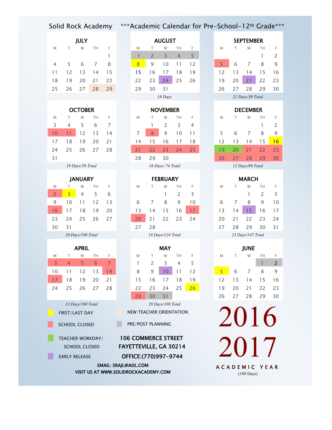 Solid Rock Academy ***Academic Calendar for Pre-School-12th Grade*** JULY M T W AUGUST TH SEPTEMBER F M T W TH F 1 1 2 3 4 5 M T W TH F 1 2 4 5 6 7 8 8 9 10 11 12 5 6 7 8 9 11 12 13 14 15 15 16 17 18 19 12 13 14 15 16 18 19 20 21 22 22 23 24 25 26 19 20 21 22 23 25 26 27 28 29 29 30 31 26 27 28 29 30 18 Days OCTOBER 21 Days/39 Total NOVEMBER M T W TH F 3 4 5 6 7 10 11 12 13 14 17 18 19 20 24 25 26 27 DECEMBER T W TH F 1 2 3 4 7 8 9 10 11 5 6 21 14 15 16 17 18 12 28 21 22 23 24 25 19 28 29 30 26 31 M 19 Days/58 Total M 16 Days/ 74 Total JANUARY T TH F 1 2 7 8 9 13 14 15 16 20 21 22 23 27 28 29 30 12 Days/86 Total FEBRUARY M T W TH F 2 3 4 5 6 M T W MARCH W TH F 1 2 3 M T W TH F 1 2 3 9 10 11 12 13 6 7 8 9 10 6 7 8 9 10 16 17 18 19 20 13 14 15 16 17 13 14 15 16 17 23 24 25 26 27 20 21 22 23 24 20 21 22 23 24 28 29 30 31 30 31 27 20 Days/106 Total 28 APRIL M T W 27 18 Days/124 Total 23 Days/147 Total MAY TH F M T W JUNE TH F M T W TH F 3 4 5 6 7 1 2 3 4 5 1 2 10 11 12 13 14 8 9 10 11 12 5 6 7 8 9 17 18 19 20 21 15 16 17 18 19 12 13 14 15 16 24 25 26 27 28 22 23 24 25 26 19 20 21 22 23 30 31 26 27 28 29 30 29 13 Days/160 Total 20 Days/180 Total FIRST/LAST DAY NEW TEACHER ORIENTATION SCHOOL CLOSED PRE/POST PLANNING TEACHER WORKDAY/ SCHOOL CLOSED EARLY RELEASE 106 COMMERCE STREET FAYETTEVILLE, GA 30214 OFFICE:(770)997-9744 EMAIL: [email protected] VISIT US AT WWW.SOLIDROCKACADEMY.COM 2016 2017 ACADEMIC (180 Days) YEAR