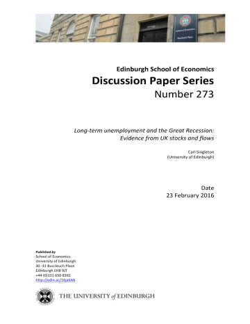 Edinburgh School of Economics Discussion Paper Series Number 273 Long-term unemployment and the Great Recession: Evidence from UK stocks and flows Carl Singleton (University of Edinburgh) Date 23 February 2016 Published by School of Economics University of Edinburgh 30 -31 Buccleuch Place Edinburgh EH8 9JT +44 (0)131 650 8361 http://edin.ac/16ja6A6 Long-term unemployment and the Great Recession: Evidence from UK stocks and flows* Carl Singleton University of Edinburgh 23rd February 2016 Abstract Long-term unemployment more than doubled during the UK’s Great Recession. Only a small fraction of this persistent increase can be explained by the changing composition of the unemployment pool. Aggregate exit rates from unemployment exhibit negative duration dependence. A stocks-flows decomposition, which allows for this fact in a limited way, indicates the importance of participation flows, especially from unemployment to inactivity, in accounting for long-term unemployment’s recessionary rise. How changes in transition rates contributed to this rise suggests a general shift in the labour force attachment of the long-term unemployed, which cannot be accounted for by observable characteristics. Key words: Long-term unemployment, Worker flows, Labour force participation, Great Recession JEL: E24, E32, J64 * [email protected]; with thanks to the Economic and Social Research Council for funding support; I am grateful for helpful comments from Mike Elsby, Giovanni Razzu, Daniel Schaefer and Andy Snell. The data used in this paper are accessible from the UK Data Service, having been collected by the Office for National Statistics (ONS). Neither the collectors of the data nor the Data Service bear any responsibility for the analysis and discussion of results in this paper. For the latest version, associated data and replication files see http://carlsingletoneconomics.com/research. 1. Introduction The main aim of this paper is to describe how the persistent rise in long-term unemployment (LTU) during the UK’s Great Recession came about (see Figure 1).1 This countercyclical rise in average duration, which typically persists even after unemployment has begun to fall rapidly, has long been of interest to those studying European labour markets.2 Renewed international interest has been driven by the significant and less usual rise in US unemployment durations since the 2008-09 downturn, where LTU rose to its highest post-war level and persisted even after short-term unemployment had largely subsided.3 Using the Labour Force Survey (LFS), I first discuss how much of the UK pattern in Figure 1 can be accounted for by only the changing nature of the unemployment pool over relevant observable characteristics. I then exploit the longitudinal aspect of this survey to study the contributions to the cyclical increase in LTU from changes in the transition rates across employment, inactivity and unemployment durations. [Figure 1 about here.] I find that the rise in LTU from 2007 to its peak in 2010-13, and its share of the unemployed, cannot be explained in any large part by changes in the prevalence of observable characteristics amongst those looking for work: including the industry, occupation and reasons for leaving previous employment, and whether an individual was most recently otherwise employed or out of the labour force. This mirrors similar results from Kroft et al. (2016) for the US over the same period. A notable recent literature has added to earlier work by Clark & Summers (1979) highlighting the cyclical importance of fluidity at the participation margin. Elsby, Hobijn, & Şahin (2015) (henceforth referred to as EHS) have demonstrated that a third of historical US unemployment rate variation can be accounted for by the cumulative influence of monthly changes in the transition hazard rates between unemployment and inactivity. Applications of their methodology to flows estimates obtained from the UK’s LFS have demonstrated that this result generalises to the UK, for a period including the Great Recession (Borowczyk-Martins & Lalé, 2014; Razzu & Singleton, 2016). Specifically for long-term unemployment changes, Krueger et al. (2014) & Kroft et al. (2016) have identified the importance of 1 Throughout this paper, and as most commonly defined in the UK, this refers to those unemployed and looking for work for at least twelve months. 2 See for a comprehensive review Machin & Manning (1999). 3 Examples include Elsby, Hobijn, Sahin, & Valletta (2011a); Kroft, Lange, & Notowidigdo (2013); Krueger, Cramer, & Cho (2014); Eriksson & Rooth (2014); Faberman & Kudlyak (2014) and Kroft, Lange, Notowidigdo, & Katz (2016). 1 cyclical patterns in participation flows using calibrated matching models. Both find that allowing for duration dependence in exit rates to employment, and transitions between inactivity and unemployment, are crucial in matching the rise and level of US LTU post 2008. Instead of similarly calibrating these models to the UK labour market, I explore thoroughly the underlying flows data and how they have determined patterns of LTU over the past two decades.4 To preview the results, aggregate transition rates from unemployment exhibit substantial negative duration dependence.5 These rates are estimated under various assumptions to check for robustness of later results in the presence of potential measurement errors and time aggregation bias. I extend EHS’s stocks-flows decomposition from three to five labour market states: employment, short, medium and long-term unemployment, and inactivity. The advantage of this method is not relying on an assumption of the labour market being at or close to its steady state at all times, which would be unreasonable when unemployment is disaggregated into its less dynamic long-term component. Flows at the margin between inactivity and unemployment are important in explaining LTU’s rise since 2008 and account for as much as half of its variation since 1998. 