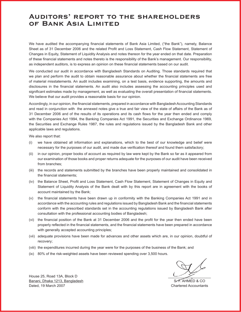 Auditors’ report to the shareholders of Bank Asia Limited We have audited the accompanying financial statements of Bank Asia Limited, (“the Bank”), namely, Balance Sheet as of 31 December 2006 and the related Profit and Loss Statement, Cash Flow Statement, Statement of Changes in Equity, Statement of Liquidity Analysis and notes thereon for the year ended on that date. Preparation of these financial statements and notes thereto is the responsibility of the Bank’s management. Our responsibility, as independent auditors, is to express an opinion on these financial statements based on our audit. We conducted our audit in accordance with Bangladesh Standards on Auditing. Those standards required that we plan and perform the audit to obtain reasonable assurance about whether the financial statements are free of material misstatements. An audit includes examining, on a test basis, evidence supporting, the amounts and disclosures in the financial statements. An audit also includes assessing the accounting principles used and significant estimates made by management, as well as evaluating the overall presentation of financial statements. We believe that our audit provides a reasonable basis for our opinion. Accordingly, in our opinion, the financial statements, prepared in accordance with Bangladesh Accounting Standards and read in conjunction with the annexed notes give a true and fair view of the state of affairs of the Bank as of 31 December 2006 and of the results of its operations and its cash flows for the year then ended and comply with the Companies Act 1994, the Banking Companies Act 1991, the Securities and Exchange Ordinance 1969, the Securities and Exchange Rules 1987, the rules and regulations issued by the Bangladesh Bank and other applicable laws and regulations. We also report that: (i) we have obtained all information and explanations, which to the best of our knowledge and belief were necessary for the purposes of our audit, and made due verification thereof and found them satisfactory; (ii) in our opinion, proper books of account as required by law were kept by the Bank so far as it appeared from our examination of those books and proper returns adequate for the purposes of our audit have been received from branches; (iii) the records and statements submitted by the branches have been properly maintained and consolidated in the financial statements; (iv) the Balance Sheet, Profit and Loss Statement, Cash Flow Statement, Statement of Changes in Equity and Statement of Liquidity Analysis of the Bank dealt with by this report are in agreement with the books of account maintained by the Bank; (v) the financial statements have been drawn up in conformity with the Banking Companies Act 1991 and in accordance with the accounting rules and regulations issued by Bangladesh Bank and the financial statements conform with the prescribed standards set in the accounting regulations issued by Bangladesh Bank after consultation with the professional accounting bodies of Bangladesh; (vi) the financial position of the Bank at 31 December 2006 and the profit for the year then ended have been properly reflected in the financial statements, and the financial statements have been prepared in accordance with generally accepted accounting principles; (vii) adequate provisions have been made for advances and other assets which are, in our opinion, doubtful of recovery; (viii) the expenditures incurred during the year were for the purposes of the business of the Bank; and (ix) 80% of the risk-weighted assets have been reviewed spending over 3,500 hours. House 25, Road 13A, Block D Banani, Dhaka 1213, Bangladesh Dated, 19 March 2007 _____________________ S. F. AHMED & CO Chartered Accountants Balance Sheet at 31 December 2006 PROPERTY AND ASSETS Notes Amounts in Taka At At 31 Dec 2006 31 Dec 2005 Cash: In hand (including foreign currencies) With Bangladesh Bank and its agent bank (s) (including foreign currencies) 3 1,783,705,469 196,512,343 1,587,193,126 759,561,720 105,054,105 654,507,615 Balance with other banks and financial institutions 4 398,705,122 366,819,473 In Bangladesh 4.1 76,773,874 36,659,948 Outside Bangladesh 4.2 321,931,248 330,159,525 1,104,617,231 Money at call and on short notice 5 1,057,723,074 Investments 6 3,345,326,162 2,256,278,942 3,122,313,318 2,152,152,008 223,012,844 104,126,934 22,255,639,992 17,869,844,542 Government Securities Others Loans and advances Loans, cash credits, overdrafts, etc 7 19,924,120,775 15,252,372,045 Bills purchased and discounted 8 2,331,519,217 2,617,472,497 Fixed assets including assets taken on lease 9 483,472,109 442,167,364 Other assets 10 1,153,865,614 580,675,356 - - 30,478,437,542 23,379,964,628 Non-banking assets Total Assets LIABILITIES AND CAPITAL Liabilities Borrowings from other banks, financial institutions, and agents 11 370,000,000 1,350,000,000 Deposits and other accounts 12 25,289,359,376 18,500,070,655 2,551,677,212 210,873,646 1,773,130,259 20,753,678,259 1,983,287,400 296,085,857 1,176,495,618 15,044,201,780 2,869,336,780 1,962,911,904 28,528,696,156 21,812,982,559 1,116,000,000 545,247,108 279,000,000 330 9,493,948 930,000,000 351,826,300 186,000,000 330 93,000,000 6,155,439 1,949,741,386 30,478,437,542 1,566,982,069 23,379,964,628 Current deposits and other accounts Bills payable Savings bank deposits Fixed deposits/Term deposits Other liabilities 13 Total Liabilities Capital/Shareholders’ Equity Paid-up capital Statutory reserve Proposed issue of bonus shares Share premium Proposed cash dividend Retained earnings Total Shareholders’ Equity Total Liabilities and Shareholders’ Equity 14 15 16 Amounts in Taka At At 31 Dec 2006 31 Dec 2005 Off-Balance Sheet items at 31 December 2006 Notes Contingent liabilities 17 Acceptances and endorsements - - Letters of guarantee 17.1 1,581,337,137 1,513,007,722 Irrevocable letters of credit 17.2 2,665,102,330 2,011,380,036 Bills for collection 1,382,078,088 1,437,722,959 Other co