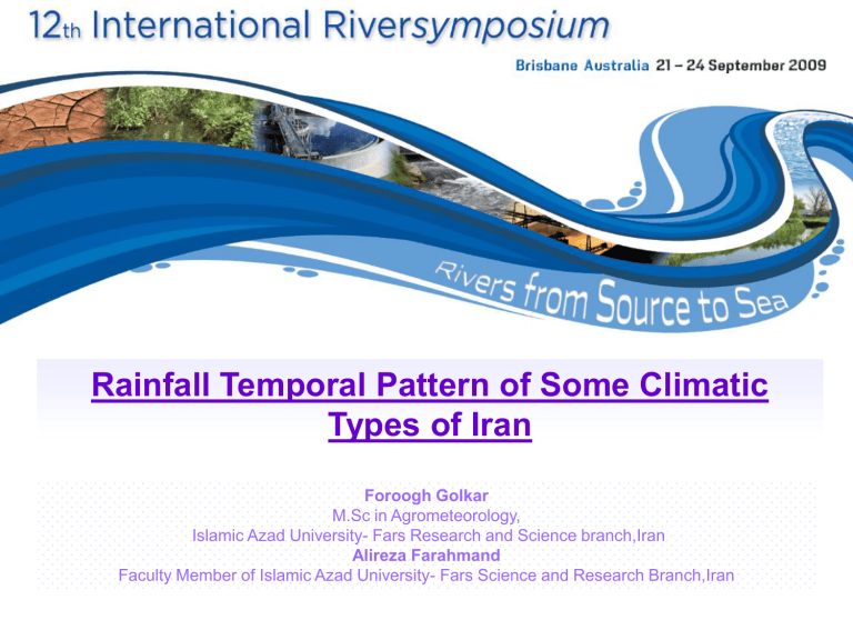 Rainfall Temporal Pattern of Some Climatic Types of Iran Foroogh Golkar M.Sc in Agrometeorology, Islamic Azad University- Fars Research and Science branch,Iran Alireza Farahmand Faculty Member of Islamic Azad University- Fars Science and Research Branch,Iran Introduction Rainfall temporal distribution pattern is an important factor in irrigation and drainage, watershed management, damming, civil engineering, soil erosion and flood potential studies. There are several different methods in temporal distribution pattern study. one usual method is based on observed data, which means barometer storm data study, of different stations. This research is based on this method. Materials and methods Bam, Shiraz, Tehran and Gorgan are four selected stations with sever arid to semi humid climate (base on Domartan classification). Some stations’ rainfall information during the statistical period is shown in table 1. Table 1: registered storms in studied stations Threshold or minimum of rainfall amount in each station, for being studied, defined as the rain amount with more than 50% frequency in cumulative frequency of received water. Received water in each class (table2)gained by each class frequency multiply by each middle class amount (storm amount classification has classes with 5 mm length). Cumulative frequency of received water of each class estimated and 50% frequency of it gained as threshold or minimum of rainfall amount. Table 3 is the example of this process for Bam station. The minimum accepted rainfall for bam, Tehran, Shiraz and Gorgan estimated as 7,10,12.5, and 10 mm respectively. table3: Recived water and storm amount relative frequency inbam station Class boundaries for storm duration 1-Astrailian-American method (Pilgrim) and 2- weibull probability method (Huff) are two methods that selected for this study. Pilgrim Method: At First, selected storms (storms with more than minimum defined rainfall amount) classified by storm duration. Each storm dimensionless mass curve was drawn, which means cumulative percentage of rainfall duration from total storm duration as X value and cumulative percentage of rainfall amount from total storm amount as Y value. Then all cumulative amount of storms in each class were drawn in one coordinate system, and one average curve for each class estimated. Lagrangian Polynomials method (Fig.1) selected as appropriate method for curve interpolation in estimating average curve. Fig. 2 shows the average curves of different storms’ duration estimated in pilgrim method. sample storm cumulative amount liner interpolation and lagrangian by cumulative time diagram interpolation compartion Fig.1:observed and lagrangian estimated data compartion Fig.2:average temporal distribution rainfall pattern in different duration of selected stations. Huff Method: In Huff method, besides storm duration classification, in each class one other classification based on maximum intensity time occurrence of storm, was done. Maximum intensity time, classified into four quartile time. Each new class dimensionless mass curve was drawn. Then each storm amounts, estimated in 5% of cumulative duration step. These results arranged diminishing, and weibull probability formula was applied in different quartile of duration class, and so on 10,20,…90% probability curves was drawn. Fig.3 shows these probability curves in 12 hour storm class in Gorgan station. probability curve of 50% of different storm duration, different quartile and… was drawn to compare temporal distribution pattern of rainfall in different ways. Fig.5: different quartile probability curves of 12 hr. storm duration in Gorgan station Conclusion: 1- very high distribution of dimensionless mass curves in Pilgrim method caused the resulted average curve seems unusable and without accuracy. 2-Pilgrim average curve in studied stations seems to be independent with storm duration (being the same in all duration classes), which can’t be possible according to storm properties. 3- Huff method seems to have more harmony with storm nature, so storms with more quartile frequency suggested to be studied in management programs. 4- No simulation found in 50% probability curve in different duration, so the special probability curve suggested for special duration. 5-In Tehran and Gorgan stations 50% probability curve in different quartiles seems to be the same, so the same pattern in different quartiles just in these two stations suggested. REFRENCES 1 - Curtis, F. Gerald, and Patrick O. Wheatley, California Polytechnic University San Luis Obispo, "Applied Numerical Analysis", 6th edition, Addison-Wesley, 1997 pp 223-226 2-H ershfield, D.M., 1962, " Extreme Rainfall Relationship" , Asce ,J.of Hyd.DW Vol.88 , No.6 , Pp. 73-99 3-H uff. F.A. , 1990," Time Distribution of Heavy Rainstorm in Illinois" , Department of Energy and Natural Resources-Huff. F.A. ,and J.L., Vogel, 1976, Hydrometeorology of Heavy Rainstorm in Chicago and Northeastern Illinois Phase I _ Historical Studies : Illinois State Water Survey Report of Investigation 82,63P 4-Olsson, J.,and T. , Berndsson, ,1998," Temporal Rainfall Desegresion Based on Scaling Properties" , Water Sience Technology Volum 37,No.11, Pp703-728. 5-Pilgrim, DE.H., Kennedy, M.R., and I.A., Rowbottom, 1991," Temporal Pattern of Rainfall Bursts, Australian Rainfall and Runoff , Vol.1,Pp43-53 6- Viessman,L., Warren,J.R.,Lewis and L., Gary,1996," Introduction to Hydrology" , 4th Ed., Pp. 373-399 ts of Different Amount of Irrigation and Nitrogen on Qualitative Characteristic