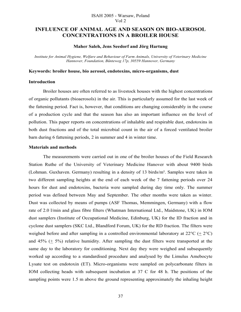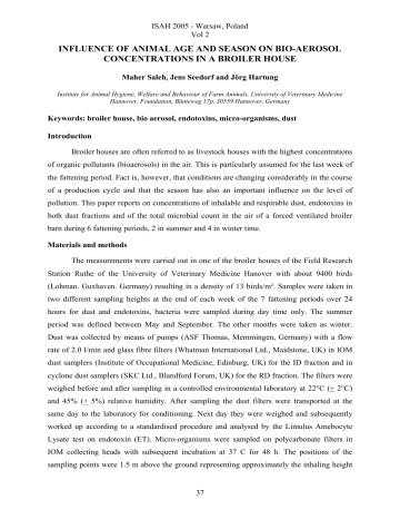 ISAH 2005 - Warsaw, Poland Vol 2 INFLUENCE OF ANIMAL AGE AND SEASON ON BIO-AEROSOL CONCENTRATIONS IN A BROILER HOUSE Maher Saleh, Jens Seedorf and Jörg Hartung Institute for Animal Hygiene, Welfare and Behaviour of Farm Animals, University of Veterinary Medicine Hannover, Foundation, Bünteweg 17p, 30559 Hannover, Germany Keywords: broiler house, bio aerosol, endotoxins, micro-organisms, dust Introduction Broiler houses are often referred to as livestock houses with the highest concentrations of organic pollutants (bioaerosols) in the air. This is particularly assumed for the last week of the fattening period. Fact is, however, that conditions are changing considerably in the course of a production cycle and that the season has also an important influence on the level of pollution. This paper reports on concentrations of inhalable and respirable dust, endotoxins in both dust fractions and of the total microbial count in the air of a forced ventilated broiler barn during 6 fattening periods, 2 in summer and 4 in winter time. Materials and methods The measurements were carried out in one of the broiler houses of the Field Research Station Ruthe of the University of Veterinary Medicine Hanover with about 9400 birds (Lohman. Guxhaven. Germany) resulting in a density of 13 birds/m². Samples were taken in two different sampling heights at the end of each week of the 7 fattening periods over 24 hours for dust and endotoxins, bacteria were sampled during day time only. The summer period was defined between May and September. The other months were taken as winter. Dust was collected by means of pumps (ASF Thomas, Memmingen, Germany) with a flow rate of 2.0 l/min and glass fibre filters (Whatman International Ltd., Maidstone, UK) in IOM dust samplers (Institute of Occupational Medicine, Edinburg, UK) for the ID fraction and in cyclone dust samplers (SKC Ltd., Blandford Forum, UK) for the RD fraction. The filters were weighed before and after sampling in a controlled environmental laboratory at 22°C (+ 2°C) and 45% (+ 5%) relative humidity. After sampling the dust filters were transported at the same day to the laboratory for conditioning. Next day they were weighed and subsequently worked up according to a standardised procedure and analysed by the Limulus Amebocyte Lysate test on endotoxin (ET). Micro-organisms were sampled on polycarbonate filters in IOM collecting heads with subsequent incubation at 37 C for 48 h. The positions of the sampling points were 1.5 m above the ground representing approximately the inhaling height 37 ISAH 2005 - Warsaw, Poland Vol 2 of humans and about 30 cm representing approximately the height of the birds. Four sampling points two in each height were installed in the buildings and one position outdoor as a control. The results at the two sampling points in each height were averaged. Results The temperatures in the broiler barn varied slightly only between winter (30 C in the first week, 19 C in 5th week) and summer season (28 C to 19 C) because of the automatic ventilation and heating system. The deviation of the temperature from the means at the sampling days never exceeded 1 C. The relative humidity, both in winter and summer time, was frequently below the recommended minimum level of 60 % for broiler houses. This was probably caused by the efficient heating devices. Table 1 summarises the results of the dust measurements in summer and winter. The arithmetic mean (a) and standard deviation (s) of the inhalable (ID) and respirable (RD) dust concentrations at the end of week 1 through to week 5 of the fattening period are given (N=12). The highest ID resp. RD concentrations were found at the end of the fattening Tab. 1: Arithmetic mean (a) and standard deviation (s) values of the inhalable (ID) and respirable (RD) dust concentrations at 4 locations measured every week at two different sampling heights and two seasons (1.5m-0.3m), N=12 Dust Sampling 1st week 2nd week 3rd week 4th week 5th week fractions height (a ± s) (a ± s) (a ± s) (a ± s) (a ± s) 1.5m 1.3± 0.13 3.6 ±0.13 4.7±0.25 5.6 ±0.01 5.4 ±0.4 Summer ID 0.3m 1.4±0.17 3.8 ±0.24 5.8±0.27 6.4±0.02 4.4±0.3 1.5m 1.4±0.01 4 ±0.15 4.8 ±0.13 9±0.06 8.1±0.3 Winter ID 0.3m 1.7±0.01 4.8±0.14 5.8 ±0.09 10 ±0.25 9.3 ±0.1 1.5m 0.4±0.05 0.7 ±0.08 0.8 ±0.25 0.7 ±0.2 0.75±0.1 Summer RD 0.3m 0.4±0.06 0.75±0.1 0.7±0.2 0.6±0.15 0.7±0.3 1.5m 0.4±0.05 0.8±0.1 0.9±0.2 1.5±0.15 1.3±0.3 Winter RD 0.3m 0.3±0.03 0.6±0.07 0.8±0.08 1.2±0.07 0.8±0.1 periods in winter, the lowest in week one. The ID concentrations in the fifth week in summer are only about half of the concentrations found in winter which is possibly due to the higher ventilation rate in summer time. The 24 h inhalable resp. respirable dust concentrations ranged between 1.3 resp. 0.4 in the first week and 5.6 resp.0.7 mg/m³ in the 4th week in summer and 1.4 resp. 0.4 to 10 resp. 1.5 mg/m³ in winter. A concentration difference exists between the two different sampling heights all over the year. The dust concentrations for ID were higher in 0.3 m than in 1.5 m sampling height. But on the other hand we observed that RD concentrations are higher in 1.5 m height than in 0.3 m high. The German OHL (occupational health limit) for ID (4 mg/m³) is regularly exceeded from the second week of the fattening periods in winter and from the third week during summer. The OHL for RD (1.5 mg/m³) is reached in winter season at the end of the fattening period. 38 ISAH 2005 - Warsaw, Poland Vol 2 The results of the measurements of the airborne micro-organisms are shown in Table 2. After the first week the bacteria concentrations remain below 1 million. However, the concentrations in summer are distinctly lower than in winter. This is a general trend. Only in the 2nd week a reverse situation was detected which could not fully explained. In the 4th week in winter the highest concentrations with up to 115 million cfu/m³ were found which coincid