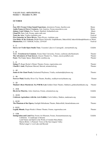 VALLEY FALL ARTS FESTIVAL October 1 – December 31, 2011 OCTOBER 1 Fuse 2011 Fresno Urban Sound Experience, downtown Fresno, fusefest.com Music Audia Fauna & Fierce Creatures, Arte America, Fresno,museshows.com Music Johnny Cash Tribute, Fox Theater, Hanford, foxhanford.com Music Cloud 99, Patio Café, Fresno, patio-café.com Music Taste the Arts, Visalia,visaliaarts.com Festival First Saturday in Three Rivers, Three Rivers, visaliainc.com Exhibits Lisa Haley & the Zydecats, Bright House Networks Amphitheatre, Bakersfield, bakersfieldamphitheatre.us Music Oktoberfest, CCC-AHSGR, Fresno, 229-8287 Festival 1–2 Sierra Art Trails Open Studio Tour, Yosemite Lakes to Coarsegold , sierraarttrails.org Exhibit 1–8 T.I.C. Trenchcoat in Common, Fresno State University, Fresno, csufresno.edu/theatrearts The Adventures of Tom Sawyer, Encore Theater Co., Tulare, encore.jctalbert.com Faust, The Empty Space, Bakersfield, esonline.org Theater Theater Theater 1–9 Stalag 17, Roger Rocka’s Dinner Theater, Fresno, rogerrockas.com Charlie’s Aunt, Playhouse Merced, Merced, artsmerced.org Theater Theater 1 – 15 James & the Giant Peach, Enchanted Playhouse, Visalia, enchantedplayhouse.org Theater 1 – 16 Forever Plaid, Reedley River City Theatre, Reedley, reedleyrivercitytheatre.org Theater 1 – 23 Madam’s Been Murdered, Tea Will Be Late Golden Chain Theatre, Oakhurst, goldenchaintheatre.org Theater 1 – 11/6 Dia de los Muertos, Artes Americas, Fresno, arteamericas.org Exhibit 1 – 11/11 Celebrate Agriculture with the Arts Exhibit, Circle Gallery, Madera, maderaarts.org Exhibit 1 - 11/12 The Phantom of the Opera, Gaslight Melodrama Theatre, Bakersfield, themelodrama.com Theater 1– 11/13 Legally Blonde, Roger Rocka’s Dinner Theater, Fresno, rogerrockas.com Theater 1 – 1/16 Immigration and Land Use, Fresno Art Museum, Fresno, fresnoartmuseum.org California: A Landscape of dreams Land Nature and Spirit in the Works of Amalia Mesa-Bains Barron Bixler: A Pastoral: Views of the San Joaquin Valley Micha Langer’s: Lost Lake and Beyond Exhibit 1 1 – 11/18 Geneva Smith & Christopher Viney, Merced Multicultural Arts Center, artsmerced.org Exhibit 2 Ken Davis, Visalia Fox Theatre, Visalia, foxvisalia.org Theater 3 Tiesto, Selland Arena, Fresno, fresnoconventioncenter.com Music 3-8 Exeter’s Fall Festival, Exeter, 559-592-2919 Exhibit 4 Keith Urban, Save Mart Center, Fresno, savemartcenter.com Music 4–7 The Pink Show, Chris Sorensen’s Gallery, Fresno, fresnoarts.net Exhibit 5 ZZ Top, Paul Paul Theater, Fresno, fresnofair.com The Doo-wah Riders, Paul Paul Theater, Fresno, fresnofair.com 51 Aces, Paul Paul Theater, Fresno, fresnofair.com Don Henley, Table Mountain casino, Fresno, tmcasino.com Fresno Assembly Center Memorial Dedication, Fair Grounds, Fresno, fresnojacl.org Music Music Music Music Event 6 ArtHop, Downtown Fresno, fresnoarthop.org Colorful History of Merced County, Merced, artsmerced.org The Green Machine, Hanford Farmers’ Market Merle Haggard, Paul Paul Theater, Fresno, fresnofair.com Mucca Pazza, Cellar Door, Visalia, cellardoorvisalia.com David Gielan, Tokyo Garden, Fresno, tokyogardenfresno.com Exhibit History Music Music Music Music 6 – 15 Rocky Horror Show, Lindsay Community Theater, lindsaycommunitytheater.com Theater 6 – 31 Juliana Harris, Fig Tree Gallery, Fresno, julianaharris.com Exhibit 7 Art Hop Hanford, kingsartcenter.org First Friday, Downtown Bakersfield, themetrogalleries.com Sick Puppies, Paul Paul Theater, Fresno, fresnofair.com Popovich Comedy Pet Theater, Visalia Fox Theatre, foxvisalia.org Un Dia Caliente, Brisa Espanola, Downtown Club, Fresno, 436-0170 Smashmouth, Chukchansi Gold Resort, Coarsegold, chukchansigold.com SJV Partnership Summit, Rabobank Arena, Bakersfield, SJVPartnershipSummit.org Exhibit Exhibits Music Theater Dance Music Community 7 – 15 The Illusion, Main Stage Theatre, Fresno, fresnocitycollege.edu Theater 7 - 23 Of Mice and Men, Ice House Theatre, Visalia, visaliaplayers.org Theater 8 Big Time Rush, Paul Paul Theater, Fresno, fresnofair.com Music 2 Miquel, Paul Paul Theater, Fresno, fresnofair.com Fall Chocolate and Wine Festival, Oakhurst, oakhurstchamber.com Exeter Fall Festival, Exeter City Park, calendar.fresnobee.com The Whiffenpoofs of Yale University (arts.ucmerced.edu) Just Like Priest, The Starline, Fresno, starline1.com Music Festival Festival Music Music 8-9 13th Annual Via Arte Italian Street Painting Festival, Bakersfield, bmoa.org Festival 8 - 11/26 Common Threads Quilt Guild, Hanford, kingsartcenter.org Exhibit 9 Los Tucanes de Tijuana, Paul Paul Theater, Fresno, fresnofair.com Matt & Kim, The Festival of Hope, Tulare Outlet Mall, snvfoundation.org Music Music 10 Jazz Composers’ Orchestra, Fresno, fresnocitycollege.edu The Family Stone, Paul Paul Theater, Fresno, fresnopfair.com Music 11 Little Anthony & the Imperials, Paul Paul Theater, Fresno, fresnofair.com Third Day, Paul Paul Theater, Fresno, fresnofair.com (fresnofair.com) Journey, Save Mart Center, Fresno, savemartcenter.com Music Music Music 13 Billy Idol, Paul Paul Theater, Fresno, fresnofair.com Music 14 Audra McDonald, Warnors Theatre, Fresno, fresnograndopera.org I Love You Because, The Voice Shop, Fresno, brownpapertickets.com Uncle Kracker, Paul Paul Theater, Fresno, fresnofair.com Oktoberfest, Rawhide Baseball Field Visalia, visaliachamber.org Incubus, Save Mart Center, Fresno, savemartcenter.com Music Theater Music Festival Music 14 – 30 Sweeny Todd, Playhouse Merced, artsmerced.org Theater 14 - 11/5 Sweeny Todd, The Spotlight Theatre, Bakersfield, thespotlighttheater.com Theater 15 Beethoven & Beyond, Fox Theatre, Visalia, tcsymphony.org Poets in the Library, Gillis Library, Fresno, fresnolibrary.org Stage Route Bus Tour,Coarsegold Historical Society – [email protected]) Mehrten Drive, Visalia Brewing Company, 734-2739 Roshon Fegan, Paul Paul Theater, Fresno, fresnofair.com Godsmack, Paul Paul Theater, Fresno, fresnofair.com Front & Center: Op