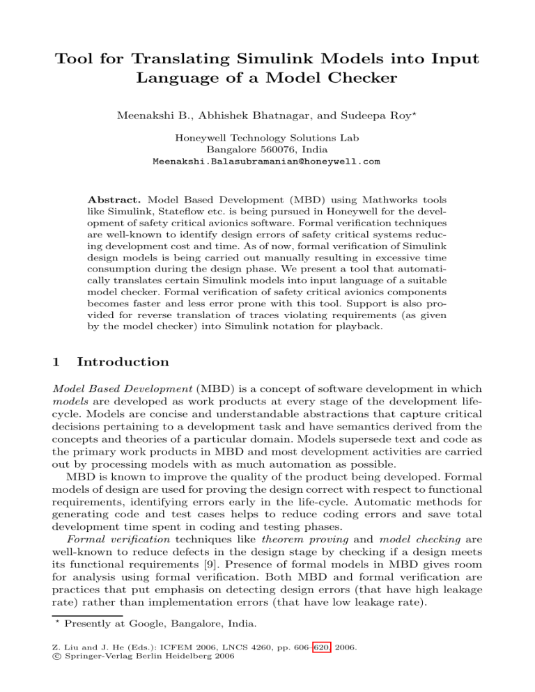 Tool for Translating Simulink Models into Input Language of a Model Checker Meenakshi B., Abhishek Bhatnagar, and Sudeepa Roy Honeywell Technology Solutions Lab Bangalore 560076, India [email protected] Abstract. Model Based Development (MBD) using Mathworks tools like Simulink, Stateflow etc. is being pursued in Honeywell for the development of safety critical avionics software. Formal verification techniques are well-known to identify design errors of safety critical systems reducing development cost and time. As of now, formal verification of Simulink design models is being carried out manually resulting in excessive time consumption during the design phase. We present a tool that automatically translates certain Simulink models into input language of a suitable model checker. Formal verification of safety critical avionics components becomes faster and less error prone with this tool. Support is also provided for reverse translation of traces violating requirements (as given by the model checker) into Simulink notation for playback. 1 Introduction Model Based Development (MBD) is a concept of software development in which models are developed as work products at every stage of the development lifecycle. Models are concise and understandable abstractions that capture critical decisions pertaining to a development task and have semantics derived from the concepts and theories of a particular domain. Models supersede text and code as the primary work products in MBD and most development activities are carried out by processing models with as much automation as possible. MBD is known to improve the quality of the product being developed. Formal models of design are used for proving the design correct with respect to functional requirements, identifying errors early in the life-cycle. Automatic methods for generating code and test cases helps to reduce coding errors and save total development time spent in coding and testing phases. Formal verification techniques like theorem proving and model checking are well-known to reduce defects in the design stage by checking if a design meets its functional requirements [9]. Presence of formal models in MBD gives room for analysis using formal verification. Both MBD and formal verification are practices that put emphasis on detecting design errors (that have high leakage rate) rather than implementation errors (that have low leakage rate). Presently at Google, Bangalore, India. Z. Liu and J. He (Eds.): ICFEM 2006, LNCS 4260, pp. 606–620, 2006. c Springer-Verlag Berlin Heidelberg 2006 Tool for Translating Simulink Models 607 DO-178B [1] standard produced by Radio Technical Commission for Aeronautics Inc. defines guidelines for development of avionics software and is the accepted means of certifying all new avionics software. DO-178B is obsolete with respect to MBD process but recognizes formal methods as a way to prevent and eliminate requirements, design and code errors throughout the development lifecycle. The benefit of formally verifying models at design stage is also validated by its successful use in various industrial examples [9]. In spite of all the above advantages, formal verification has not been successfully integrated into many development processes. The main issues are related to making it easy to use by the system engineers. Formal verification tools typically do not support standard design modeling notations but have their own notations related to the theories of the tool. The extra effort to learn the notations to use these tools is usually not welcome due to the delays it causes in development time. Consequently, there is a need to automate the formal verification process as much as possible for use by system engineers. One possible step towards automation is to make formal verification tools available in notations that system engineers typically use. Mathworks tools like Simulink [2], Stateflow [3] etc. are extensively used in Honeywell for avionics software development. For system engineers to formally verify their design, it would be ideal if these modeling tools can automatically link to suitable model checking tools. We meet such a need in this paper by developing a translator from Simulink to the model checker NuSMV [4]. NuSMV is an open source symbolic model checker jointly developed by ITC-IRST, CMU, University of Genova and University of Trento. The translator takes a Simulink model as input and generates an equivalent NuSMV model. The translator supports all the basic blocks that constitute a finite state subset of Simulink, i.e., any Simulink model obtained by putting together these blocks constitutes a finite state machine. The model generated by the translator can be formally verified against temporal logic requirements using the NuSMV model checker. We are working on providing support for specifying requirements by using a template based tool along the lines of the specification pattern system developed in [11]. These two tools put together would constitute a full-fledged verification tool for Simulink models. Some other tools have been developed for formally verifying Simulink models. Commercial tools like SCADE design verifier [8], Embedded Validator [5] support formal verification of Simulink models against safety properties and work with their customized library of Simulink blocks, again mainly blocks from the discrete library. These tools were not expressive enough to translate some of models used in Honeywell, one such model involving an avionics triplex sensor voter is presented in the paper. Checkmate [6] is a research tool developed to translate Simulink models into hybrid automata notation and verification is done using abstraction and certain semi-decision procedures involving reachability analysis of hybrid automata which are not guaranteed to terminate. Since Checkmate can translate Simulink models into hybrid automata, the translation also supports certain continuous 608 B. Meenakshi, A. Bhatnagar, a