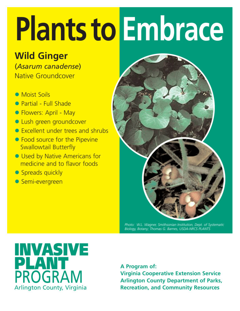 Plants to Embrace Wild Ginger (Asarum canadense) Native Groundcover z z z z z z Moist Soils Partial - Full Shade Flowers: April - May Lush green groundcover Excellent under trees and shrubs Food source for the Pipevine Swallowtail Butterfly z Used by Native Americans for medicine and to flavor foods z Spreads quickly z Semi-evergreen Photo: W.L. Wagner, Smithsonian Institution, Dept. of Systematic Biology, Botany; Thomas G. Barnes, USDA-NRCS PLANTS INVASIVE PLANT PROGRAM Arlington County, Virginia A Program of: Virginia Cooperative Extension Service Arlington County Department of Parks, Recreation, and Community Resources Plants to Embrace White Turtlehead (Chelone glabra) Native Perennial z z z z Moist - Wet Soils Full Sun - Partial Shade Flowers: July - October Nectar source for butterflies and hummingbirds z Larval food source for Baltimore Checkerspot Butterfly z Leaves used for medicine z Related species: Pink Turtlehead (C. lyonni and C. obliqua) Photo: Thomas G. Barnes, USDA-NRCS PLANTS; Steven J. Baskauf, Ph.D. Department of Biological Sciences, Vanderbilt University INVASIVE PLANT PROGRAM Arlington County, Virginia A Program of: Virginia Cooperative Extension Service Arlington County Department of Parks, Recreation, and Community Resources Plants to Embrace White Wood Aster (Eurybia divaricata) Native Perennial z z z z Moist - Dry Soils Partial - Full Shade Flowers: July - October Central disk starts yellow, ages to reddish-purple z Nectar source for butterflies z Grows well under trees and along base of hedges; good groundcover z Reseeds and spreads quickly Photos: R. Harrison Wiegand, Maryland DNR, Wildlife and Heritage Service; David G. Smith, DelawareWildflowers.org INVASIVE PLANT PROGRAM Arlington County, Virginia A Program of: Virginia Cooperative Extension Service Arlington County Department of Parks, Recreation, and Community Resources Plants to Embrace Woodland Sunflower (Helianthus divaricatus) Native Perennial z Moist - Dry Soils z Partial Sun z Flowers: July - September z Nectar for butterflies; seed for songbirds z Good for shady borders or naturalized gardens z Excellent fresh-cut flower Photo: Thomas G. Barnes. Barnes, T.G. & S.W. Francis. 2004. Wildflowers and Ferns of Kentucky. INVASIVE PLANT PROGRAM Arlington County, Virginia A Program of: Virginia Cooperative Extension Service Arlington County Department of Parks, Recreation, and Community Resources Plants to Embrace Dwarf Violet Iris (Iris verna) Native Perennial z z z z z z z z Moist - Dry Soil Partial - Full Sunlight Good groundcover Easily propagated Nectar source for butterflies Fragrant blue flowers Blooms April-May Endangered in Maryland Photo: Jim Murrain; [email protected] INVASIVE PLANT PROGRAM Arlington County, Virginia A Program of: Virginia Cooperative Extension Service Arlington County Department of Parks, Recreation, and Community Resources Plants to Embrace Wild Geranium (Geranium maculatum) Native Perennial z z z z z z Moist - Dry Soils Full Sun - Partial Shade Flowers: April - July Lavender or pink blooms Medicinal uses Nectar and seeds for butterflies, songbirds, beneficial insects z Spreads quickly Photo: Thomas G. Barnes @ USDA-NRCS PLANTS; Jennifer Anderson. Wild Cat Den State Park, Muscatine, Muscatine, IA. INVASIVE PLANT PROGRAM Arlington County, Virginia A Program of: Virginia Cooperative Extension Service Arlington County Department of Parks, Recreation, and Community Resources Plants to Embrace Beebalm / Oswego Tea (Monarda didyma) Native Perennial z Moist - Wet Soils z Full Sun - Partial Shade z Flowers: July - September z Nectar source for hummingbirds and butterflies z Leaves used for mint-flavored tea; other medicinal uses z Flowers and leaves used in potpourri; perfume source z Spreads rapidly Photo: Thomas G. Barnes. Barnes, T.G. & S.W. Francis. 2004. Wildflowers and Ferns of Kentucky. University Press of Kentucky. INVASIVE PLANT PROGRAM Arlington County, Virginia A Program of: Virginia Cooperative Extension Service Arlington County Department of Parks, Recreation, and Community Resources Plants to Embrace Virginia Creeper (Parthenocissus quinefolia) Native Climber/Groundcover z z z z z z Wet - Dry Soils Full Shade - Full Sun Flowers: June - August Brilliant autumn color Fruit: September - February Great ornamental and wildlife value z Versatile groundcover for either sun or deep shade z Nectar source and berries for song birds and small mammals z Good for steep, sunny slopes Photo: Image Archive of the University of Texas, Austin INVASIVE PLANT PROGRAM Arlington County, Virginia A Program of: Virginia Cooperative Extension Service Arlington County Department of Parks, Recreation, and Community Resources Plants to Embrace Creeping Phlox (Phlox stolonifera) Native Groundcover z Moist - Dry Soils z Partial - Full Shade z Flowers: April - June z Flower colors: white, pink, blue, purple, violet z Nectar source for butterflies and beneficial insects z Fast-spreading groundcover z Ideal under trees Photos: Tripple Brook Farm, Southampton, Mass. INVASIVE PLANT PROGRAM Arlington County, Virginia A Program of: Virginia Cooperative Extension Service Arlington County Department of Parks, Recreation, and Community Resources Plants to Embrace Wild Stonecrop (Sedum ternatum) Native Groundcover z z z z z z z Moist Soils Partial - Full Shade Flowers: April - June Sprays of 1/2” white flowers Evergreen groundcover Excellent in rock gardens Good under trees Photo: William S. Justice. Courtesy of Smithsonian Institution, Dept. of Systematic Biology, Botany; toadshade.com INVASIVE PLANT PROGRAM Arlington County, Virginia A Program of: Virginia Cooperative Extension Service Arlington County Department of Parks, Recreation, and Community Resources Plants to Embrace Golden Ragwort (Packera aurea) Native Perennial z z z z z z Moist - Wet Soils Full Sun - Full Shade Flowers: April - August Long bloom period Nectar source for butterflies Spreads quickly; can be aggressive Photo: Missouri Botanical Gar