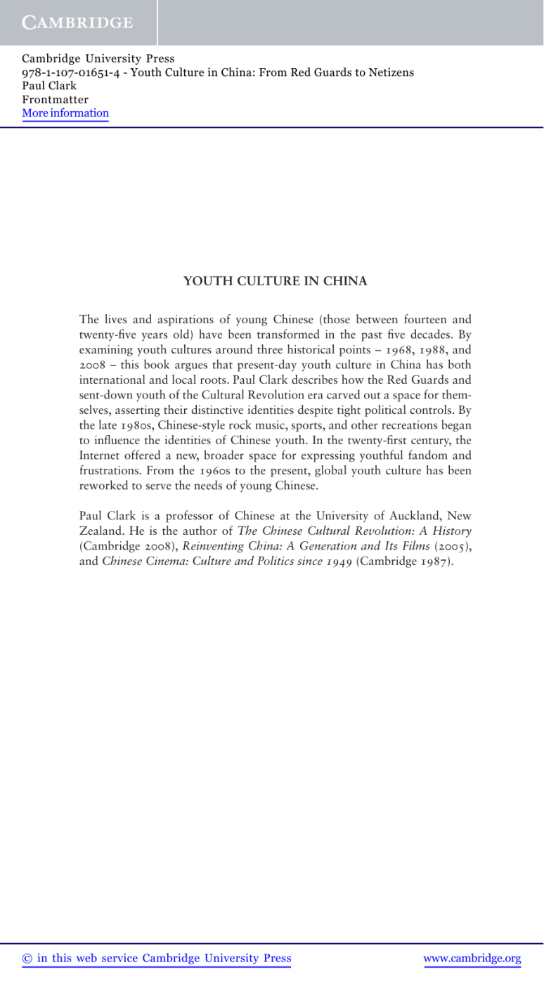 Cambridge University Press 978-1-107-01651-4 - Youth Culture in China: From Red Guards to Netizens Paul Clark Frontmatter More information Youth Culture in China The lives and aspirations of young Chinese (those between fourteen and twenty-five years old) have been transformed in the past five decades. By examining youth cultures around three historical points – 1968, 1988, and 2008 – this book argues that present-day youth culture in China has both international and local roots. Paul Clark describes how the Red Guards and sent-down youth of the Cultural Revolution era carved out a space for themselves, asserting their distinctive identities despite tight political controls. By the late 1980s, Chinese-style rock music, sports, and other recreations began to influence the identities of Chinese youth. In the twenty-first century, the Internet offered a new, broader space for expressing youthful fandom and frustrations. From the 1960s to the present, global youth culture has been reworked to serve the needs of young Chinese. Paul Clark is a professor of Chinese at the University of Auckland, New Zealand. He is the author of The Chinese Cultural Revolution: A History (Cambridge 2008), Reinventing China: A Generation and Its Films (2005), and Chinese Cinema: Culture and Politics since 1949 (Cambridge 1987). © in this web service Cambridge University Press www.cambridge.org Cambridge University Press 978-1-107-01651-4 - Youth Culture in China: From Red Guards to Netizens Paul Clark Frontmatter More information © in this web service Cambridge University Press www.cambridge.org Cambridge University Press 978-1-107-01651-4 - Youth Culture in China: From Red Guards to Netizens Paul Clark Frontmatter More information Youth Culture in China From Red Guards to Netizens Paul Clark University of Auckland, New Zealand © in this web service Cambridge University Press www.cambridge.org Cambridge University Press 978-1-107-01651-4 - Youth Culture in China: From Red Guards to Netizens Paul Clark Frontmatter More information cambridge university press Cambridge, New York, Melbourne, Madrid, Cape Town, Singapore, São Paulo, Delhi, Mexico City Cambridge University Press 32 Avenue of the Americas, New York, NY 10013-2473, USA www.cambridge.org Information on this title: www.cambridge.org/9781107602502 © Paul Clark 2012 This publication is in copyright. Subject to statutory exception and to the provisions of relevant collective licensing agreements, no reproduction of any part may take place without the written permission of Cambridge University Press. First published 2012 Printed in the United States of America A catalog record for this publication is available from the British Library. Library of Congress Cataloging in Publication data Clark, Paul, 1949– Youth culture in China : from Red Guards to netizens / Paul Clark. p. cm. Includes bibliographical references and index. ISBN 978-1-107-01651-4 (hardback) – ISBN 978-1-107-60250-2 (paperback) 1. Youth – China – History – 20th century. 2. Youth – China – History – 21st century. 3. Youth – China – Social conditions – 20th century. 4. Youth – China – Social conditions – 21st century. 5. Youth – China – Attitudes. 6. Popular culture – China. 7. Group identity – China. 8. Internet – Social aspects – China. 9. Technology and youth – Social aspects – China. I. Title. HQ799.C5C58 2012 305.235095109′04–dc23 2012002706 ISBN 978-1-107-01651-4 Hardback ISBN 978-1-107-60250-2 Paperback Cambridge University Press has no responsibility for the persistence or accuracy of URLs for external or third-party Internet Web sites referred to in this publication and does not guarantee that any content on such Web sites is, or will remain, accurate or appropriate. © in this web service Cambridge University Press www.cambridge.org Cambridge University Press 978-1-107-01651-4 - Youth Culture in China: From Red Guards to Netizens Paul Clark Frontmatter More information Contents page vi List of Illustrations ix Acknowledgments 1. Introduction: Finding Youth in China . . . . . . . . . . 1 2. Marking Out New Spaces: Red Guards, Educated Youth, and Opening Up . . . . . . . . . . . . 10 3. Bodies: Undressed, Fashioned, Admired, and Moving . . . . . . . . . . . . . . . . . . . . . . . 57 4. Rhythms: The Soundtracks of Connection and Assertion . . . . . . . . . . . . . . . . . . . . . 102 5. Spaces: Real, Imagined, and Virtual Arenas . . . . . . 142 6. Conclusion: Consuming Identities . . . . . . . . . . . 192 Notes 201 Bibliography 255 Index 285 v © in this web service Cambridge University Press www.cambridge.org Cambridge University Press 978-1-107-01651-4 - Youth Culture in China: From Red Guards to Netizens Paul Clark Frontmatter More information Illustrations 2.1. 2.2. 2.3. 2.4. 2.5. 2.6. 2.7. 3.1. 3.2. 3.3. 3.4. 3.5. 3.6. 4.1. 4.2. 4.3. Sent-down youth in a typical Cultural Revolution performance combining art and labour page 17 A militant performance drawing on Red Guard precedents 21 Sent-down youth bid farewell to city life in this propaganda shot 28 A model-opera aria sung in the fields 30 Young sent-down women dance while the men play the music 32 A sent-down youth checks her projector 45 Production still from the 1982 feature film about sent-down youth, Our Fields (Women de tianye), directed by Xie Fei, Beijing Youth Film Studio 54 The sedan carriers in Red Sorghum (Xi’an Film Studio, 1987) 60 My Grandmother addresses the distillery workers in Red Sorghum 62 Zhang Yimou (right) as a peasant youth in Old Well (directed by Wu Tianming, Xi’an Film Studio, 1986) 65 The sedan carriers in the wild sorghum in Red Sorghum 67 The November 1988 cover of Youth Times (Qingnian shidai), published by the Guizhou Communist Youth League 76 Cosplay as Western fantasy: ‘Dream in Venice’ 100 Cui Jian, the godfather of Chinese rock music 108 Tang Dynasty, a rock band formed in 1988 113 The finalists in the 2005 Supergirl contest, with Li
