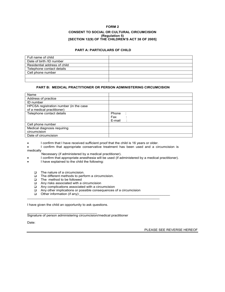 FORM 2 CONSENT TO SOCIAL OR CULTURAL CIRCUMCISION (Regulation 5) [SECTION 12(9) OF THE CHILDREN’S ACT 38 OF 2005] PART A: PARTICULARS OF CHILD Full name of child Date of birth /ID number Residential address of child Telephone contact details Cell phone number PART B: MEDICAL PRACTITIONER OR PERSON ADMINISTERING CIRCUMCISION Name Address of practice ID number HPCSA registration number (in the case of a medical practitioner) Telephone contact details Phone Fax E-mail : : : Cell phone number Medical diagnosis requiring circumcision Date of circumcision I confirm that I have received sufficient proof that the child is 16 years or older. I confirm that appropriate conservative treatment has been used and a circumcision is medically Necessary (if administered by a medical practitioner). I confirm that appropriate anesthesia will be used (if administered by a medical practitioner). I have explained to the child the following: The nature of a circumcision. The different methods to perform a circumcision. The method to be followed Any risks associated with a circumcision Any complications associated with a circumcision Any other implications or possible consequences of a circumcision Other information (if any):________________________________________________ ______________________________________________________________________ I have given the child an opportunity to ask questions. _____________________________________ Signature of person administering circumcision/medical practitioner Date: PLEASE SEE REVERSE HEREOF REVERSE SIDE OF FORM 2 PART C: CONSENT BY CHILD I, __________________________________________________________(insert name) understand that a circumcision is going to be performed on me, and that I am voluntarily undergoing this surgical procedure. understand the nature and implications as well as any risks and possible consequences of a circumcision that have been explained to me. confirm that I have been given an opportunity to ask questions. consent to a circumcision but understand that I may at any time before the procedure withdraw my consent. confirm that I have been given the opportunity to refuse the circumcision in terms of section 12(10) of the Act. _____________________________________ Signature of child Date: _____________________________________ Signature of witness Date: PART D: ASSISTANCE BY PARENT OR GUARDIAN (TO BE COMPLETED IN THE CASE OF A MALE CHILD OVER 16 YEARS BUT UNDER 18 YEARS) I, _________________________________________ (insert name) have assisted the child to consent to a circumcision and declare that the child is over the age of 16 years but under the age of 18 years and is, to the best of my knowledge, of sufficient maturity and has the mental capacity to understand the benefits, risks, social and other implications of a circumcision. I confirm that the child has been given the opportunity to refuse the circumcision in terms of Section 12(10) of the Act. ___________________________ Parent / guardian Date: