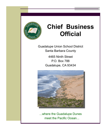 Chief Business Official Guadalupe Union School District Santa Barbara County 4465 Ninth Street P.O. Box 788 Guadalupe, CA 93434 ...where the Guadalupe Dunes meet the Pacific Ocean... “Students today, our leaders tomorrow.” INTRODUCTION Welcome and thank you for your interest in a classified management position with the Guadalupe Union School District. THE POSITION Chief Business Official (CBO) The Chief Business Official (CBO) reports to the Superintendent for the leadership of the district’s Fiscal Services. The CBO coordinates the operations of Business, Facilities Management, Maintenance, Operations and Transportation, Purchasing and Payroll. The CBO serves as a primary liaison with other governmental entities affecting the school district; arranges supplementary financing of district activities to adequately support the planning, organizing, staffing, directing, controlling, and evaluating the Fiscal Services Department. The CBO must possess in-depth knowledge of school business and fiscal services, including budget development, accounting, auditing, and the Generally Accepted Accounting Principles (GAAP). The CBO is also expected to posses strong interpersonal skills and will deliver presentations to groups such as the district’s Board of Trustees, bargaining teams, parents, etc. DISTRICT PROFILE The Guadalupe Union School District (K-8) is located on the beautiful California Central Coast, approximately 70 miles north of Santa Barbara and 32 miles south of San Luis Obispo. The city which is situated in the northwest section of Santa Barbara County has a population of approximately 7,000 residents. Guadalupe is located in the rural agricultural section of the greater Santa Maria Valley. Agriculture is the biggest industry in and around the city. Our district serves families of Guadalupe as well as families from the neighboring farms and ranches. Many students come from migrant families. The 2016 CBEDS Enrollment is 1,280 students in Kindergarten through 8th Grade. The student population is 96.72% Hispanic, 1.80% White, .47% Black, .39% Filipino, 16% Asian and .23% American Indian or Alaska Native, and .23% Other. The District has two schools: Mary Buren Elementary (K-5 Self-Contained) which staffs a Principal, Assistant Principal, 40 certificated employees and classified support staff. Kermit McKenzie Junior High School (6th –8th Departmentalized), staffs a Principal, Dean of Students, 19 certificated staff and classified support staff. DISTRICT PROGRAMS The District operates a variety of instructional programs to support and supplement core instruction, including an ASES Program and Summer School Program. School level support staff includes a psychologist, instructional assistants, campus safety assistants, outreach consultants, food service employees, and a Resource Officer to support the instructional and non-instructional programs on both campuses. The schools also have learning centers where students, staff and parents have access to books and technology. The District administrative staff includes: Director of Educational Services, Coordinator of Pupil Services, Chief Business Official, Director of Child Nutrition Services, Healthy Start Family Services Coordinator, and an ASES Coordinator. DUTIES AND RESPONSIBILITIES: The successful candidate will demonstrate the following: Provides leadership in the development and improvement of all assigned departments in such a way as to maximize student achievement and meet the Board-adopted mission, vision, goals, and objectives; Advises the Superintendent on all matters relating to the business and financial affairs of the district; Establishes and supervises a program of accounting, adequate to record in detail all financial transactions; Supervises the collection, safekeeping, and distribution of all funds; Initiates contacts with vendors relative to supply and equipment availability, comparative prices, and quality of commodities. Monitors all purchase transactions to verify approvals, correctness of information, coding information, price extensions, etc.; Prepares all bidding documents, including notices and instructions to bidders, specifications, and forms of proposal; Serves as the district resource person in the collective bargaining process for certificated and classified personnel; Attends all Board meetings, assists the Superintendent in the development of Board agenda items, and makes budgetary presentations to the Board; Analyzes and forecasts income projections and costs; oversees LCFF revenue calculations; Directs the operation of perpetual inventory systems and central warehousing and delivery operations; Assists in the planning of new facilities; manages architect and construction projects; coordinates application process with state agencies such as DSA and OPSC; assists in the development of schedules and monitors progress; develops alternatives for financing facilities as needed; Supervises pupil accounting procedures and plans for pupil projections; Supervises and/or coordinates the operations of Business, Facilities Management, Maintenance, Operations and Transportation, Purchasing, and Payroll; Plans, organizes and supervises the activities of the business office and business office staff in all aspects of fiscal accounting, payroll, risk management, finance and budget preparation; Serves as a liaison with SBCEO on budget development and reports and computerized accounting programs and upgrades; Responsible for research, development, and administration of the annual district budget and related reports; Responsible for the coordination and approval process for the use of district facilities; Coordination of the district’s annual external audit; Prepares special reports and analyzes legislation; Maintains Occupational Safety and Health Administration (OSHA) standards and procedures in handling hazardous materials and the district’s Safety Program; Develops and implements long- and short-term plans and a