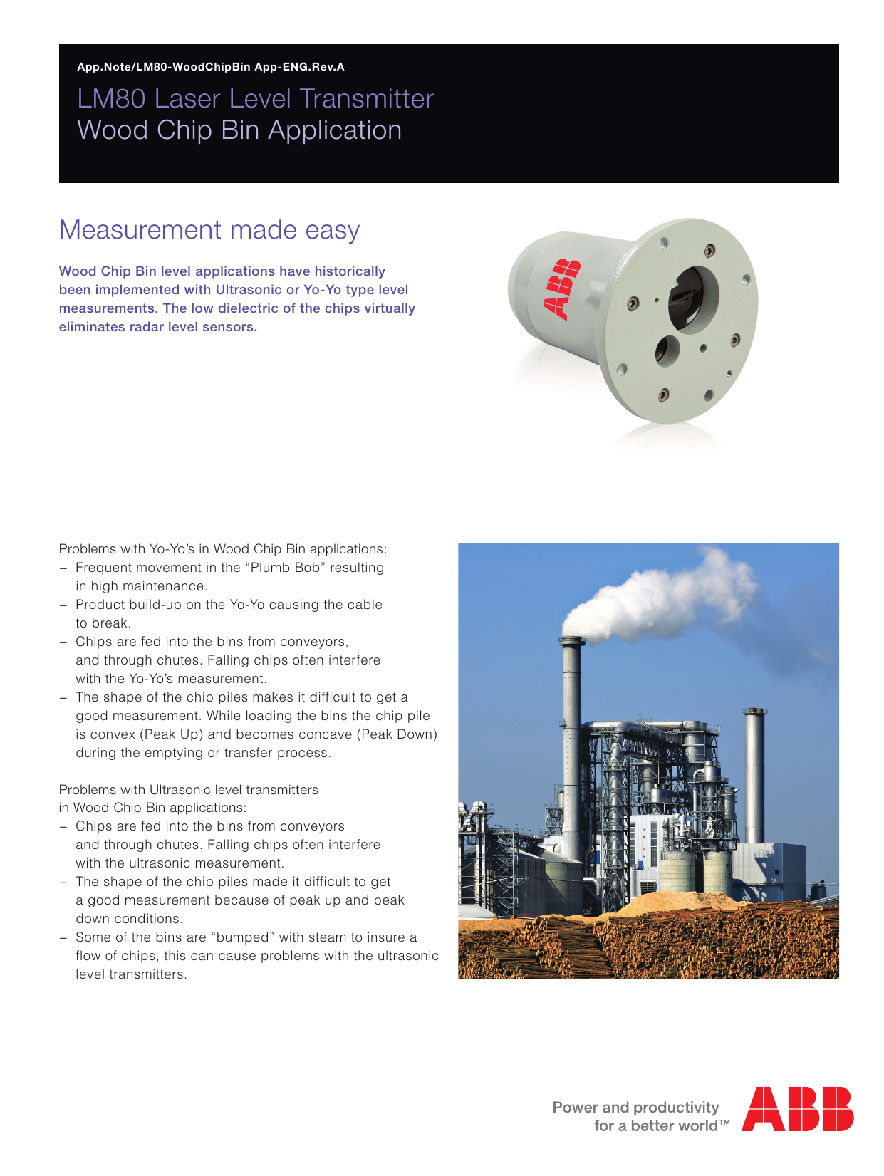 App.Note/LM80-WoodChipBin App-ENG.Rev.A LM80 Laser Level Transmitter Wood Chip Bin Application Measurement made easy Wood Chip Bin level applications have historically been implemented with Ultrasonic or Yo-Yo type level measurements. The low dielectric of the chips virtually eliminates radar level sensors. Problems with Yo-Yo’s in Wood Chip Bin applications: − − Frequent movement in the “Plumb Bob” resulting in high maintenance. − − Product build-up on the Yo-Yo causing the cable to break. − − Chips are fed into the bins from conveyors, and through chutes. Falling chips often interfere with the Yo-Yo’s measurement. − − The shape of the chip piles makes it difficult to get a good measurement. While loading the bins the chip pile is convex (Peak Up) and becomes concave (Peak Down) during the emptying or transfer process. Problems with Ultrasonic level transmitters in Wood Chip Bin applications: − − Chips are fed into the bins from conveyors and through chutes. Falling chips often interfere with the ultrasonic measurement. − − The shape of the chip piles made it difficult to get a good measurement because of peak up and peak down conditions. − − Some of the bins are “bumped” with steam to insure a flow of chips, this can cause problems with the ultrasonic level transmitters. ABB LM80 Lasers level transmitters have been successfully applied to the measurement of Wood Chip levels. Commonly a span of from 1 to 3 meters (2 to 10 feet) is utilized. The feeder is started and stopped on a high and low signal generated in the controls system. An additional advantage of the LM80 is the ability to locate and mount the units in locations easy to maintain (off to the side and at a distance from the top of the bin). This allows for easy access in the event that adjustments to spans, outputs or checking of target and loop outputs are required or desired. The LM80 has been tested in both the main and surge bins. Customers often put the first units on Surge Bins where maintaining the level in most critical. ABB Analytical Measurements Level Products 585 Charest Boulevard East, Suite 300 Quebec, (Quebec) G1K 9H4 Canada Phone: +1 418 877-8111 1 800 858-3847 (North America) Fax: +1 418 877-2834 E-Mail: [email protected] www.abb.com/level Note We reserve the right to make technical changes or modify the contents of this document without prior notice. With regard to purchase orders, the agreed particulars shall prevail. ABB does not accept any responsibility whatsoever for potential errors or possible lack of information in this document. We reserve all rights in this document and in the subject matter and illustrations contained therein. Any reproduction, disclosure to third parties or utilization of its contents - in whole or in parts – is forbidden without prior written consent of ABB. Copyright© 2013 ABB All rights reserved Sales Wood chip bins can be found at Pulp and Paper facilities, wood panel manufacturers and power plants that have been converted to burn Biomass instead of coal. Should you have any question about wood chip bin applications, please do not hesitate to contact PMU Quebec Team at [email protected]. Service App.Note/LM80-WoodChipBin App-ENG.Rev.A The solution is an ABB LM80 Laser level transmitter laser pointer. − − The pointer allows the customer to choose the exact point where the level is to be measured. − − The concave/convex problem can be measured to eliminate false levels that are prevalent with Ultrasonic level transmitters and Yo-Yo’s. − − The very bottom of the bin can be targeted allowing a reliable “Bin Empty” alarm during shutdowns. − − There are no moving parts. − − The shape of the bins have no impact on laser measurement. 06.2013 Contact us