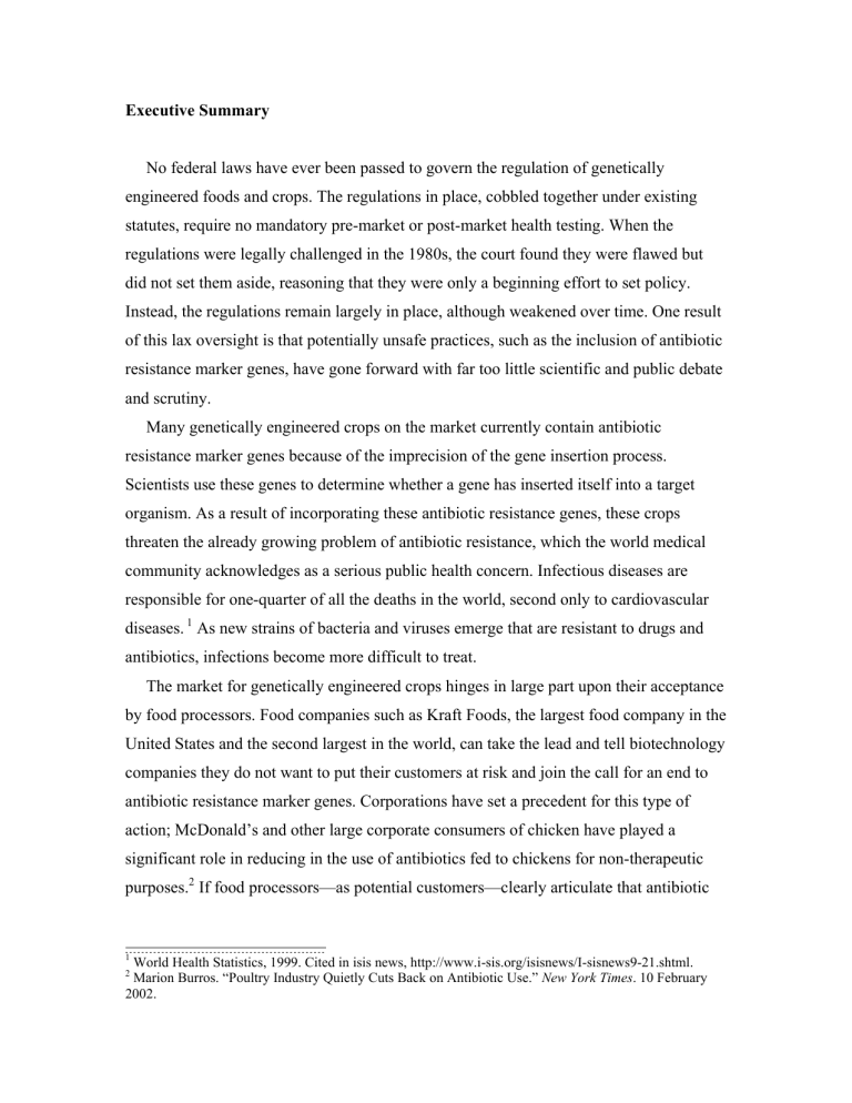 Executive Summary No federal laws have ever been passed to govern the regulation of genetically engineered foods and crops. The regulations in place, cobbled together under existing statutes, require no mandatory pre-market or post-market health testing. When the regulations were legally challenged in the 1980s, the court found they were flawed but did not set them aside, reasoning that they were only a beginning effort to set policy. Instead, the regulations remain largely in place, although weakened over time. One result of this lax oversight is that potentially unsafe practices, such as the inclusion of antibiotic resistance marker genes, have gone forward with far too little scientific and public debate and scrutiny. Many genetically engineered crops on the market currently contain antibiotic resistance marker genes because of the imprecision of the gene insertion process. Scientists use these genes to determine whether a gene has inserted itself into a target organism. As a result of incorporating these antibiotic resistance genes, these crops threaten the already growing problem of antibiotic resistance, which the world medical community acknowledges as a serious public health concern. Infectious diseases are responsible for one-quarter of all the deaths in the world, second only to cardiovascular diseases. 1 As new strains of bacteria and viruses emerge that are resistant to drugs and antibiotics, infections become more difficult to treat. The market for genetically engineered crops hinges in large part upon their acceptance by food processors. Food companies such as Kraft Foods, the largest food company in the United States and the second largest in the world, can take the lead and tell biotechnology companies they do not want to put their customers at risk and join the call for an end to antibiotic resistance marker genes. Corporations have set a precedent for this type of action; McDonald’s and other large corporate consumers of chicken have played a significant role in reducing in the use of antibiotics fed to chickens for non-therapeutic purposes.2 If food processors—as potential customers—clearly articulate that antibiotic 1 World Health Statistics, 1999. Cited in isis news, http://www.i-sis.org/isisnews/I-sisnews9-21.shtml. Marion Burros. “Poultry Industry Quietly Cuts Back on Antibiotic Use.” New York Times. 10 February 2002. 2 resistance marker genes are unacceptable, manufacturers will have no incentive to continue their use. Antibiotic resistance marker genes are just one example of how genetically engineered crops should be better regulated, so that products that should never make it to market do not, and so that health concerns are addressed before – and not after – products are commercialized. In order to accomplish this goal with regards to antibiotic resistance marker genes, products on the market with them should be removed, and no new products should be approved that contain antibiotic resistance marker genes. In addition, the State Public Interest Research Groups, along with our coalition partners in Genetically Engineered Food Alert, have issued the following call to action: Genetically engineered food ingredients or crops should not be allowed on the market unless: 1) Independent safety testing demonstrates they have no harmful effects on human health or the environment, 2) They are labeled to ensure the consumer's right-to-know, and 3) The biotechnology corporations that manufacture them are held responsible for any harm. I. Introduction Genetically engineered crops have hit the market in a legislative vacuum. The U.S. Congress has never passed any law that specifically regulates this radical new technology. In the absence of any directly relevant legislation, federal agencies created a regulatory framework for genetically engineered crops that was tucked into existing statutes not designed to handle genetically engineered crops and thus in many ways inappropriate. The framework for how to handle these new plants, focused largely on the United States Department of Agriculture (USDA), Environmental Protection Agency (EPA), and Food and Drug Administration (FDA), was flawed from its inception. In a public interest legal challenge to the framework in the late 1980s that sought to set it aside, 1 the U.S. District Court for the District of Columbia decided that, although the regulatory framework “is not a model of clarity,” it would stand because it was “merely a first effort to aid in the formulation of agency policy.” Yet the FDA, EPA, and USDA have barely revisited their regulations, except perhaps to weaken them. That proponents of genetically engineered crops have asked for and received selfpolicing status on essentially all aspects of genetically engineered crops is a fact that is not in dispute. Even proponents of genetically engineered crops acknowledge that industry has charted its own course. Industry has exerted tremendous influence on the executive branch where, as the former head of biotechnology issues at the Food and Drug Administration acknowledged, the “U.S. government agencies have done exactly what big agribusiness has asked them to do and told them to do.”2 Industry has also accomplished this feat in part by giving generous campaign contributions to members of Congress.3 One result of this lax oversight is that potentially unsafe practices, such as the inclusion of antibiotic resistance marker genes, have gone forward with far too little scientific and public debate and scrutiny. II. What are antibiotic resistance marker genes, and why are they used? 1 Foundation on Economic Trends v. Johnson, 661 F. Supp. 107, 109 (D.D.C. 1986). Kurt Eichenwald. “Biotechnology Food: From the Lab to a Debacle.” New York Times. 25 January 2001. 3 “Brave New Farm: The Battle Over Genetically-Altered Food.” Center for Responsive Politics. Accessed at: <http://www.opensecrets.org/alerts/v5/alertv5_34.asp> on 28 January 2002. 2 The